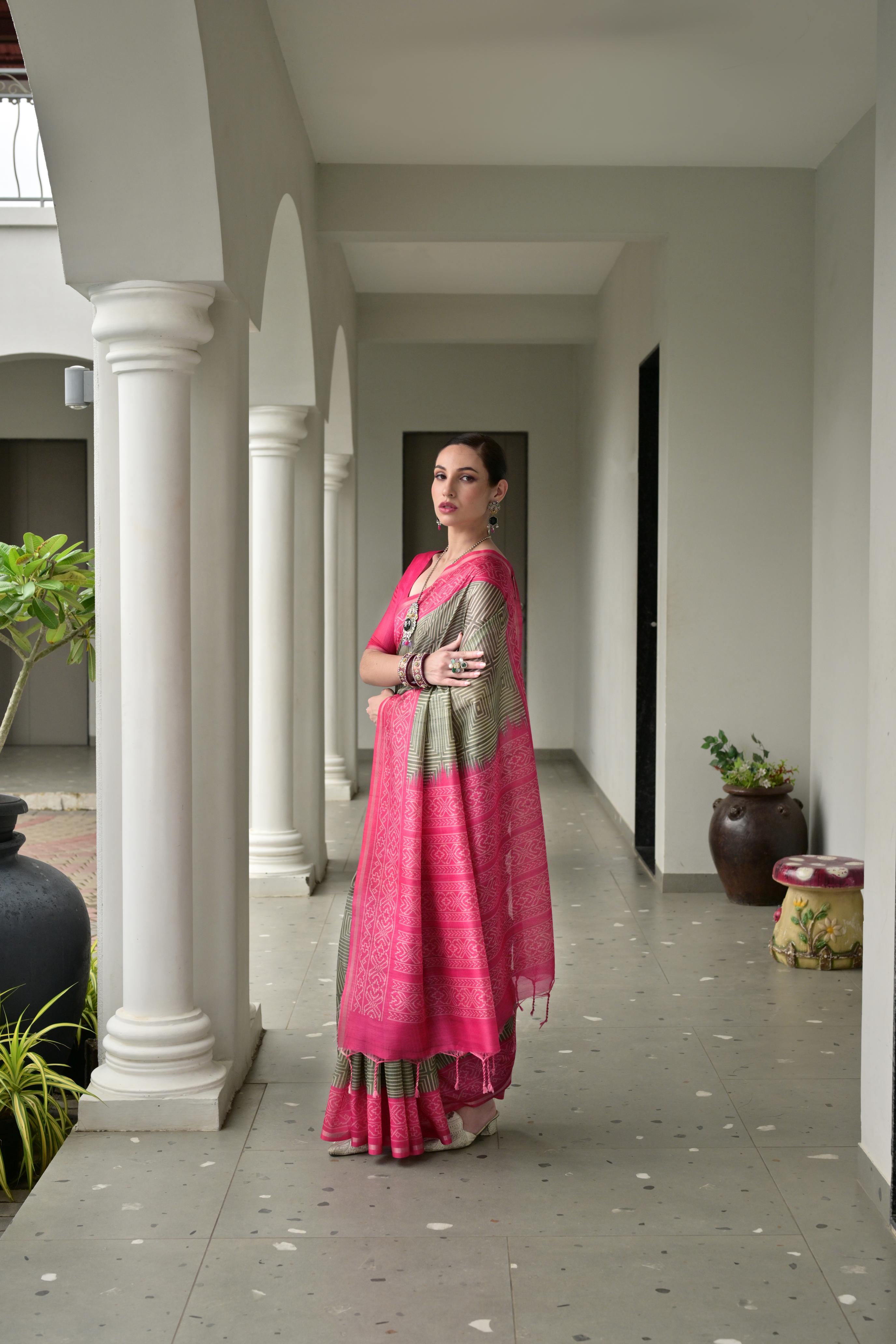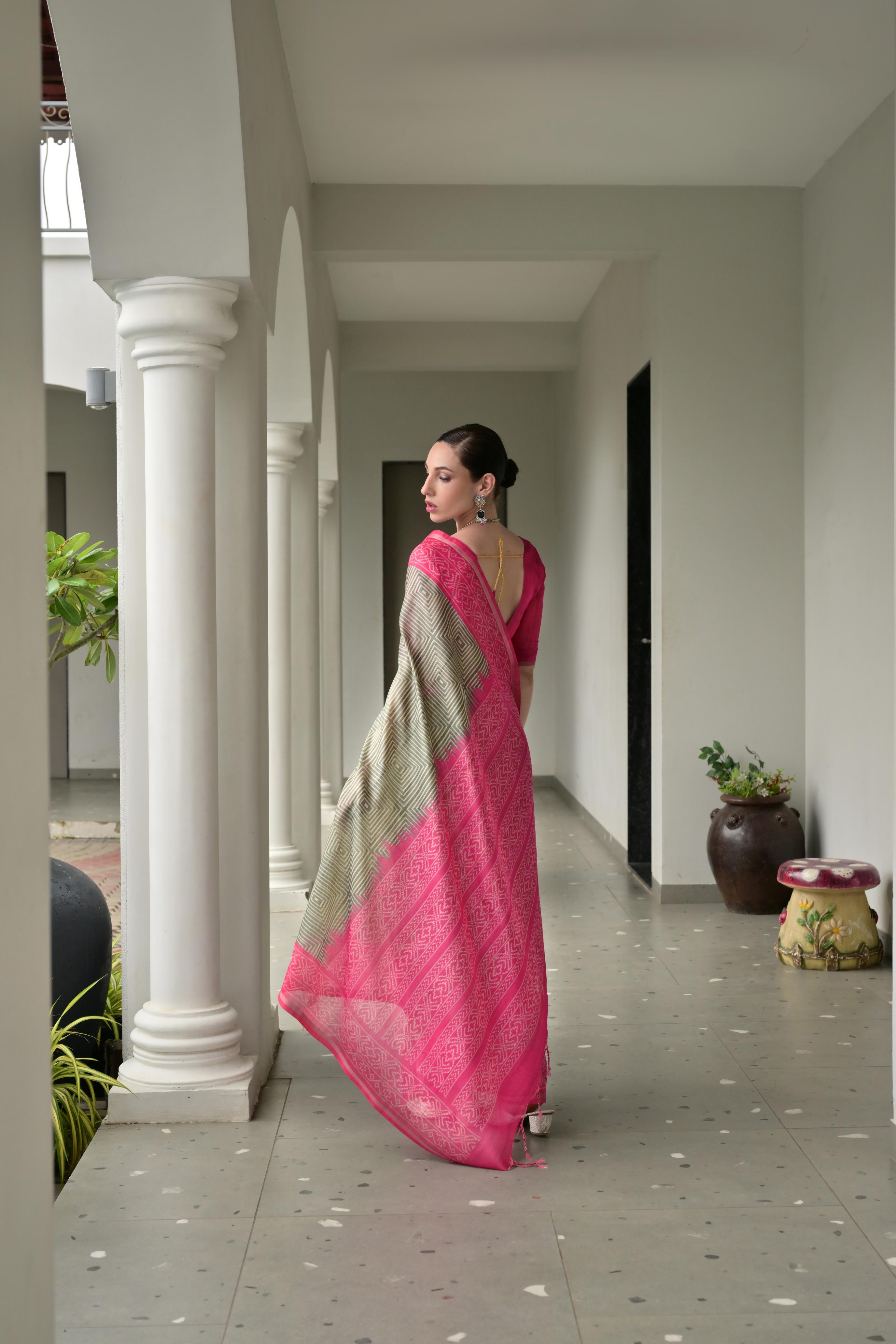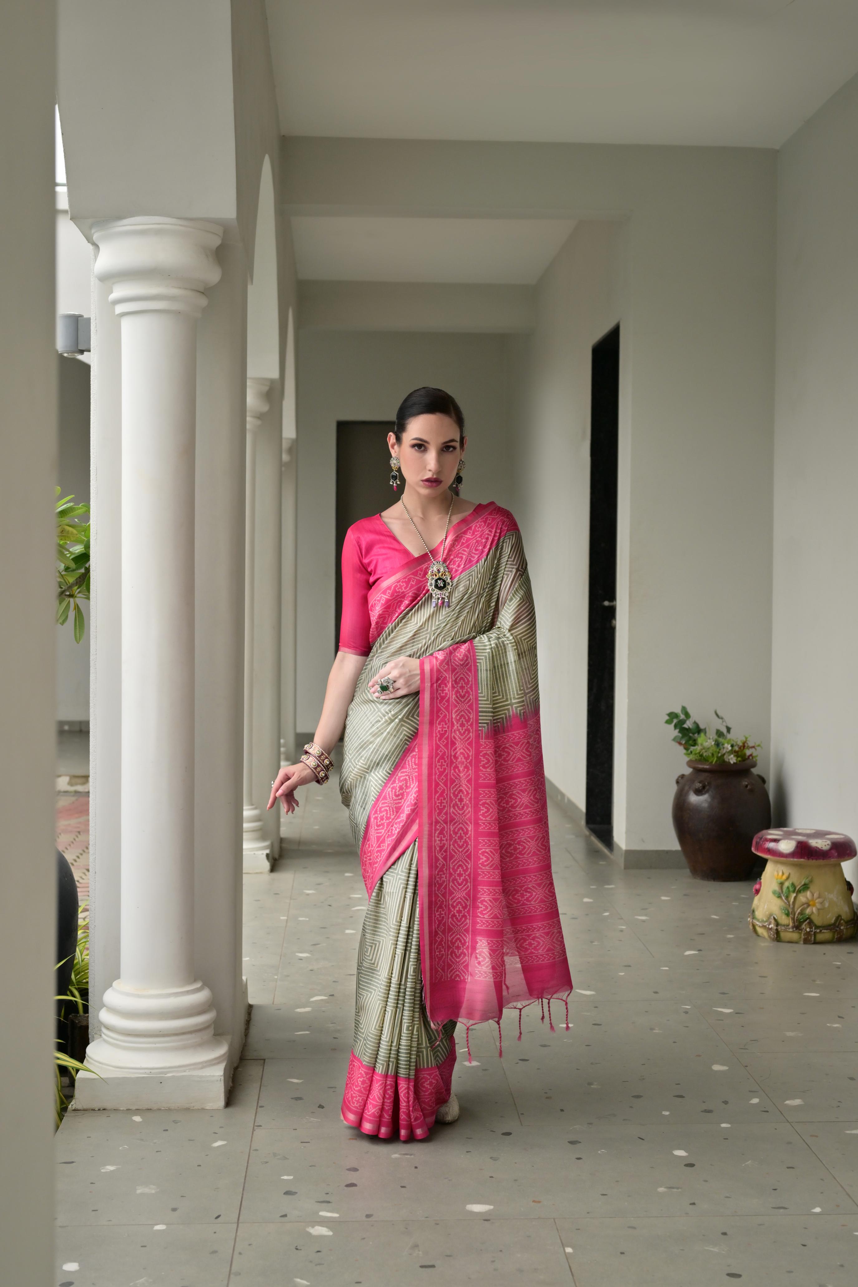Grey Color Tussar Silk Fabric Ikkat Printed Traditional Ethnic Saree