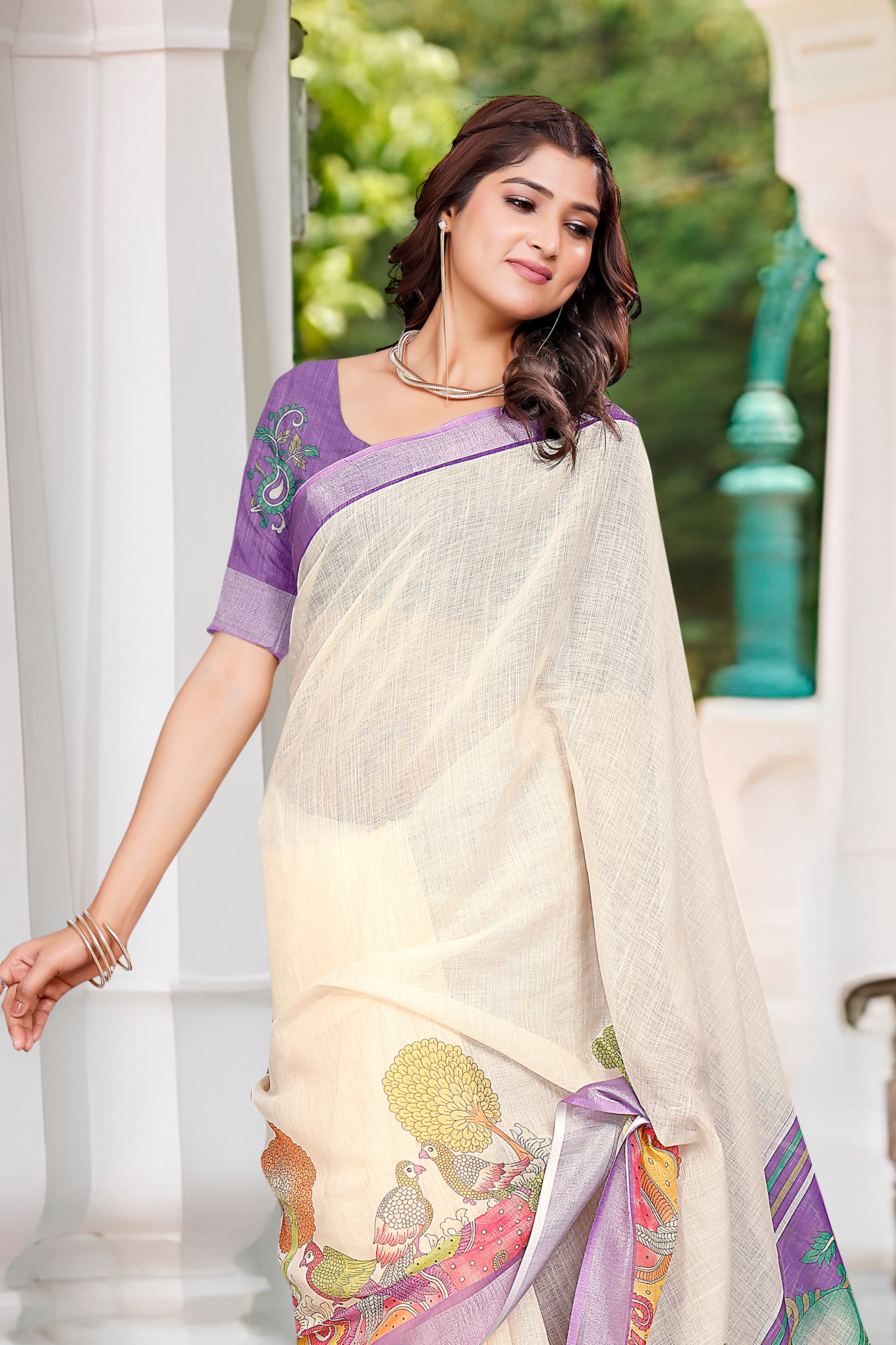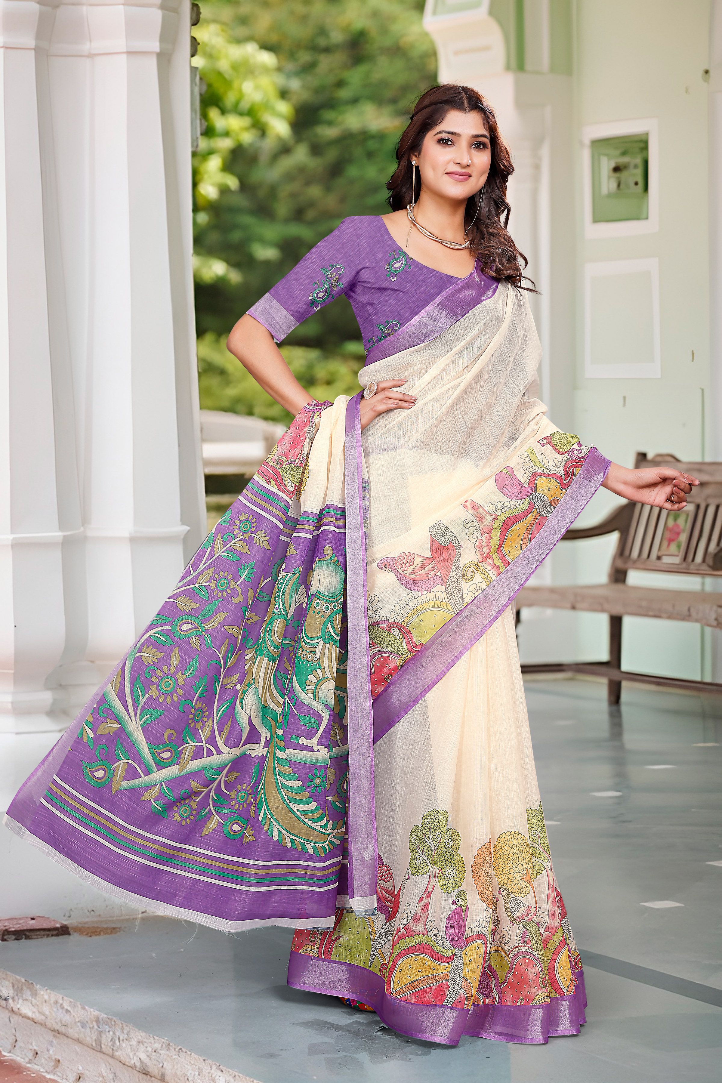 Lavender Color Linen Cotton Saree With Smart Partywear Printed Looks