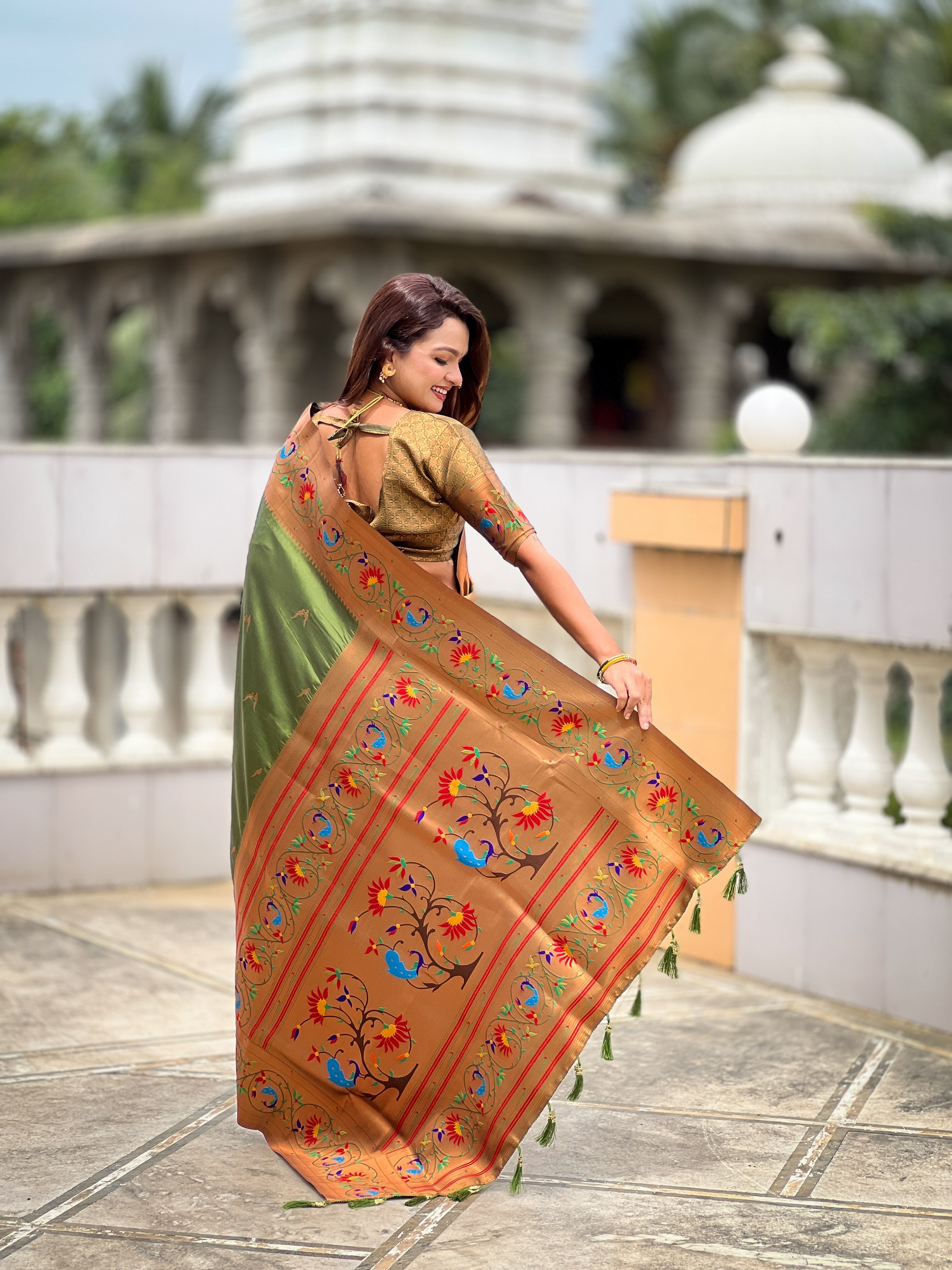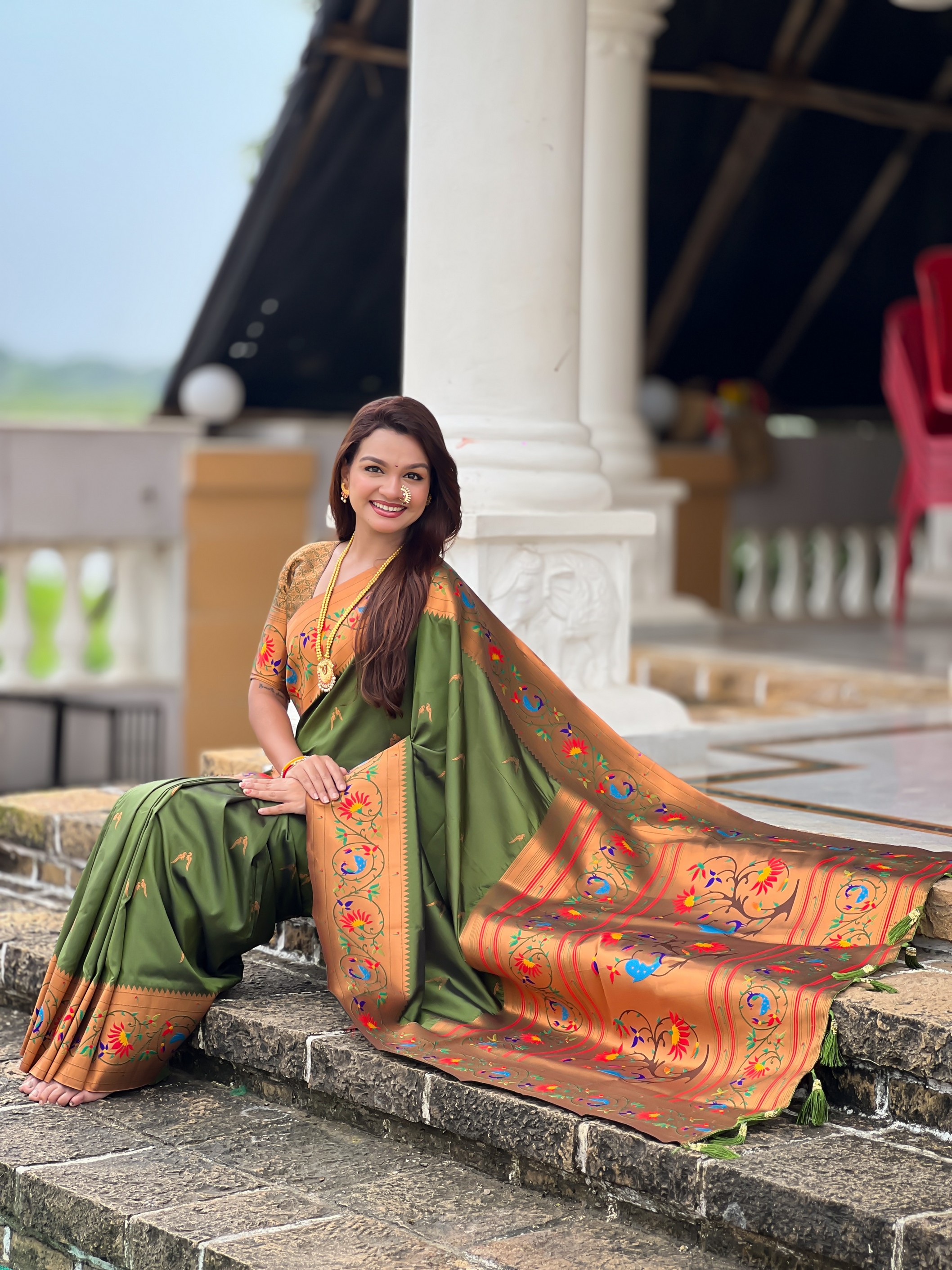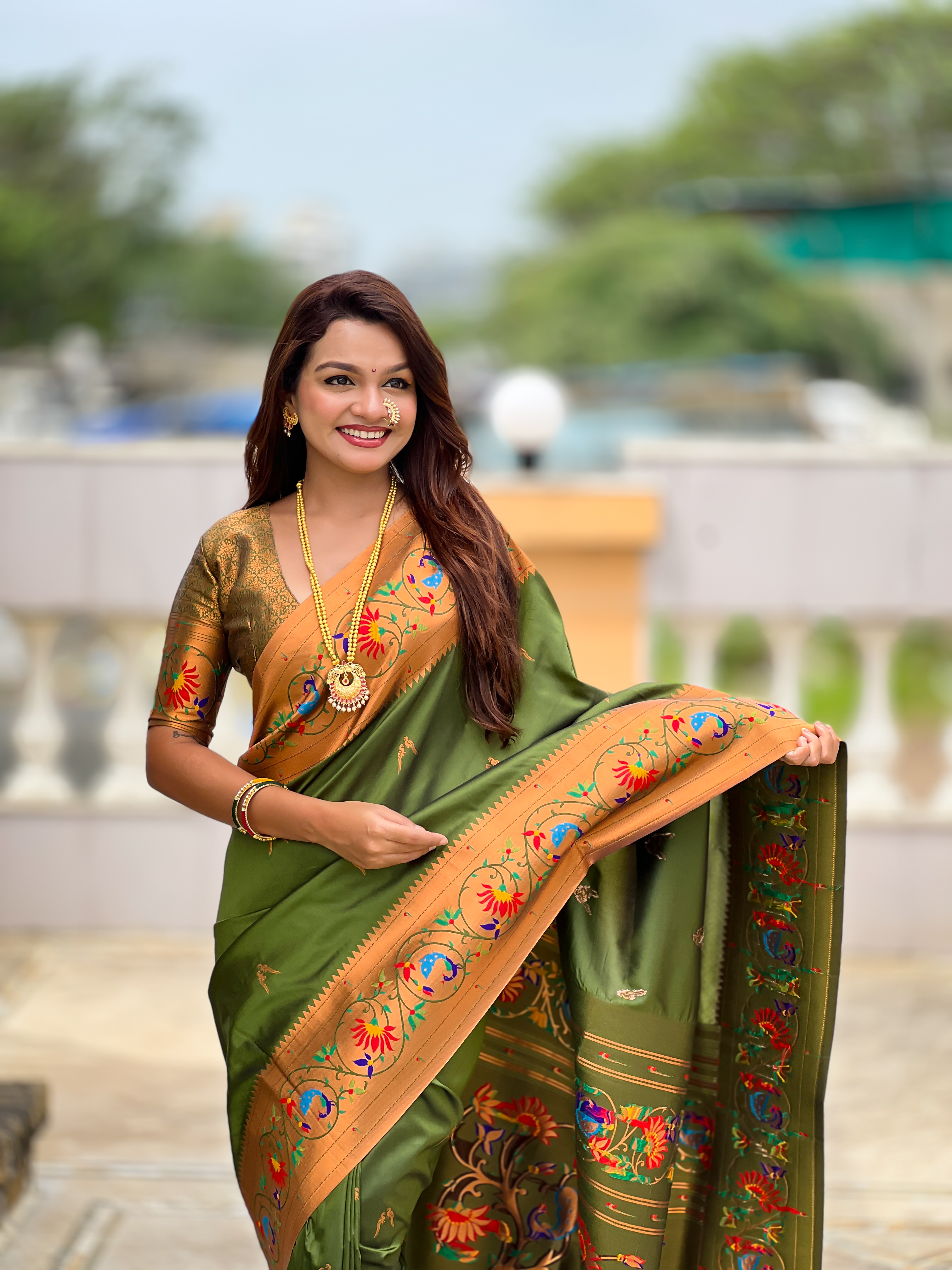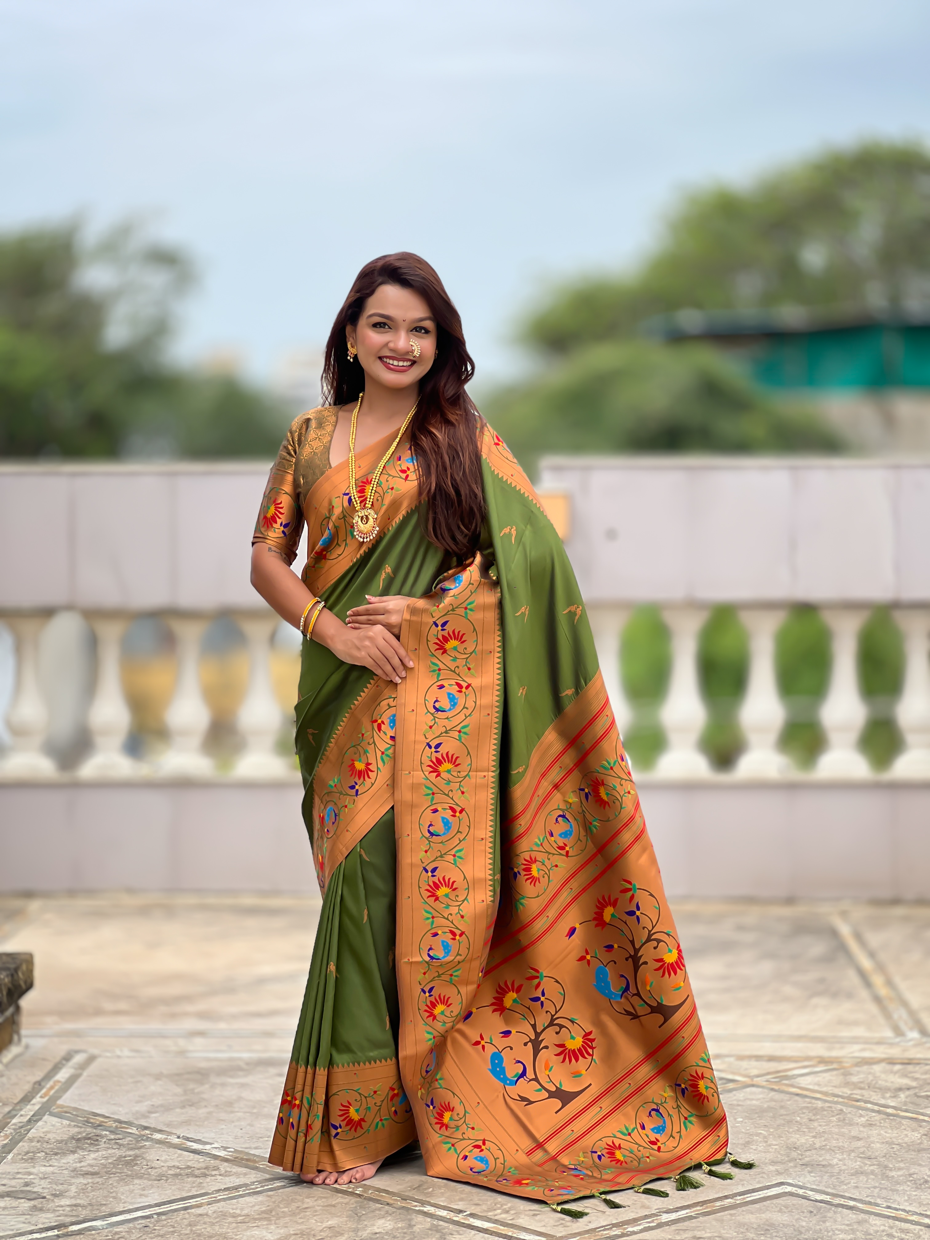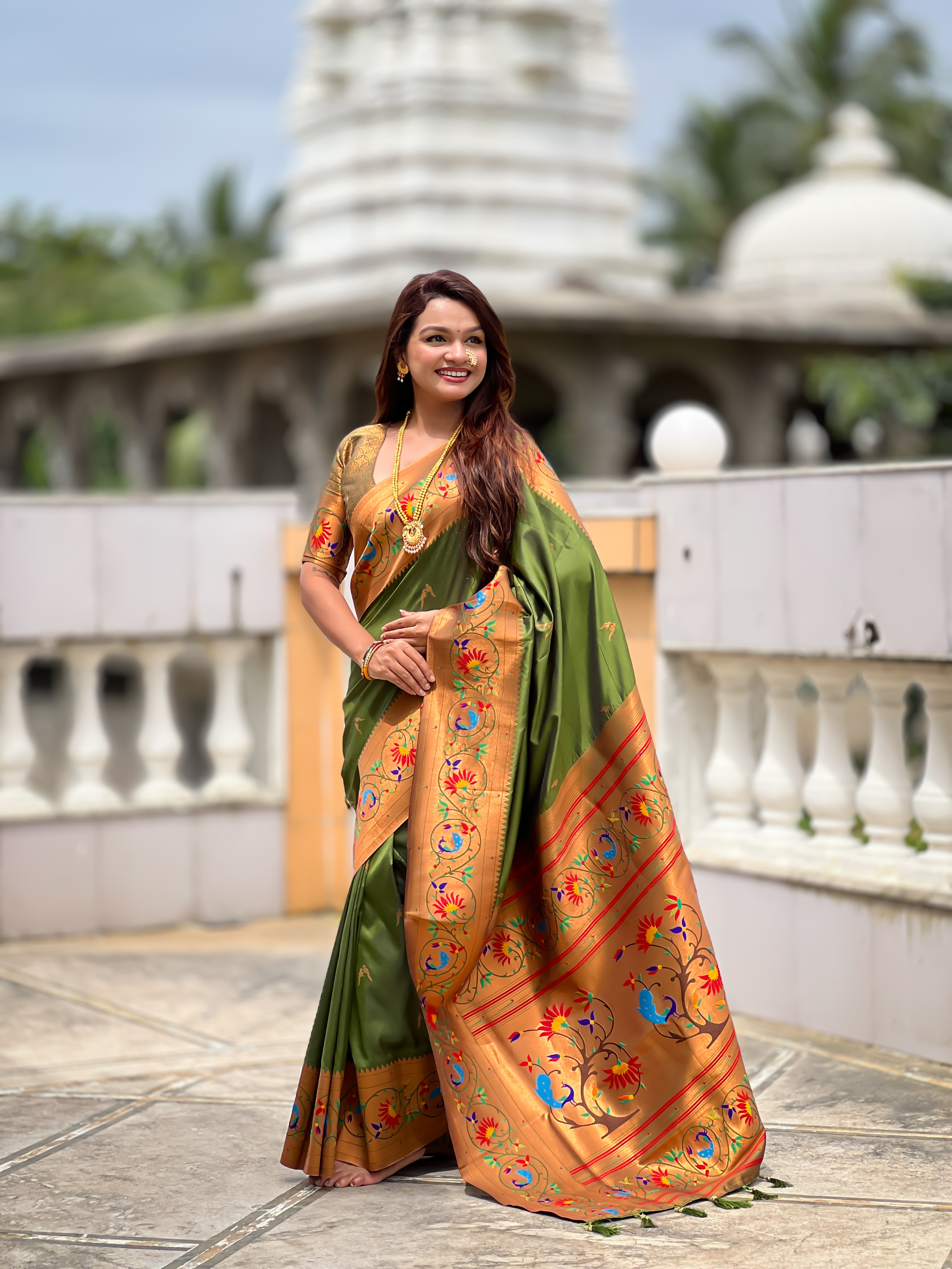 Mahendi Color Paithani Silk Fabric Woven Meenakari Jacquard Designer Graceful Wedding Saree
