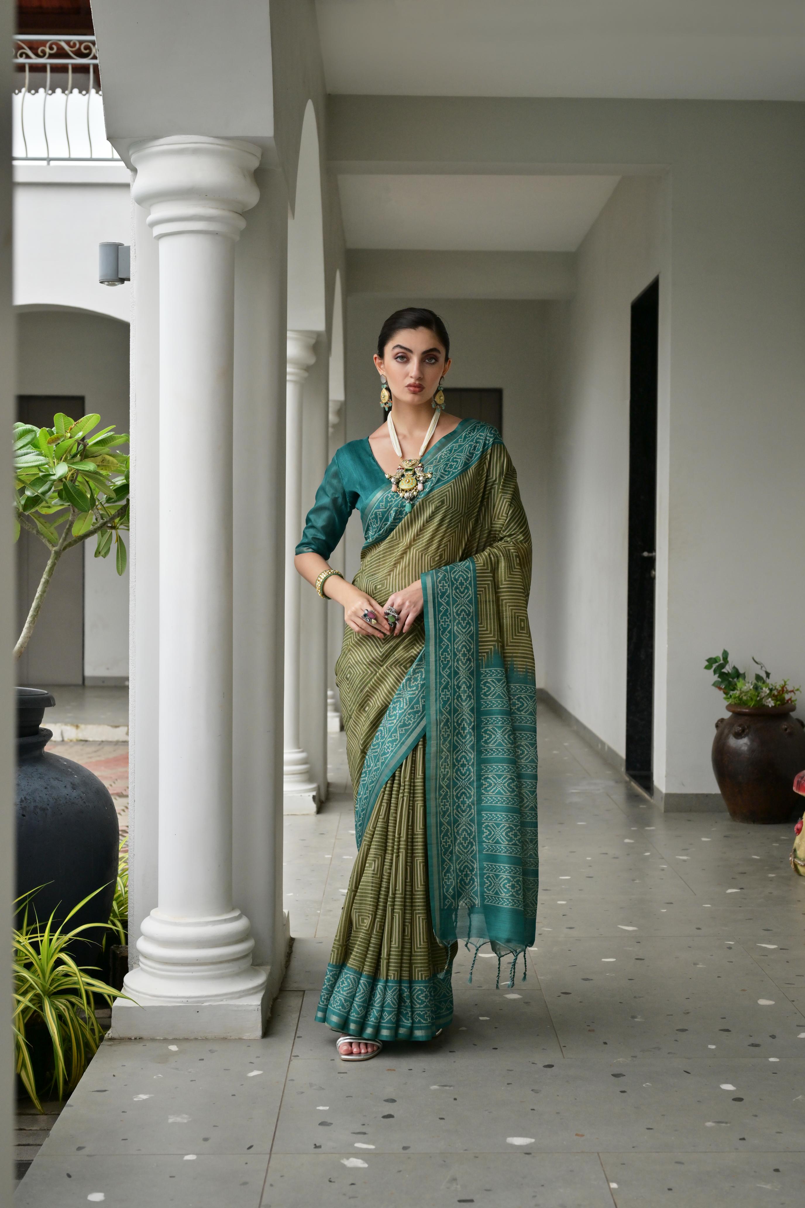 Mahendi Color Tussar Silk Fabric Ikkat Printed Traditional Ethnic Saree