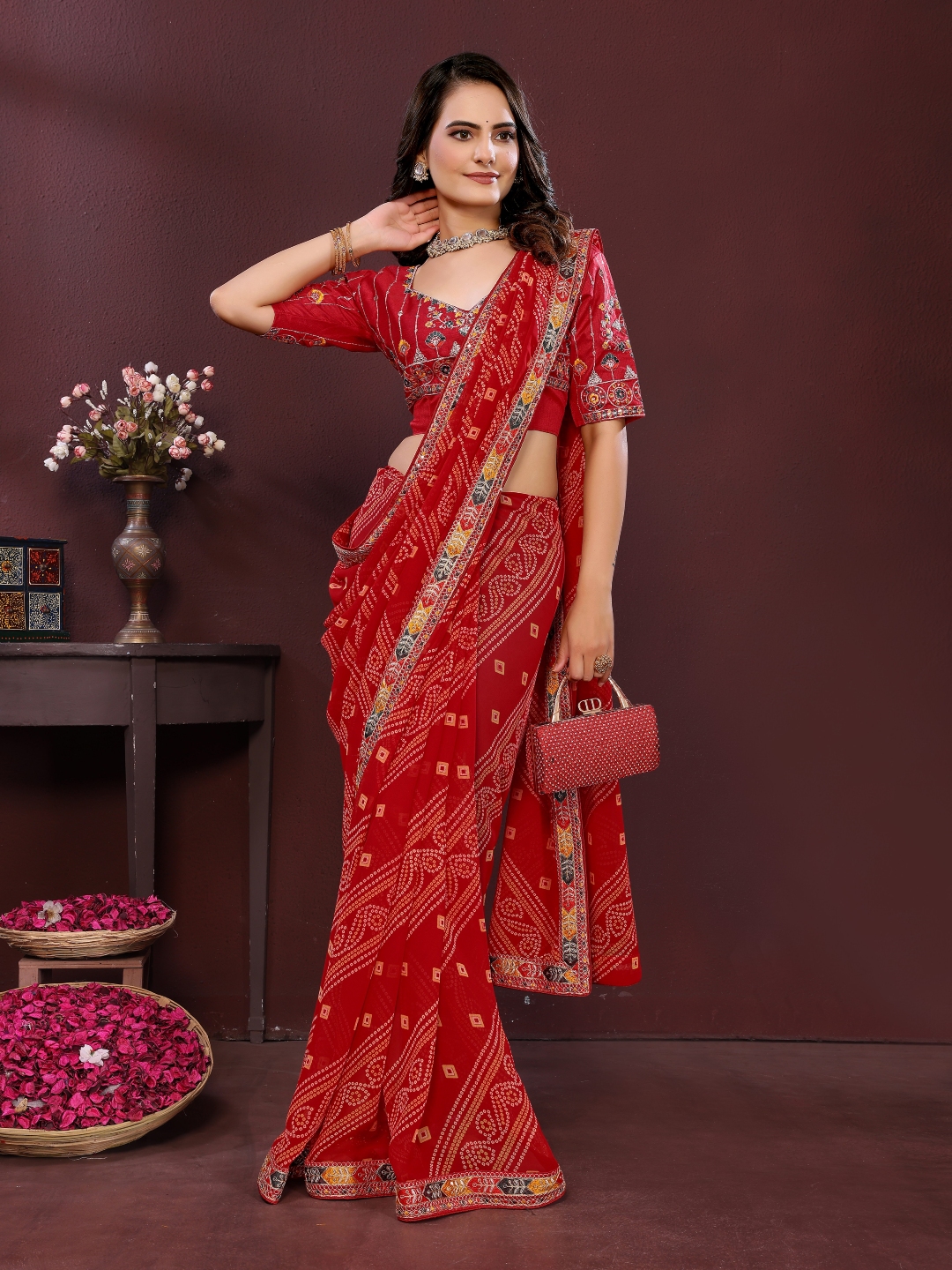 Maroon Color Georgette Fabric Bandhej Printed Traditional Saree