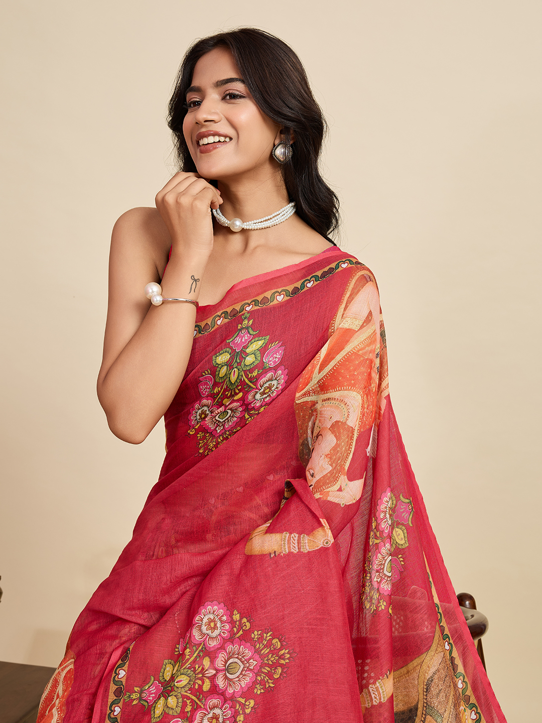 Maroon Color Linen Fabric Beautiful Printed Ceremonial Saree
