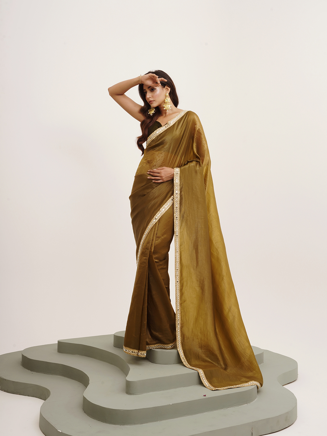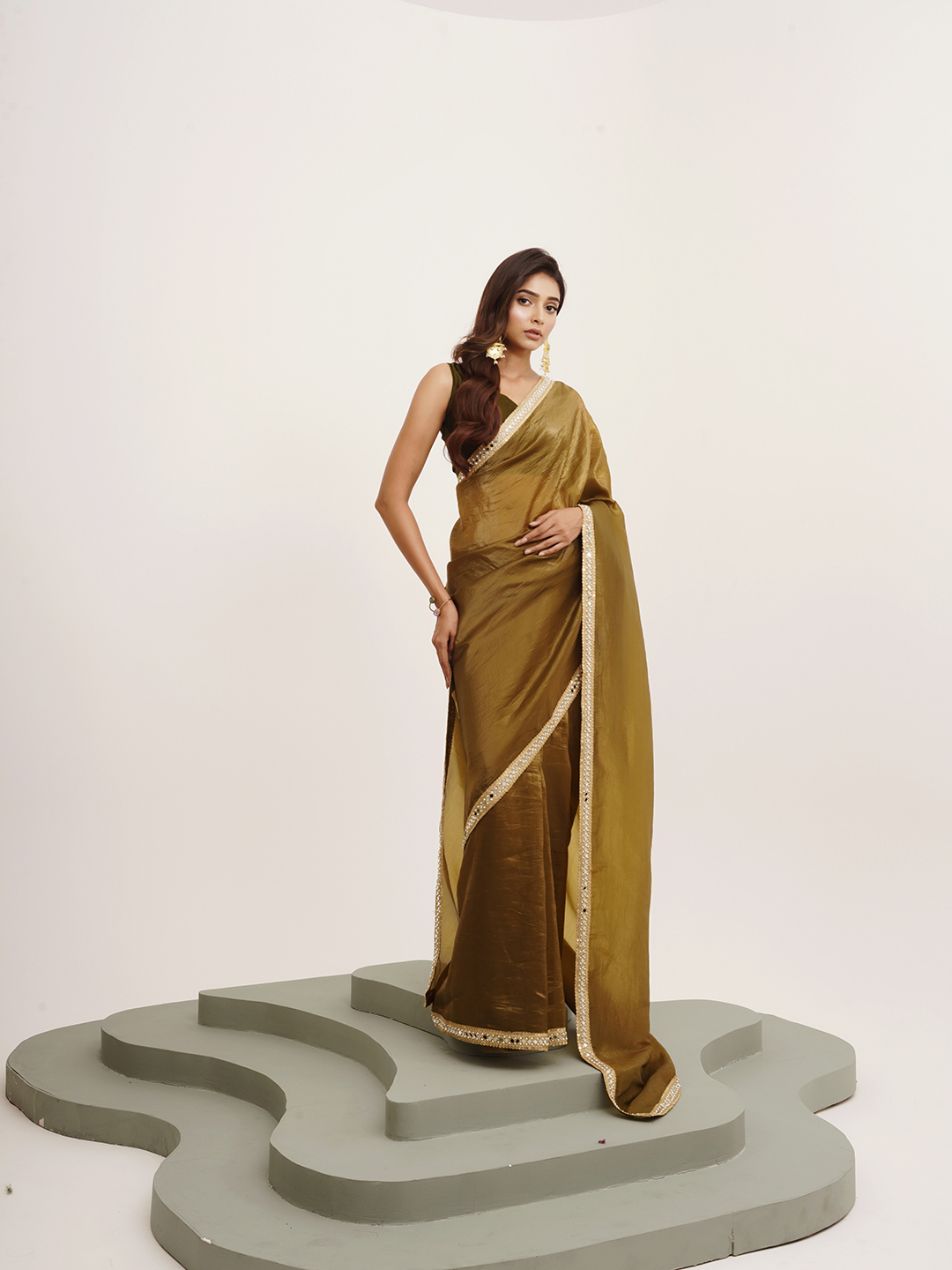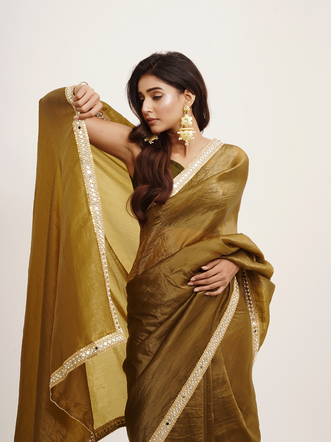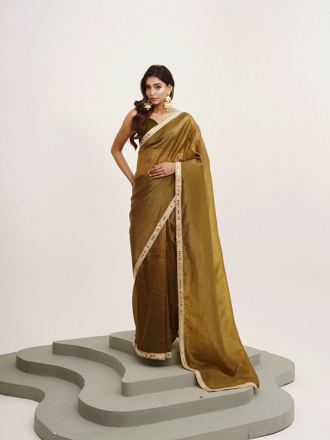 Mirror Work Embellished Mehandi Green Color Tissue Fabric Rich Ceremonial Saree