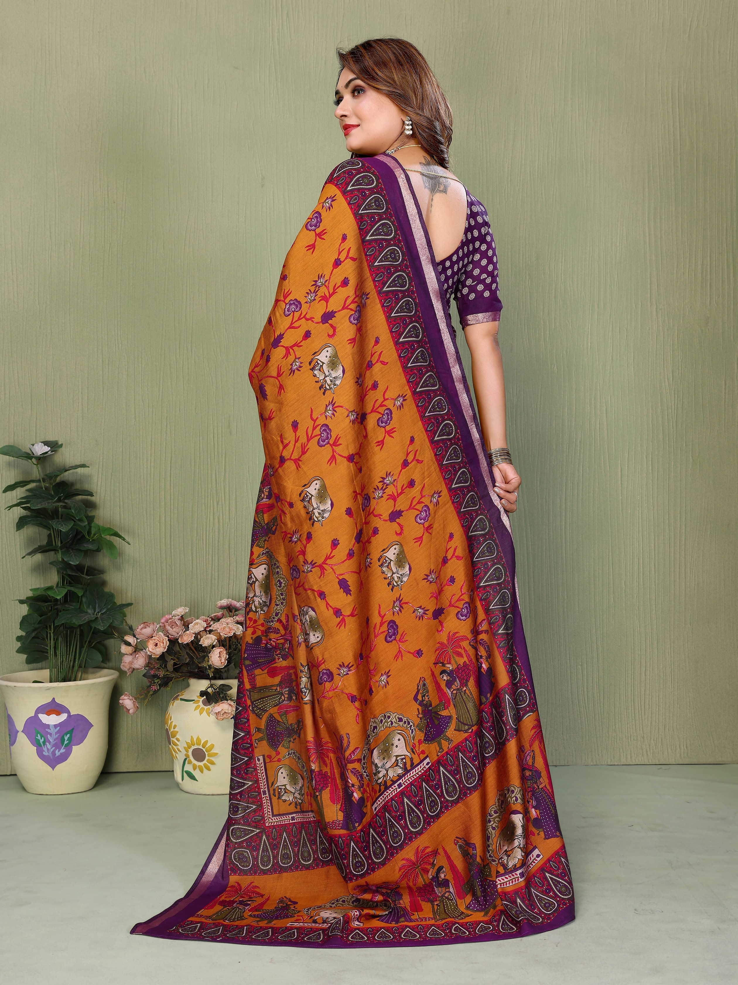Mustard Color Mul Cotton Designer Kalamkari Printed Ethnic Partywear Saree