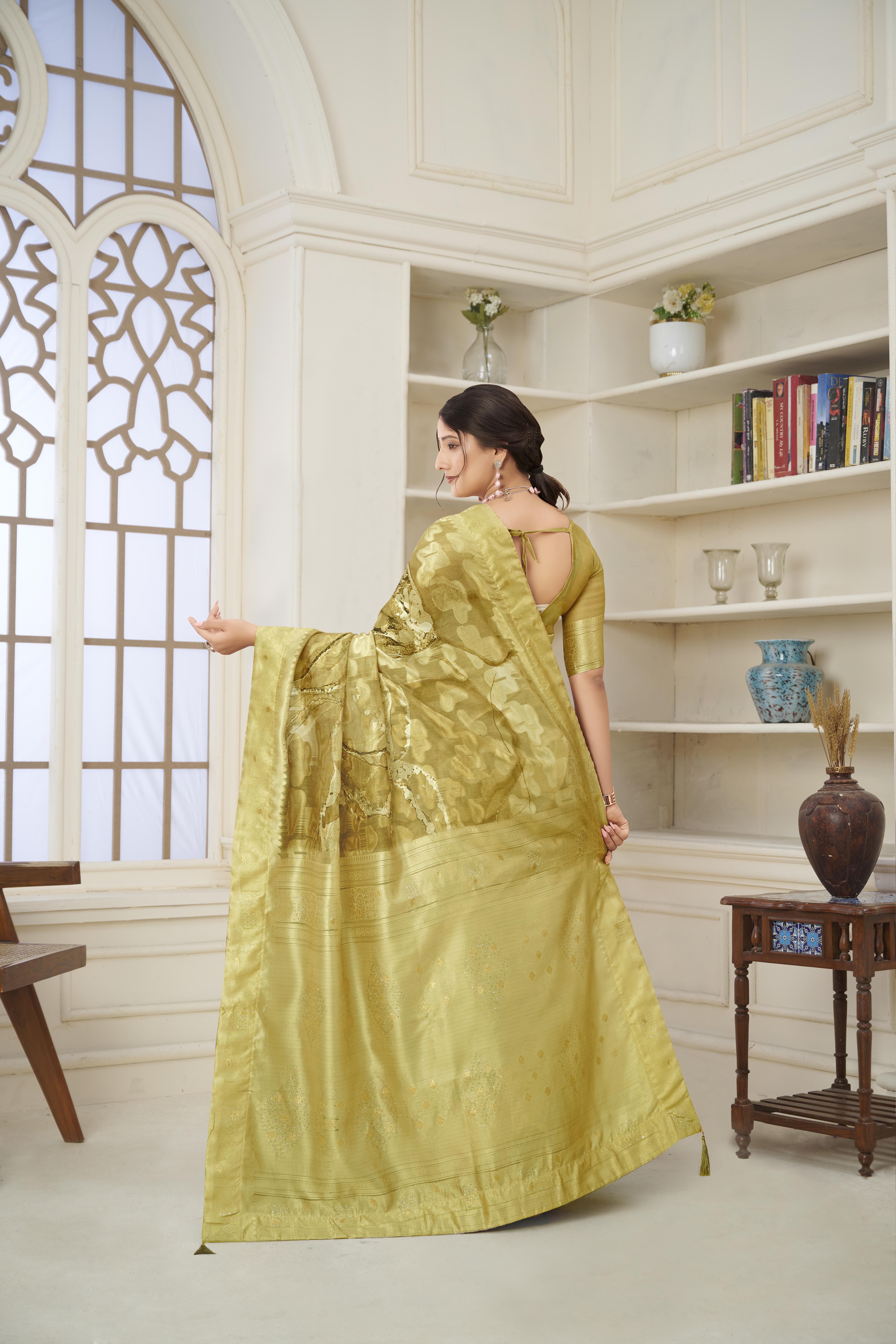 Mustard Color Wevon Jacquard Designer With Printed Rich Silk Fabric Stylish Ceremonial Saree