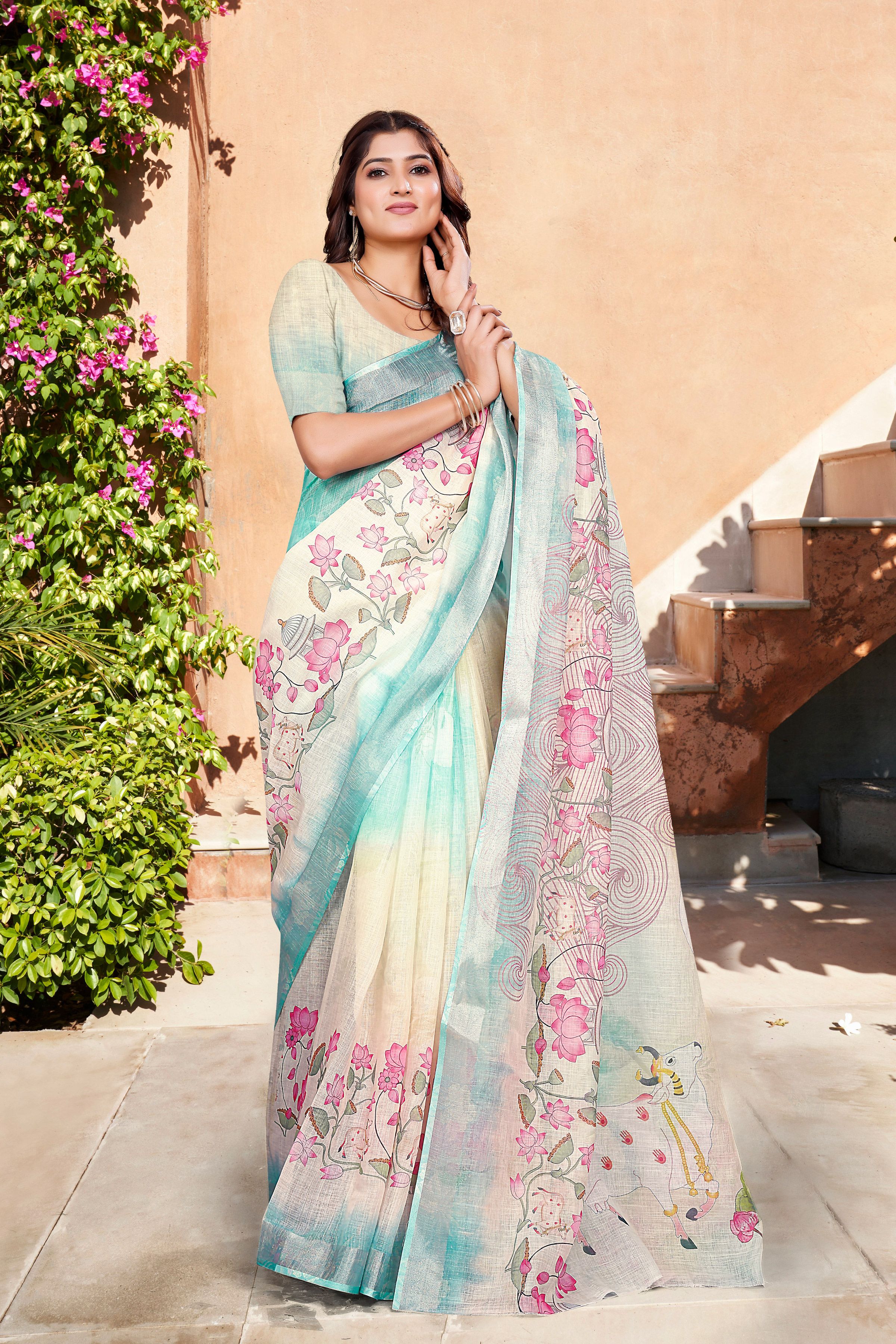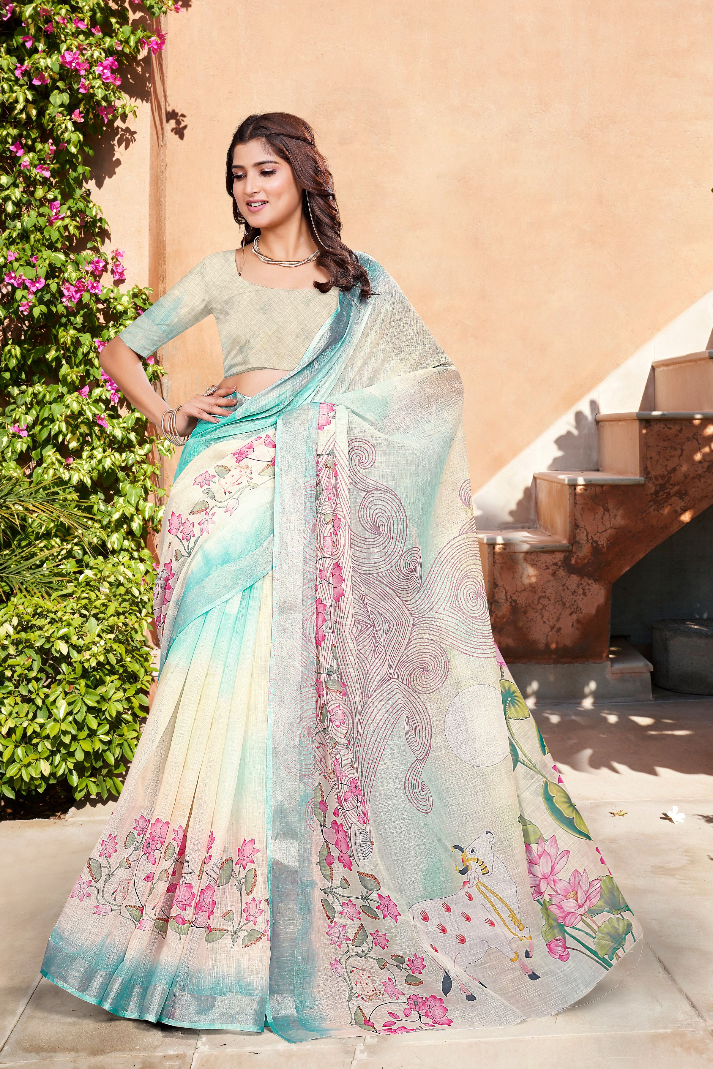 Garb These Festive Saree in Fine Colored.These Saree Are Linen Cotton And Blouse is Fabricated On Linen Cotton Pair.Its Beautified With Wevon Jari Border With Designer Digital Printed.