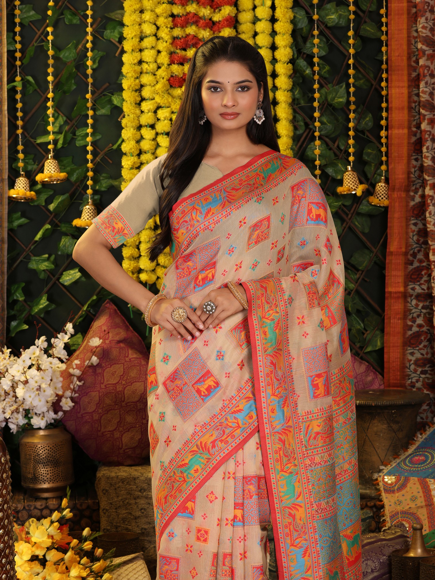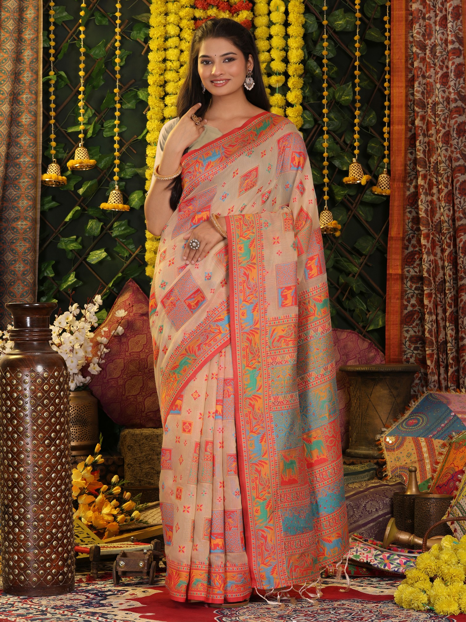 Off White Color Linen Cotton Fabric Resham Woven Designer Partywear Saree