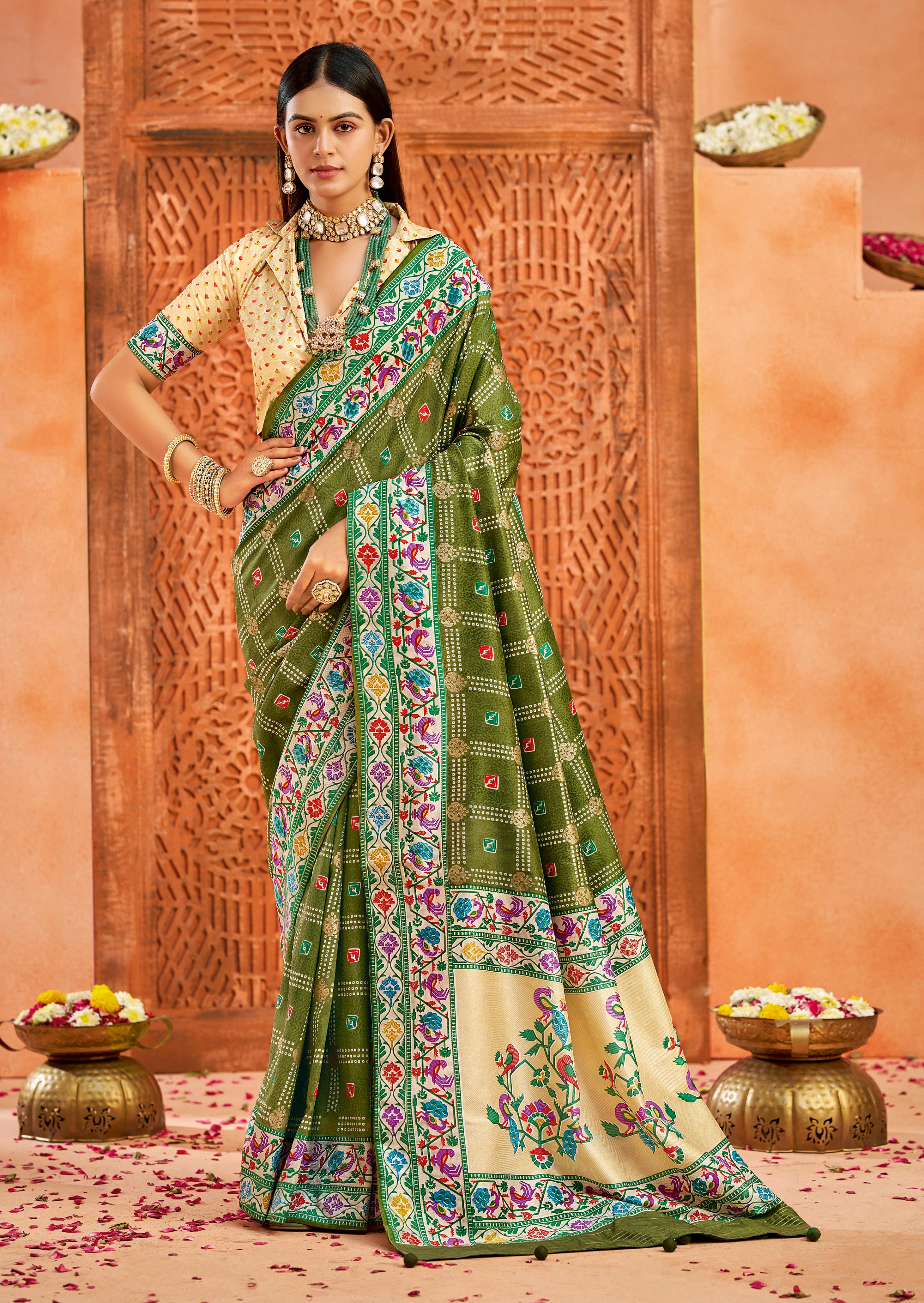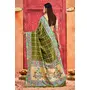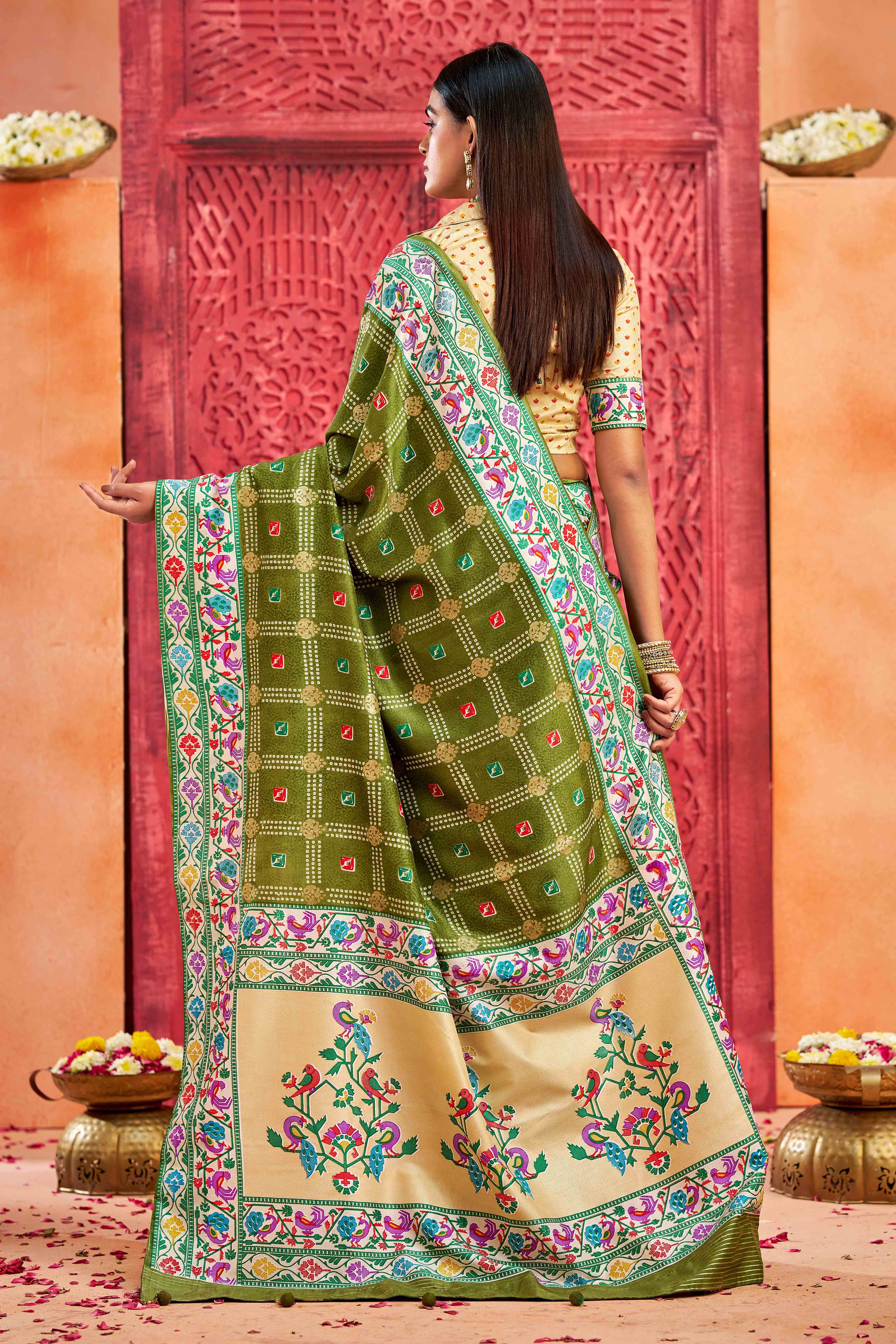 Olive Green Color Velvet Tussar Silk Fabric Partywear Saree With Paithani Pallu And Traditional Ghatchola Print