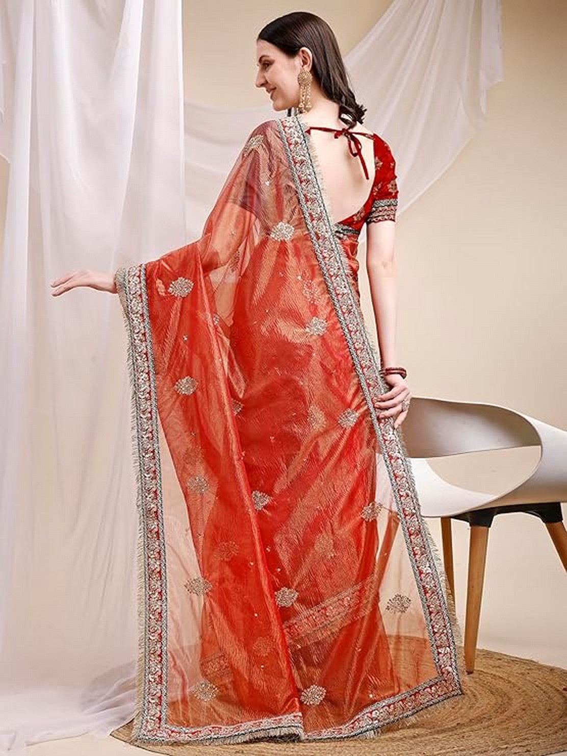 Orange Color Banarasi Crush Fabric Ethnic Embroidered Partywear Saree