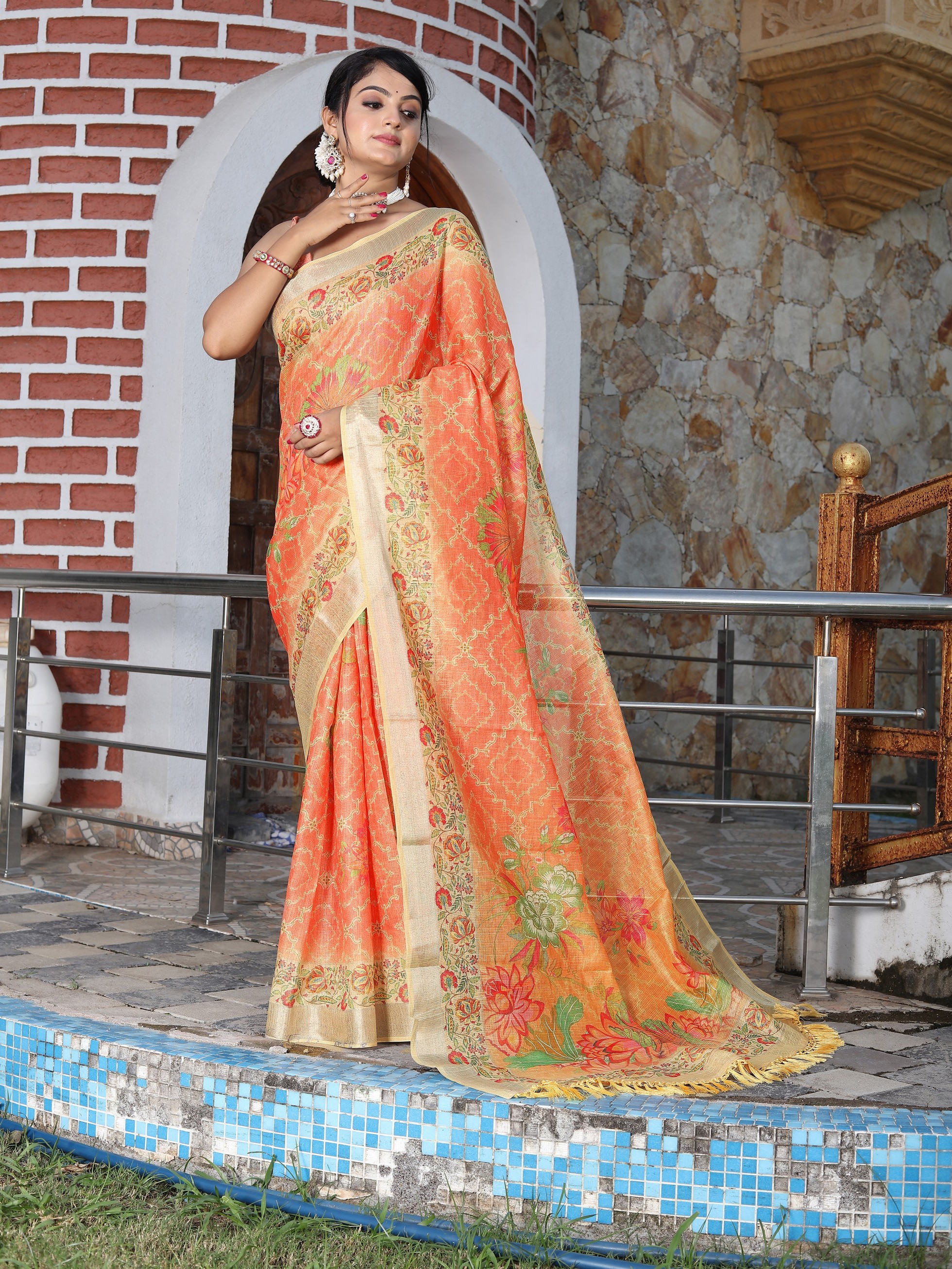 Orange Color Cotton Shimmer Fabric Smart Printed Saree With Woven Border