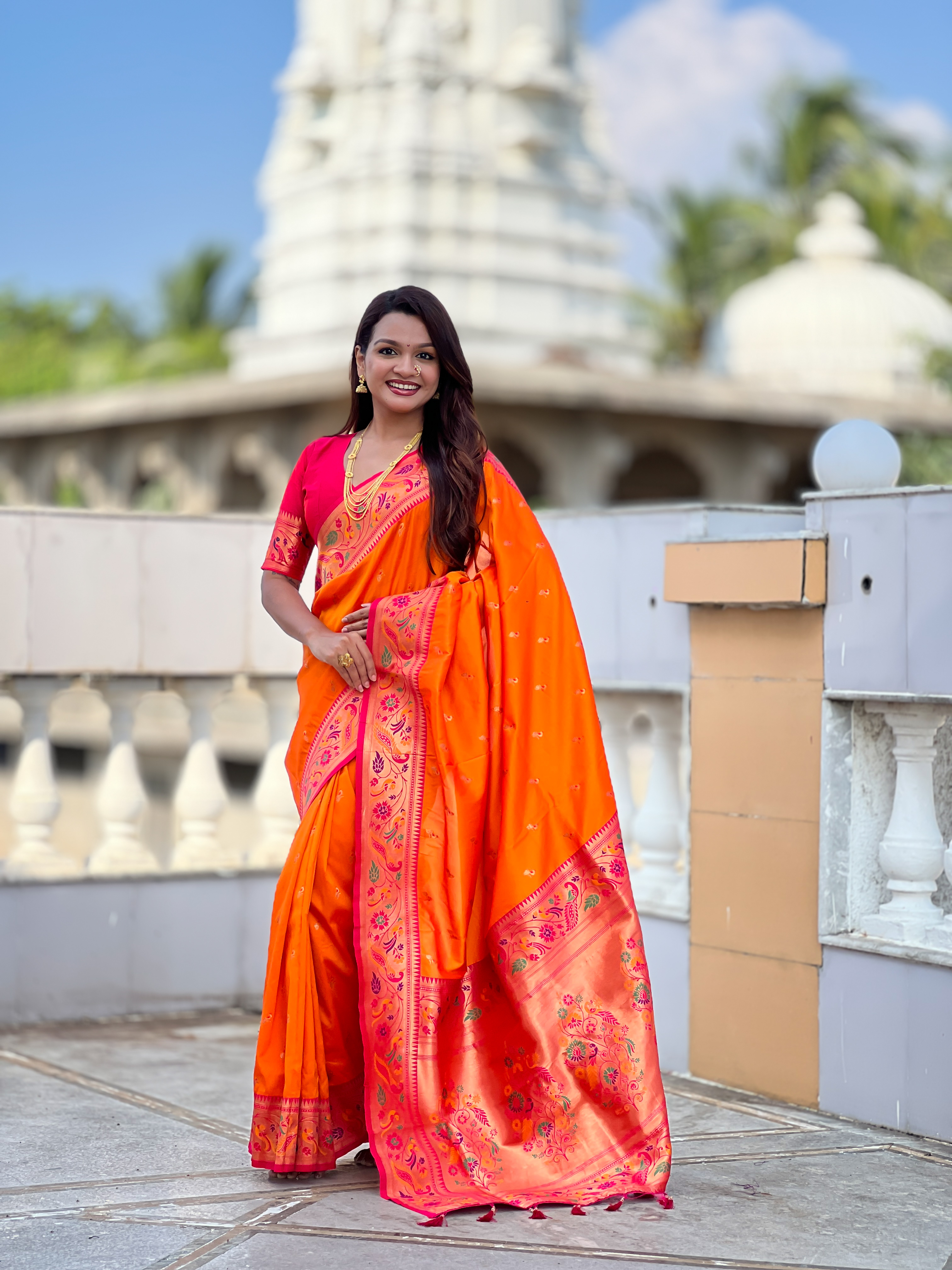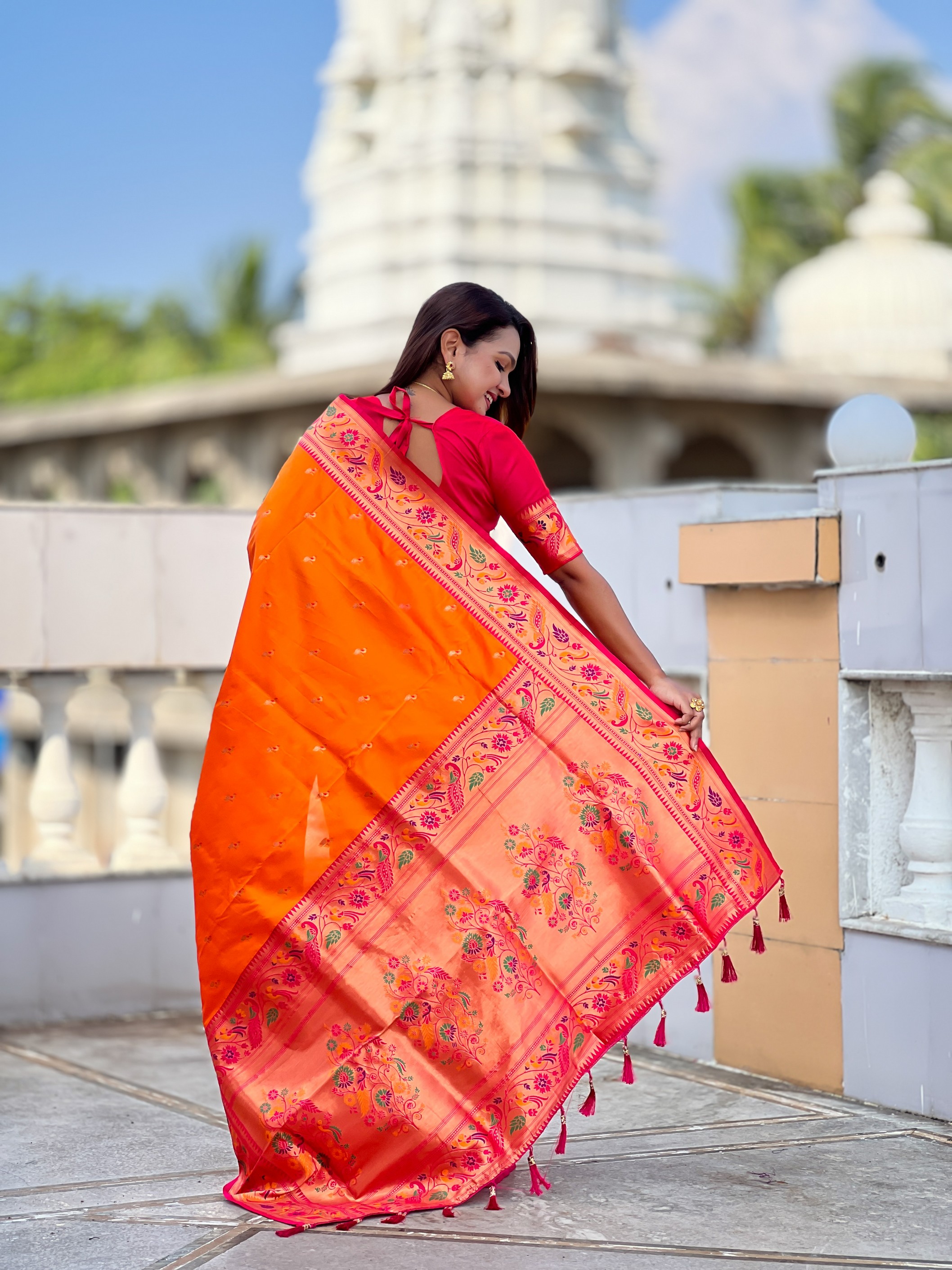 Orange Color Paithani Silk Fabric Woven Meenakari Jacquard Designer Saree