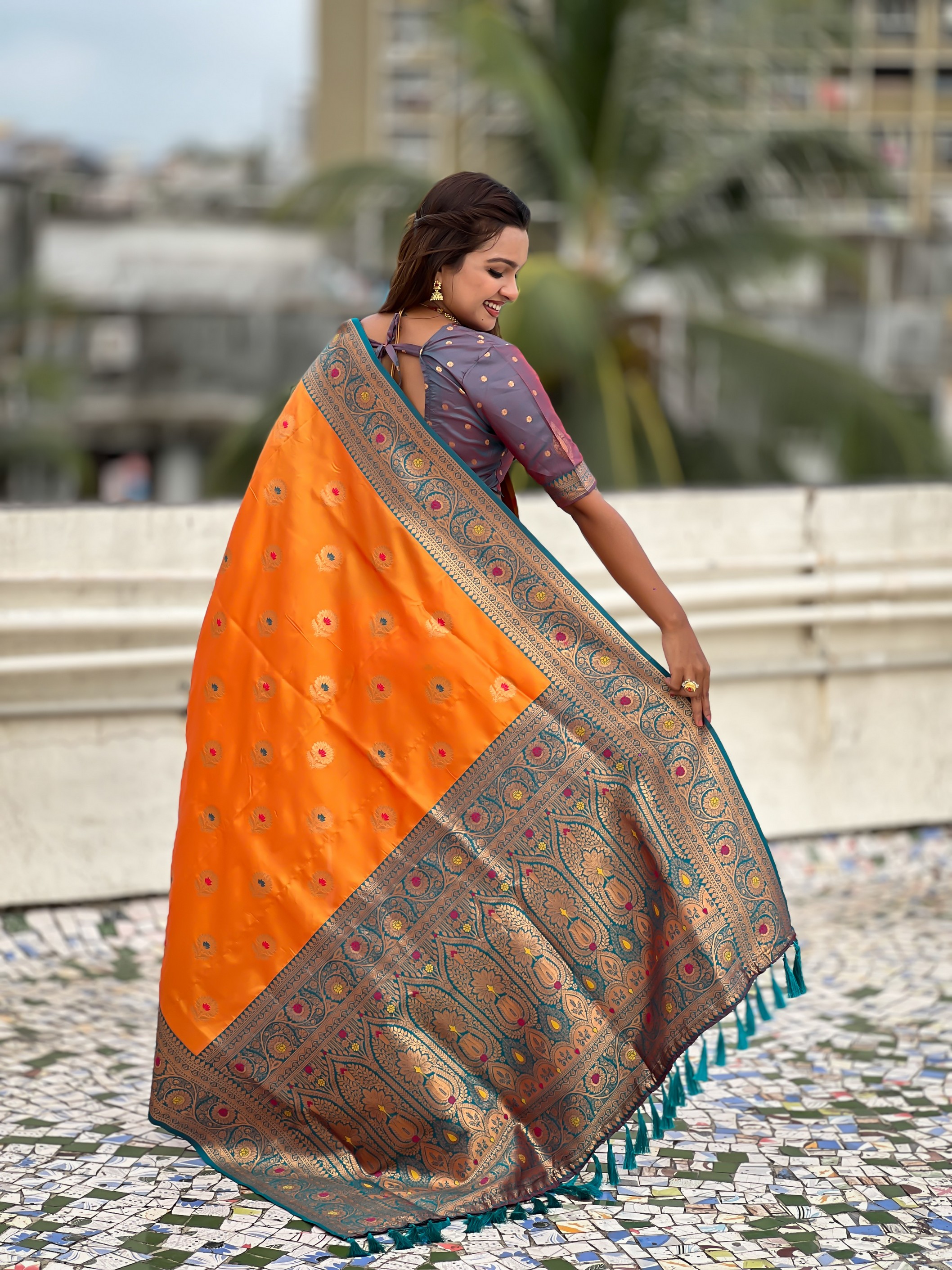Orange Color Soft Silk Fabric Wevon Meenakari Designer Trending Partywear Saree