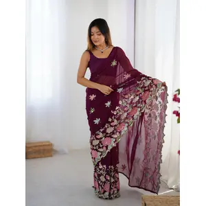 Wine Color Floral Embroidered Sequins...
