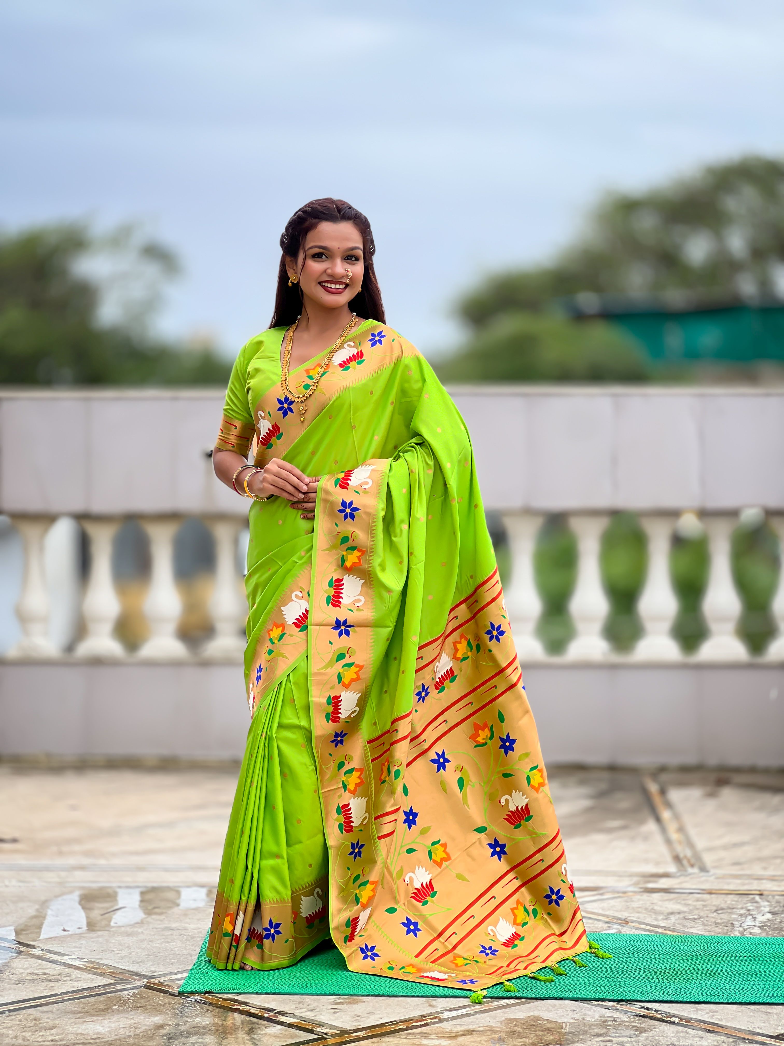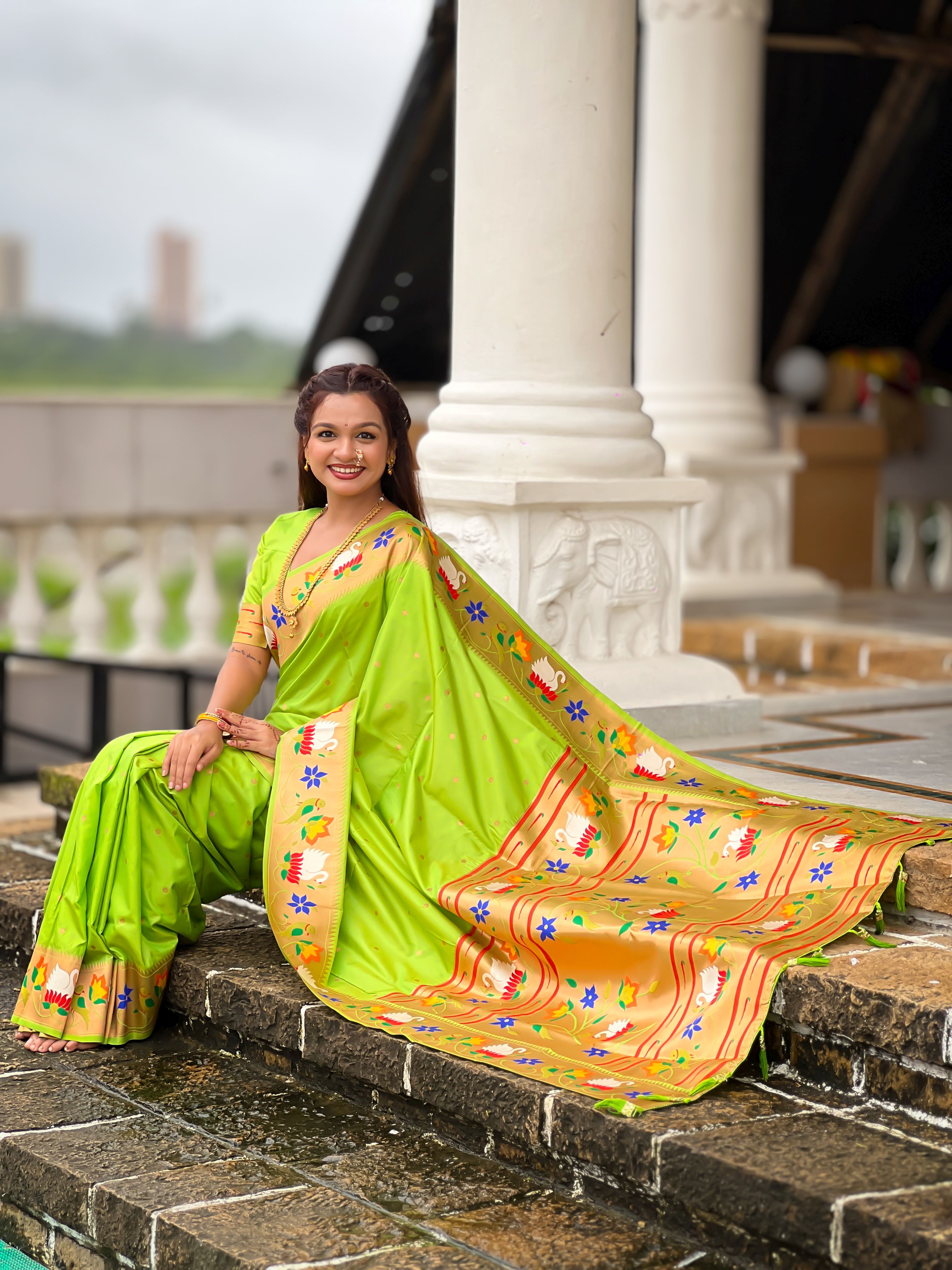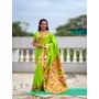 Parrot Green Color Paithani Silk Woven Meenakari Jacquard Designer Heavy Wedding Special Saree