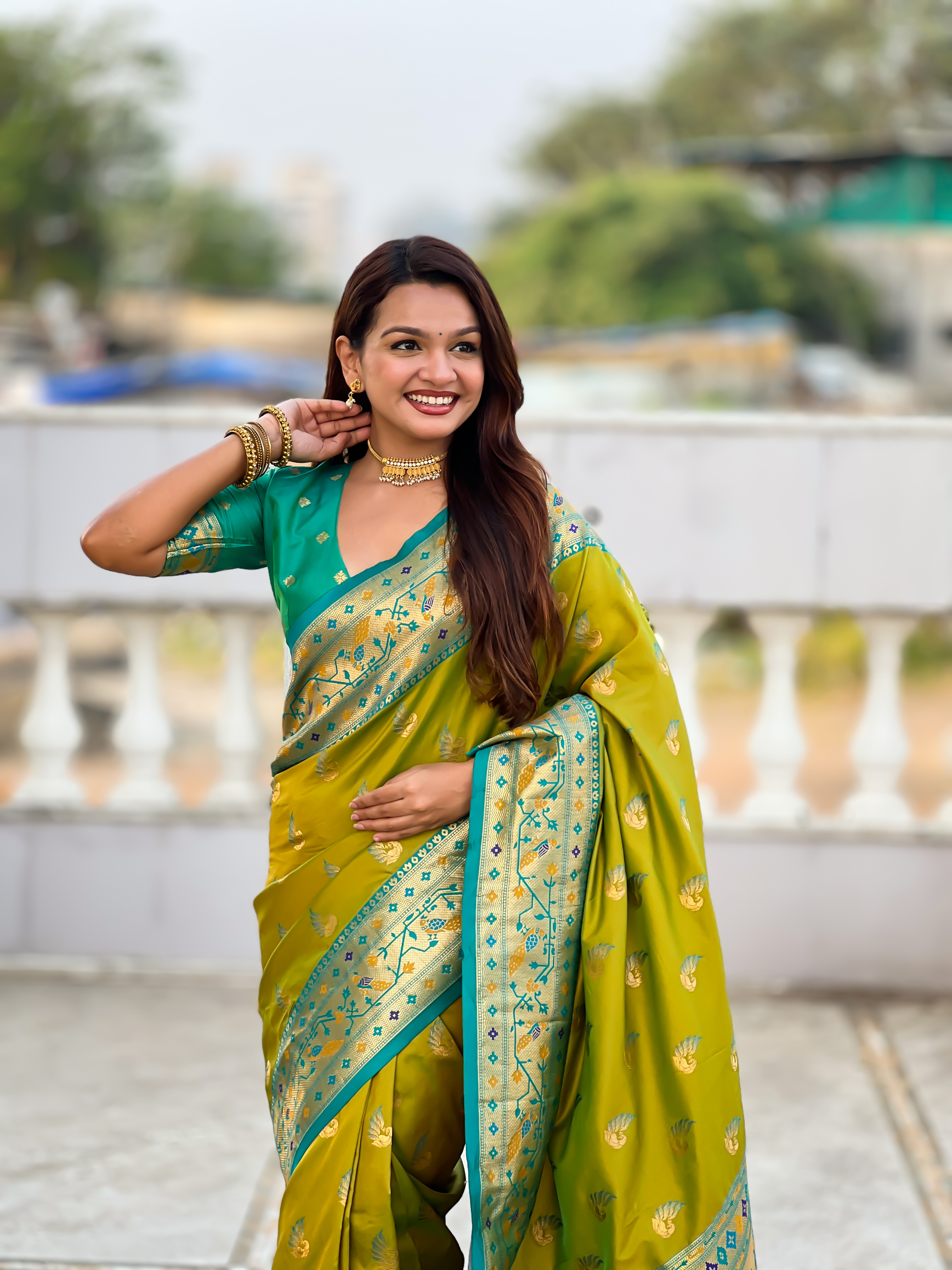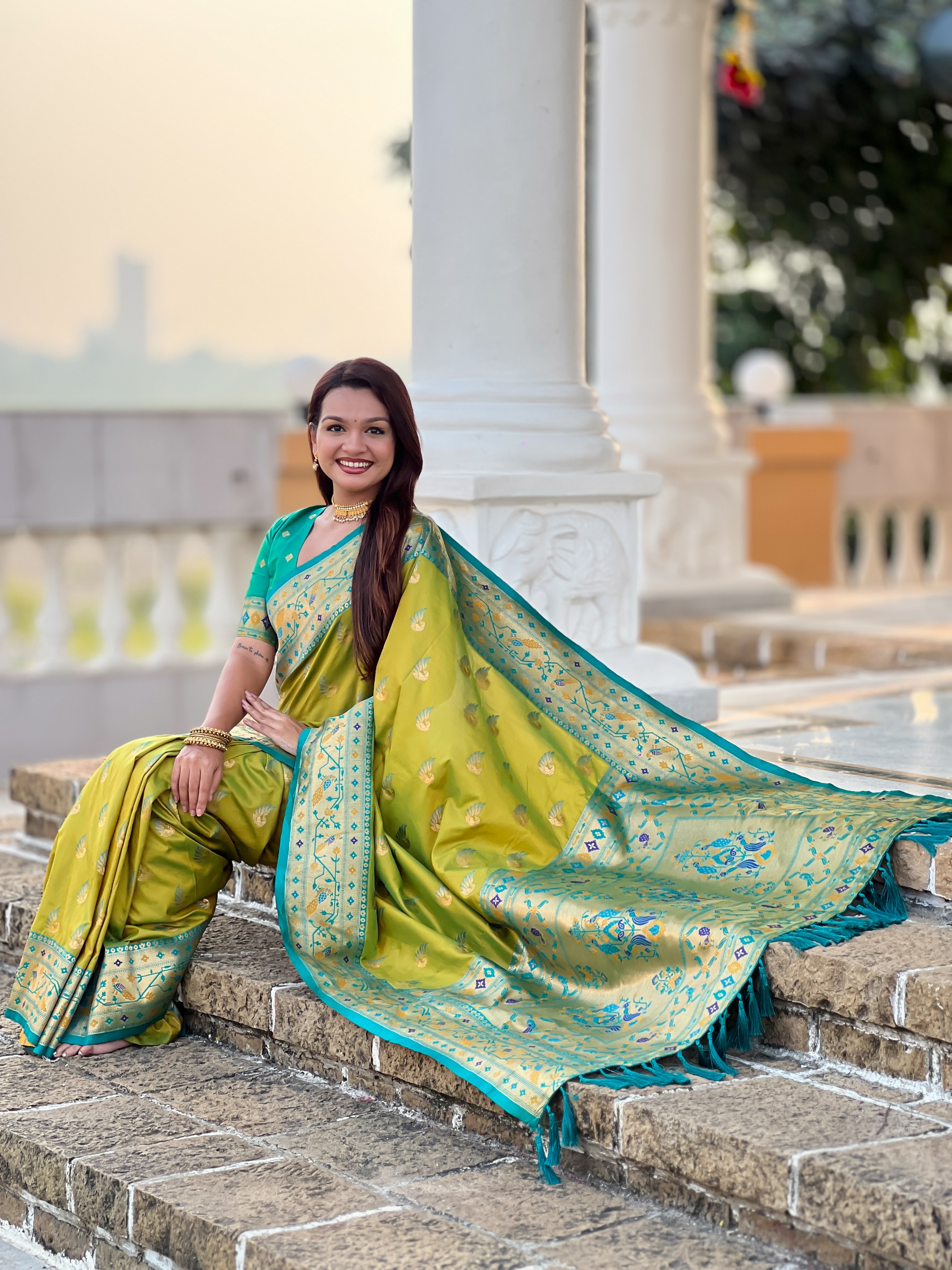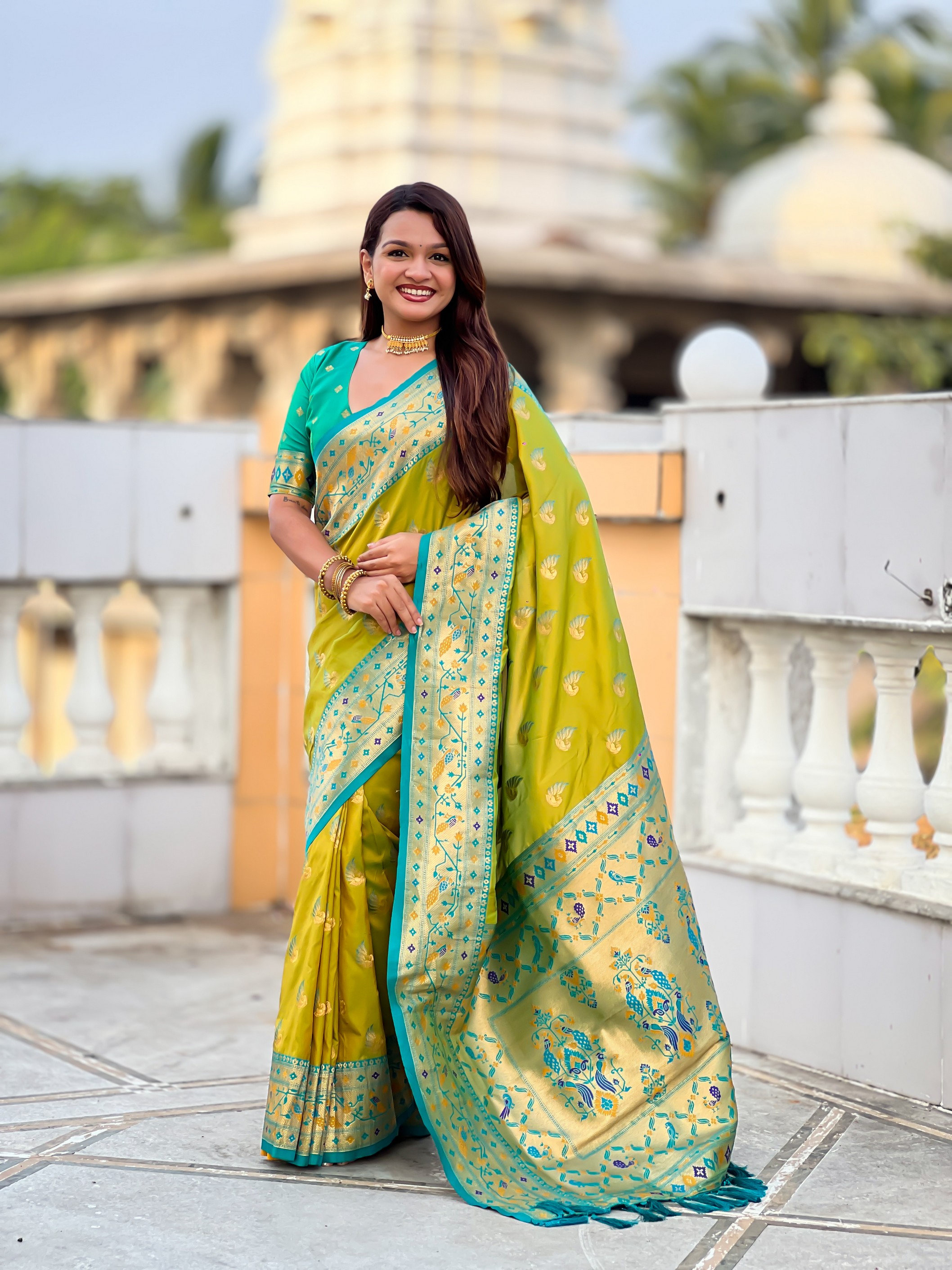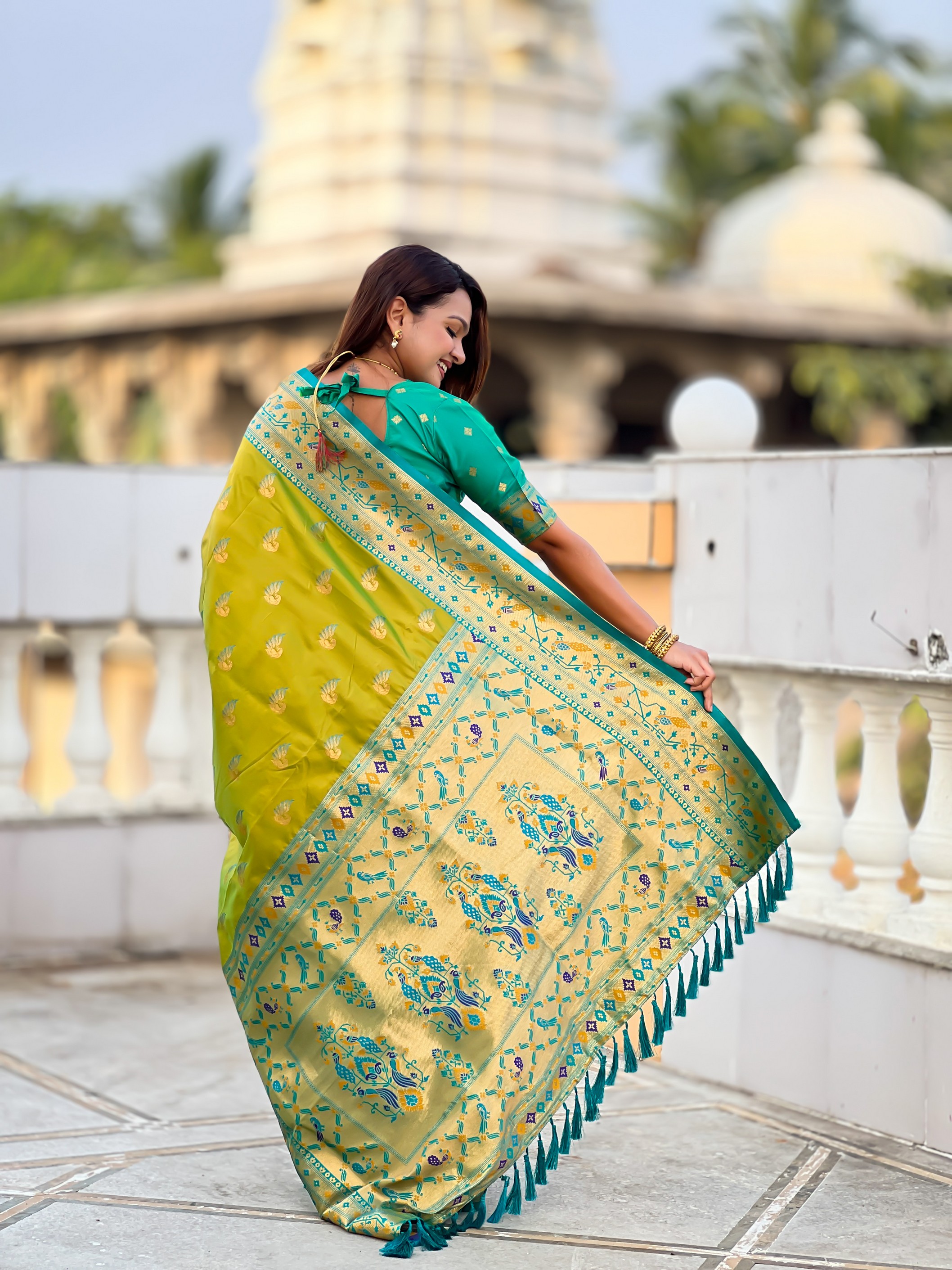 Parrot Green Color Paithani Silk Woven Meenakari Jacquard Designer Saree