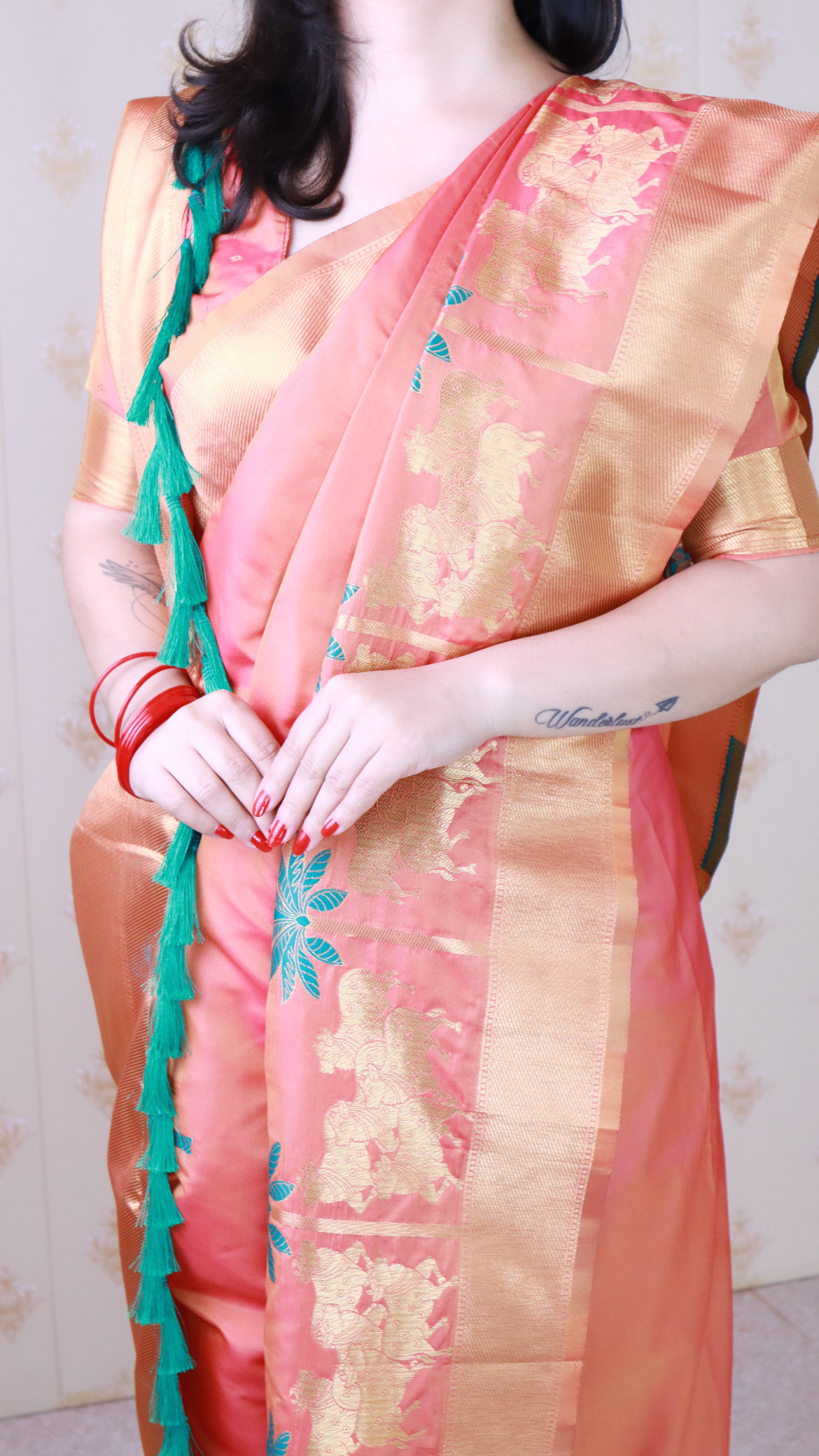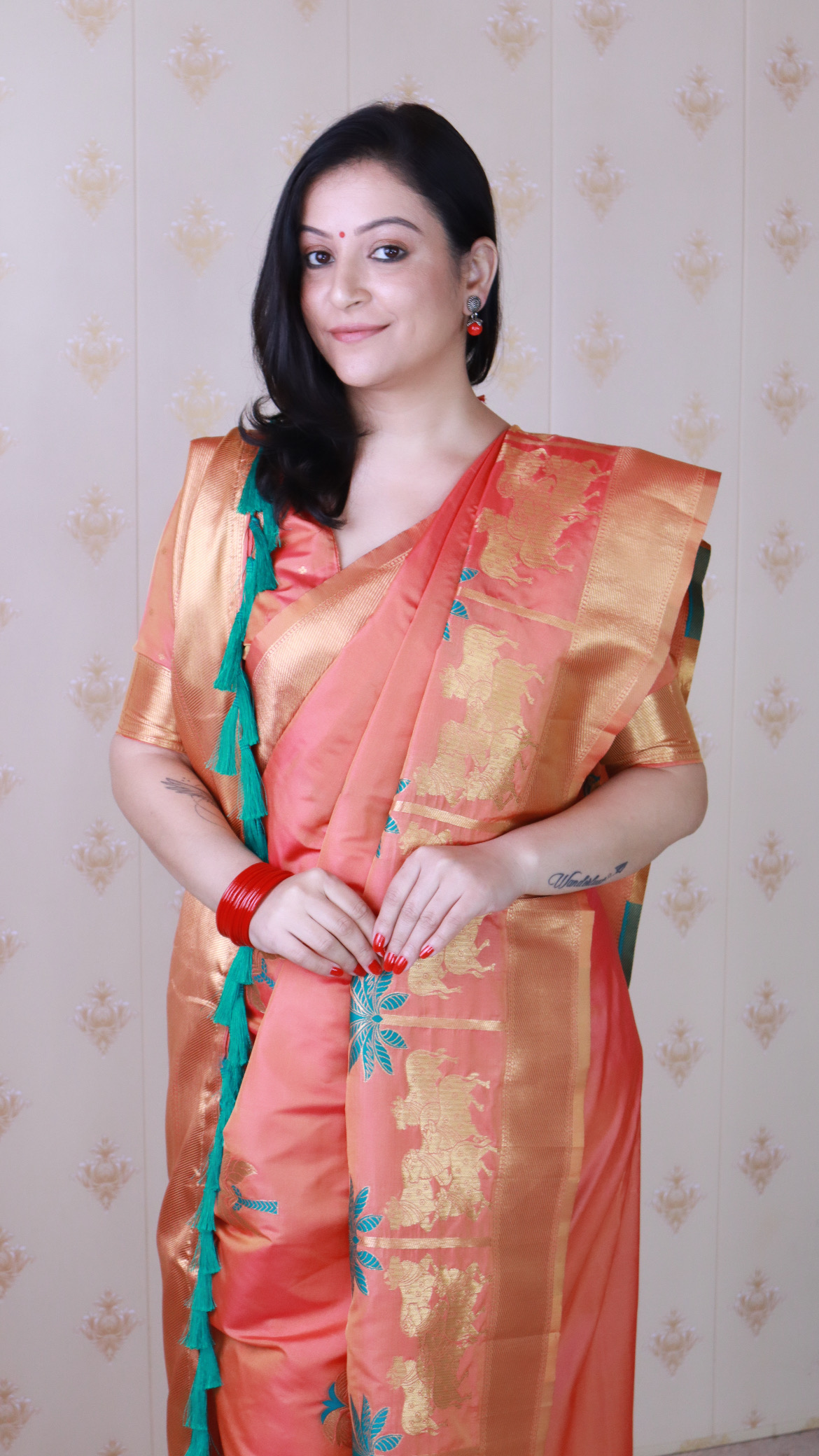 PeachColor Soft Silk Fabric Woven Meenakari Designer Ceremonial Partywear Saree