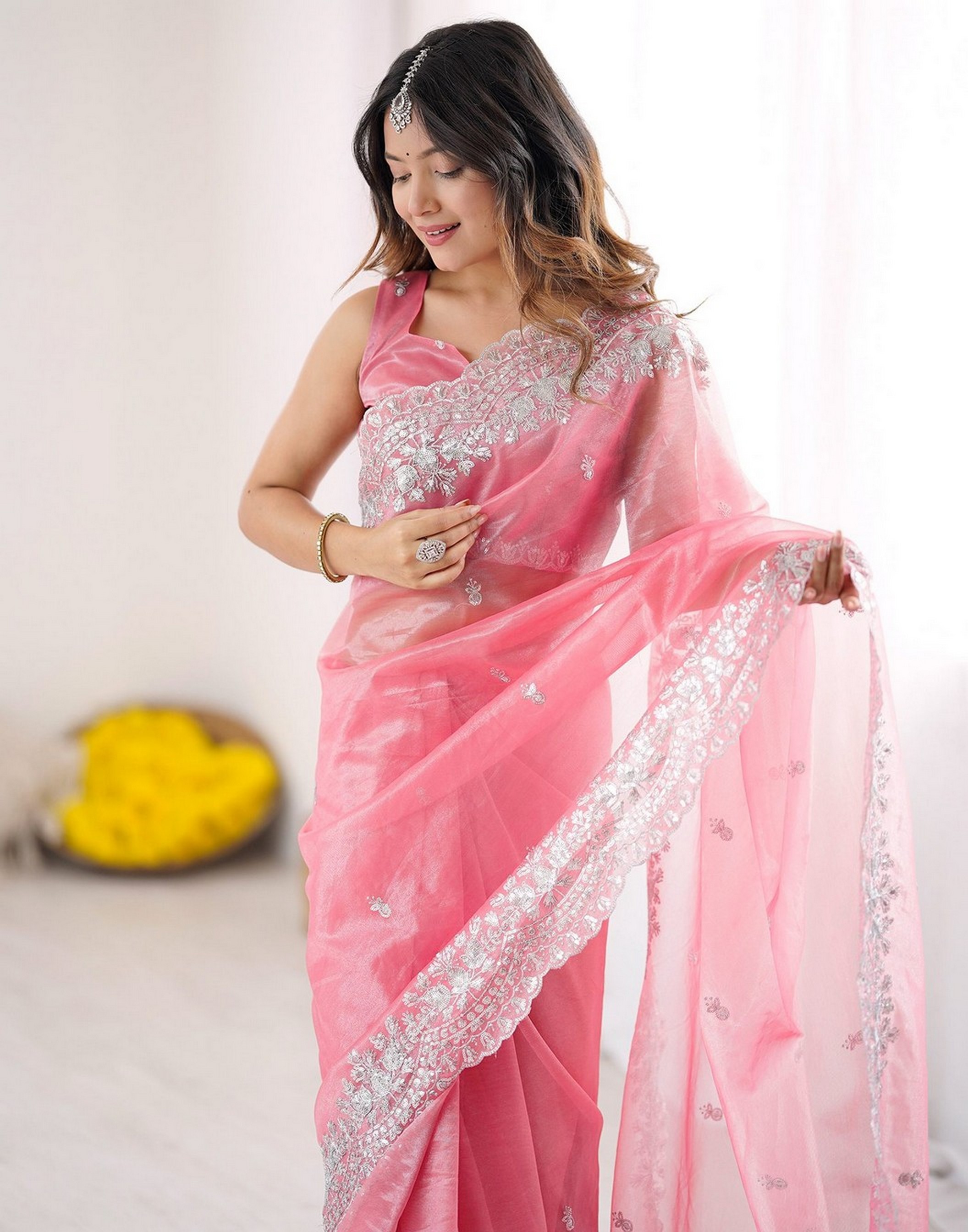 Pink Color Art Silk Fabric Designer Embroidered Saree For Ceremonial Looks