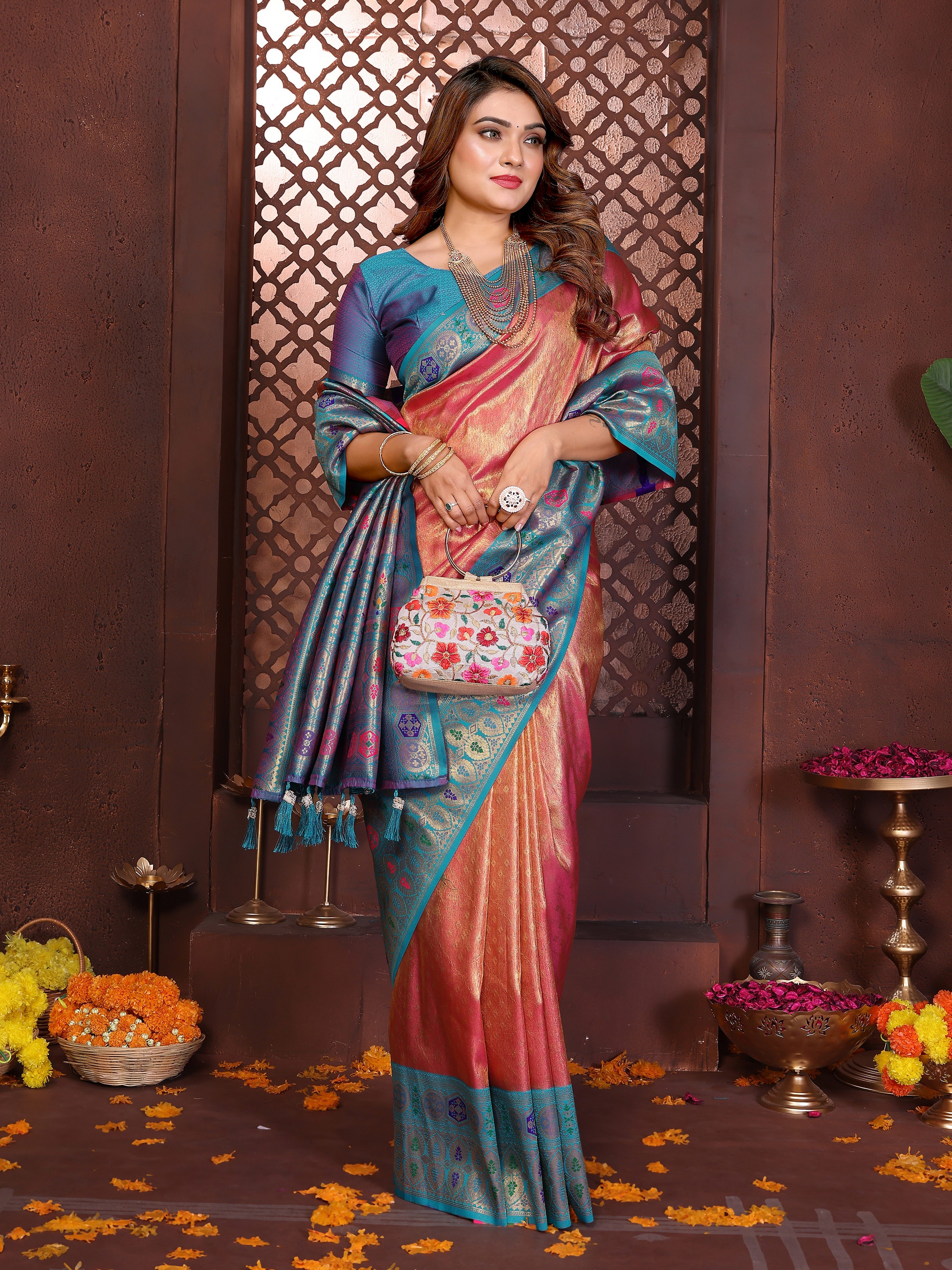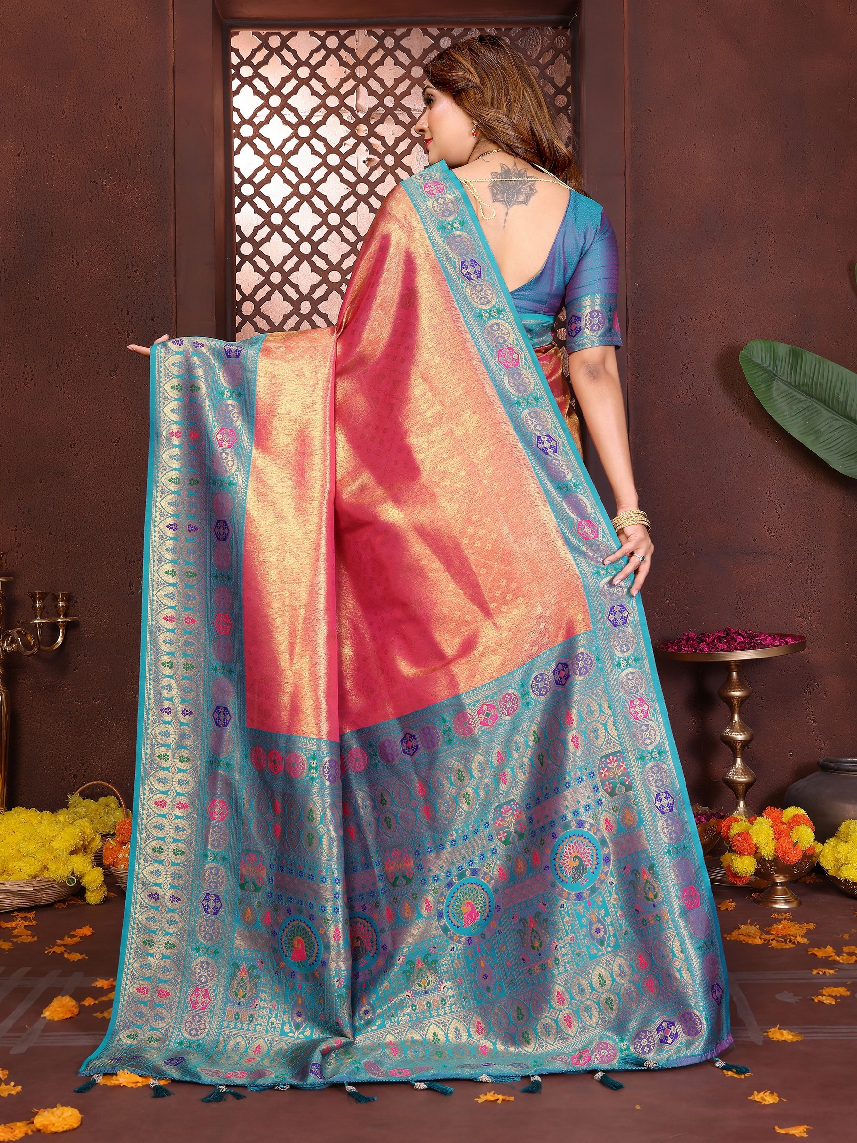 Pink Color Banarasi Tissue Silk Fabric Woven Rich Paithani Designer Saree