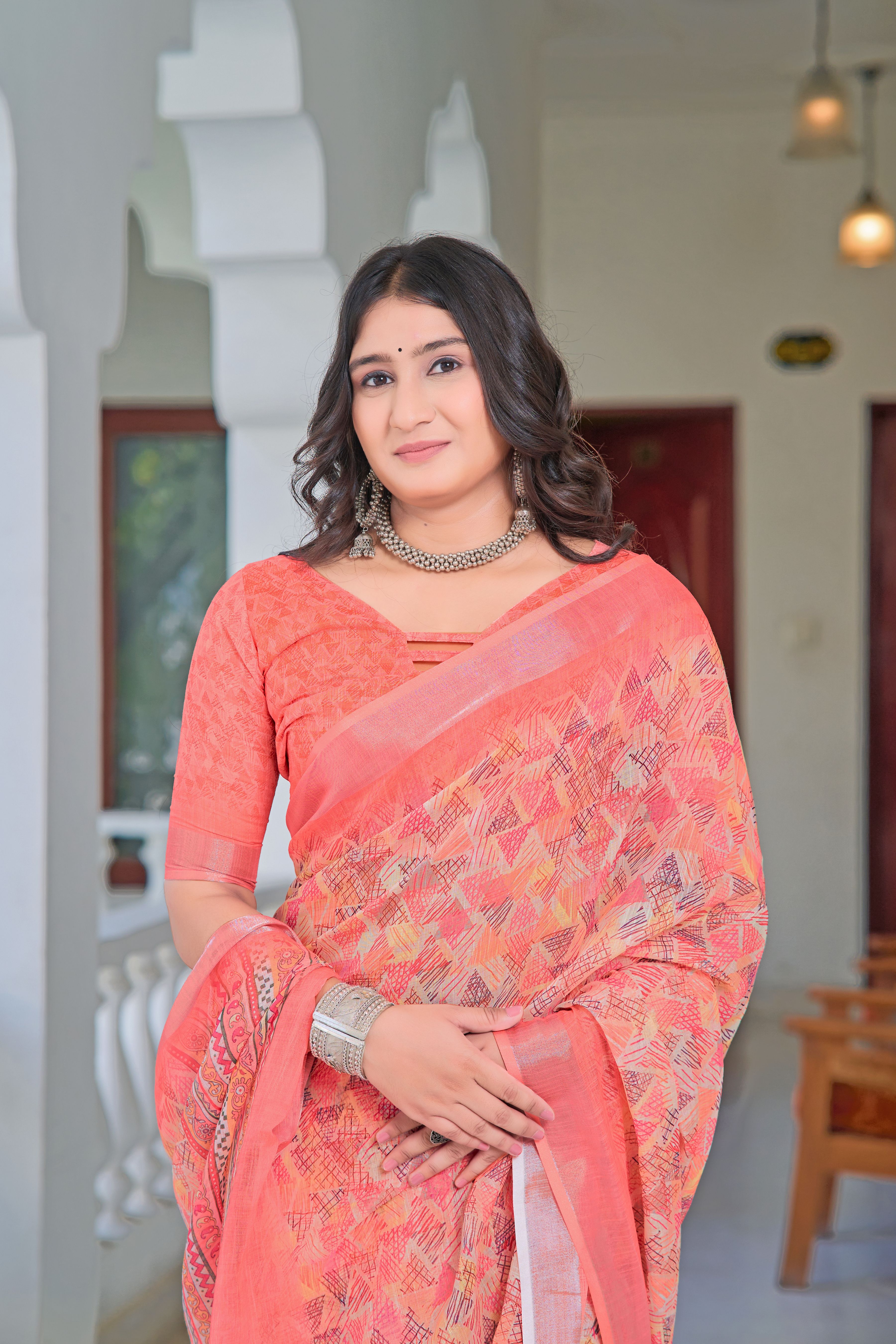 Garb These Festive Saree in Fine Colored.These Saree Are Linen Cotton And Blouse is Fabricated On Linen Cotton Pair.Its Beautified With Woven Jari Border With Designer Digital Printed.