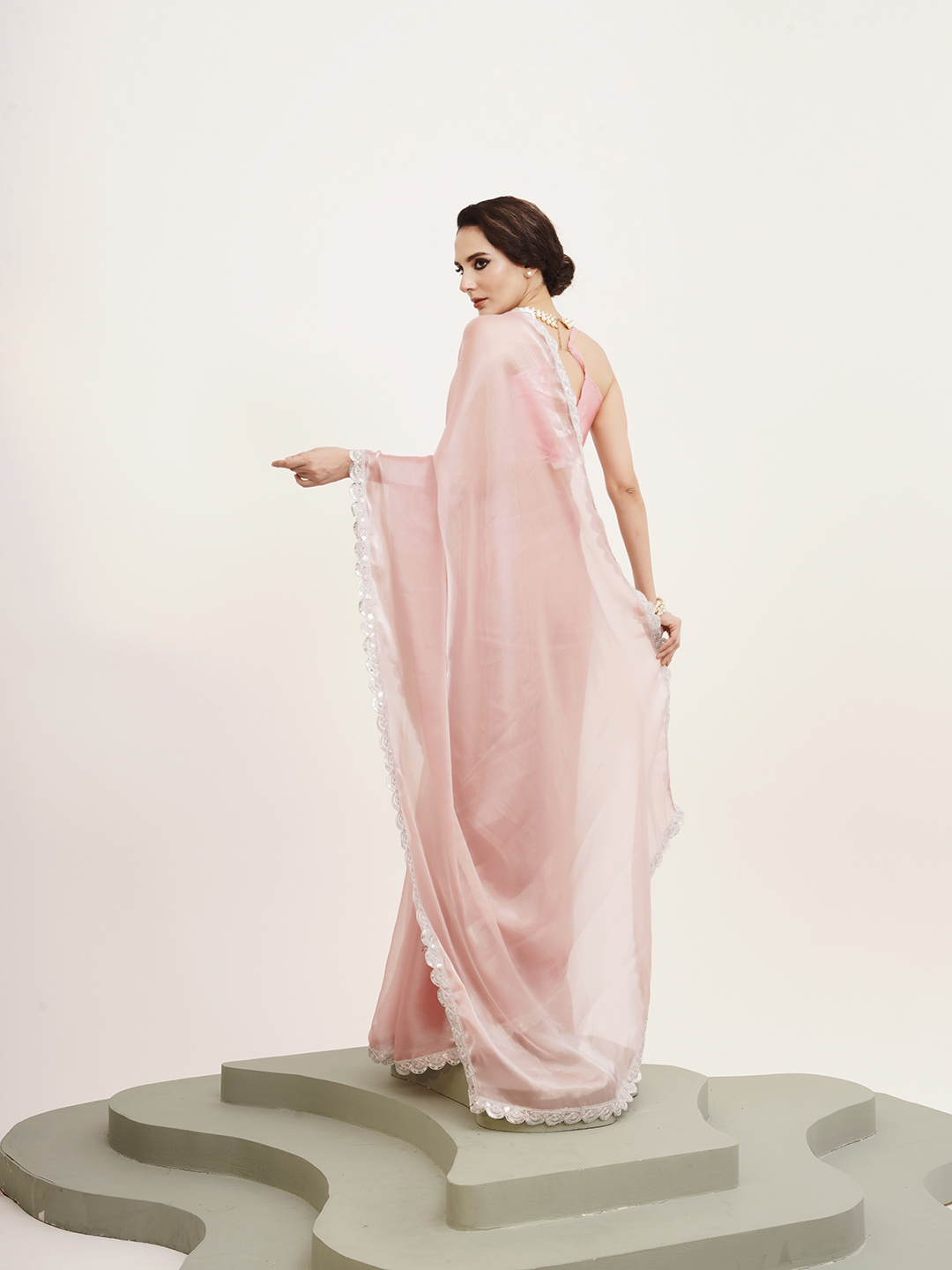 Pink Color Beautiful Partywear Embellished Sequinned Organza Saree