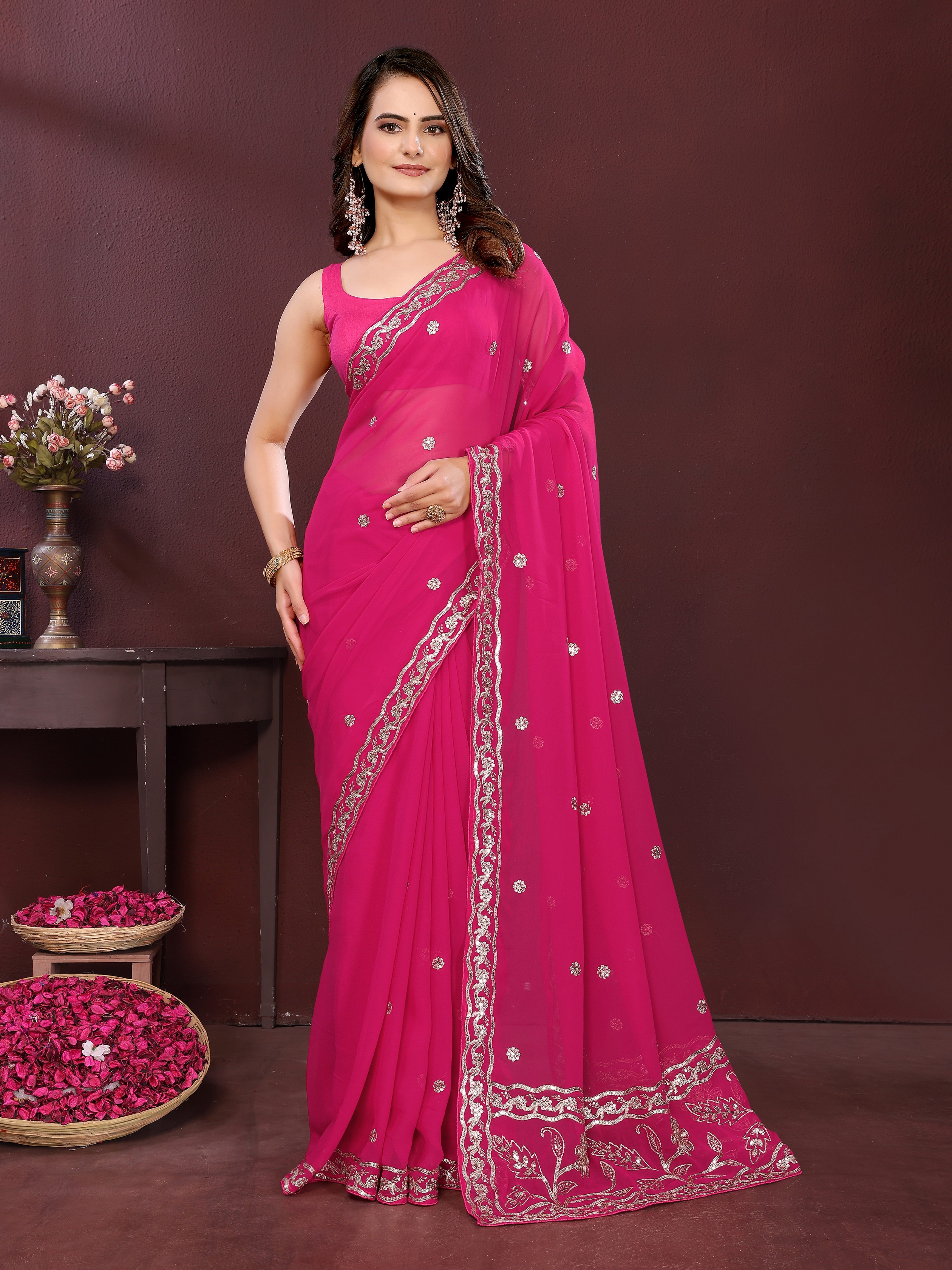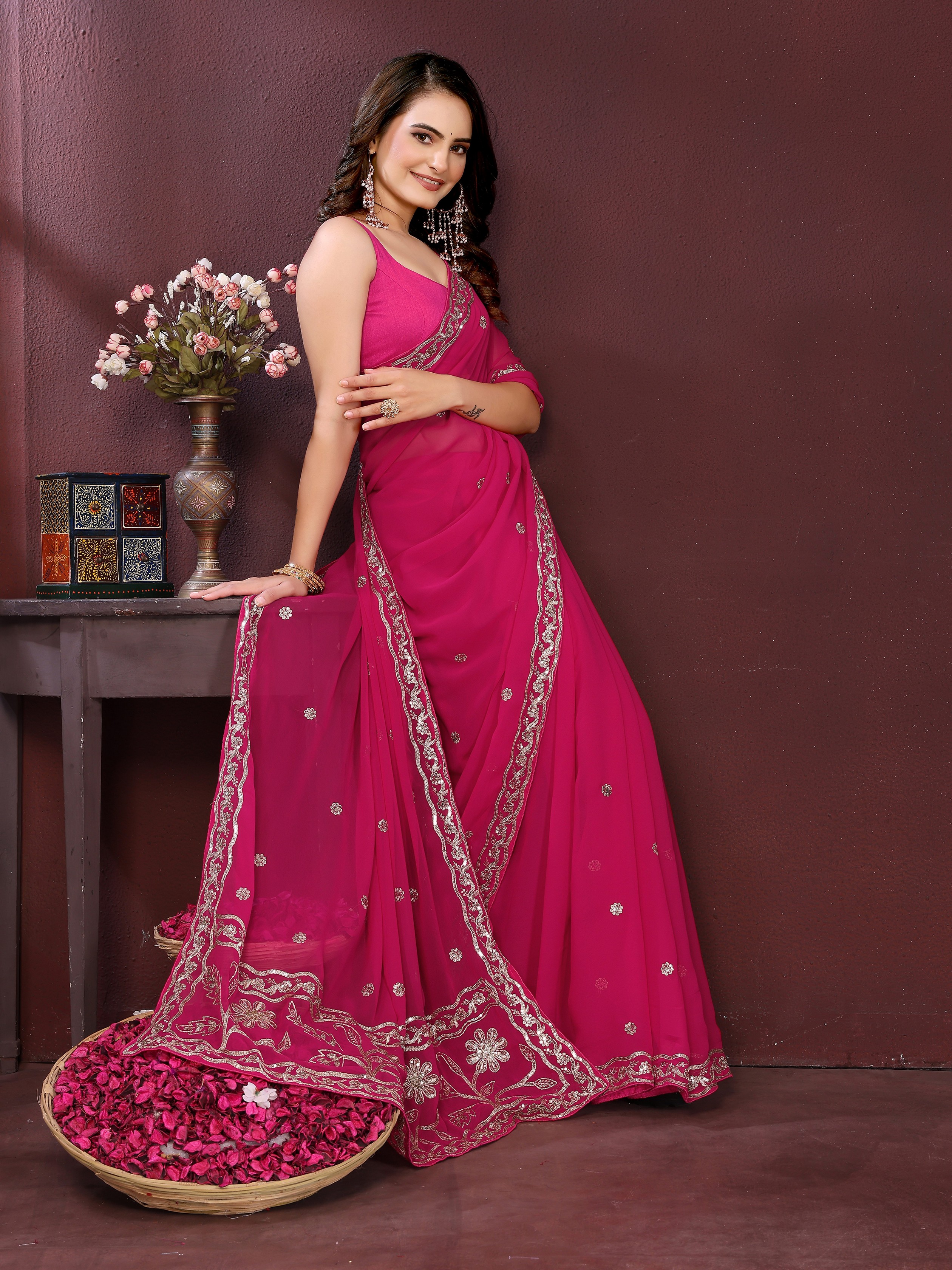 Pink Color Georgette fabric Designer Embroidery Work Ethnic Partywear Saree