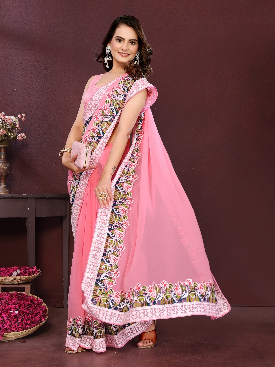 Pink Color Georgette Fabric Designer Embroidery Work Ethnic Partywear Saree