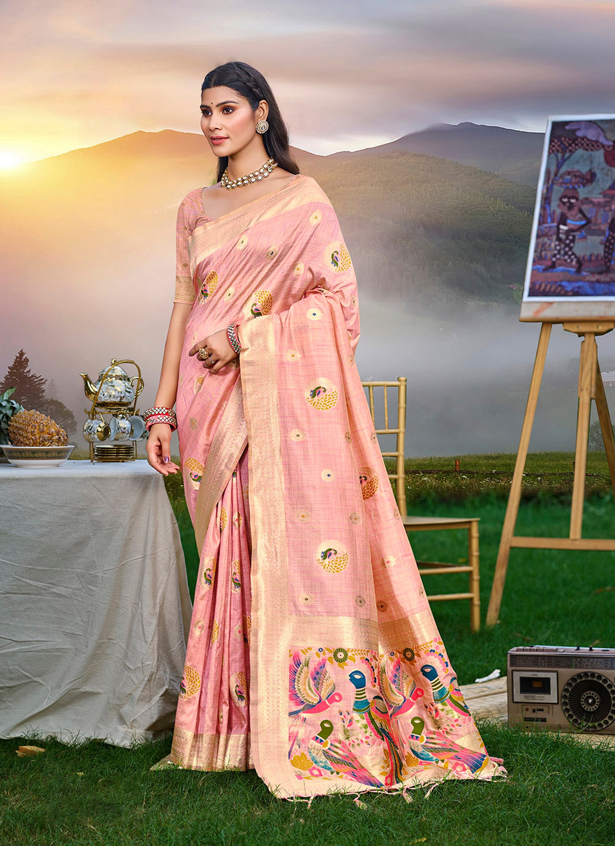 Pink Color Graceful Woven Meenakari Designer Saree On Assam Silk Fabric