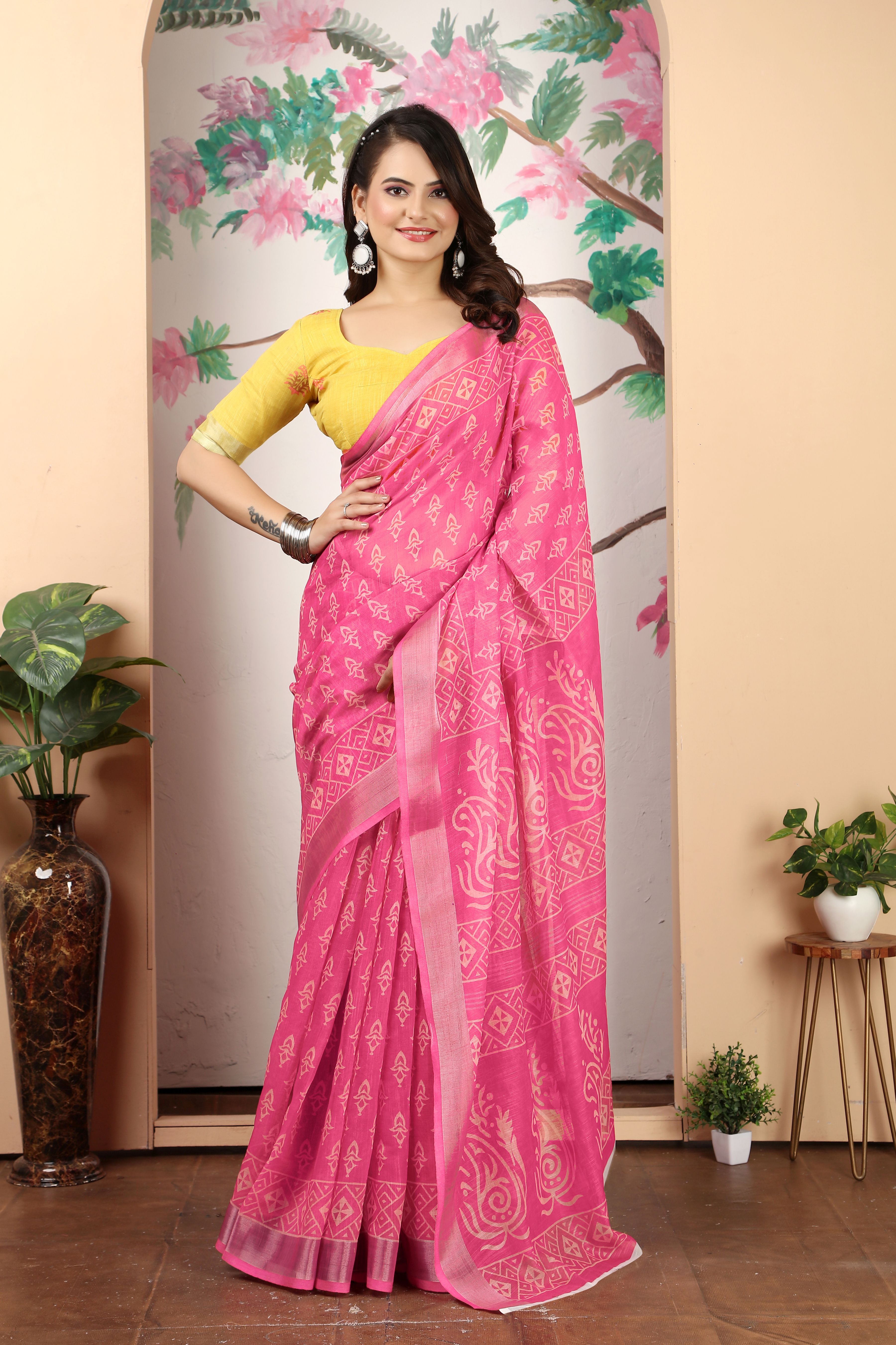 Pink Color Linen Cotton Fabric Beautiful Printed Saree