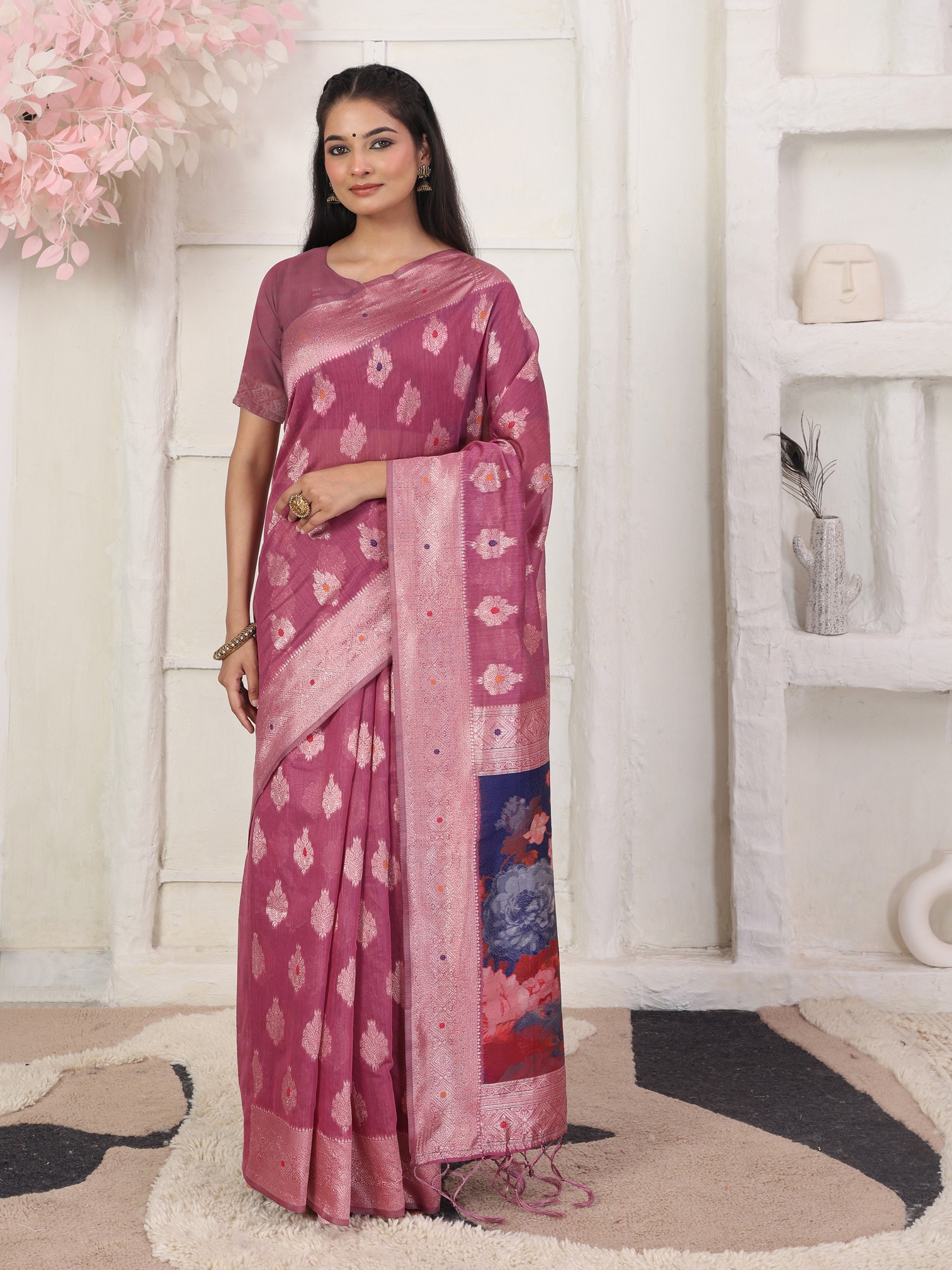 Pink Color Linen Cotton Fabric Ceremonial Looks Partywear Saree