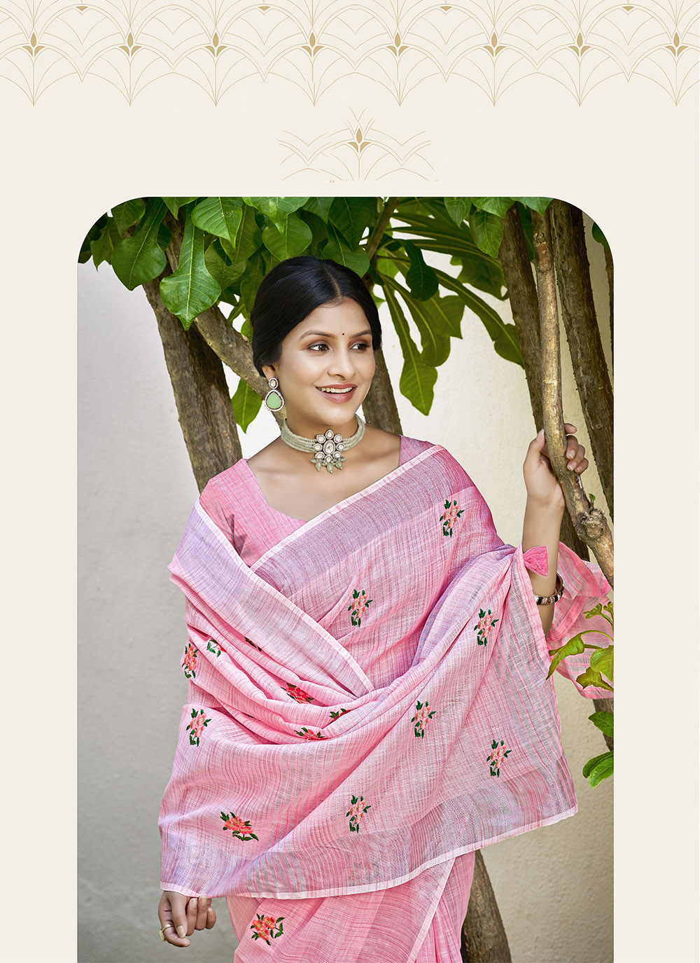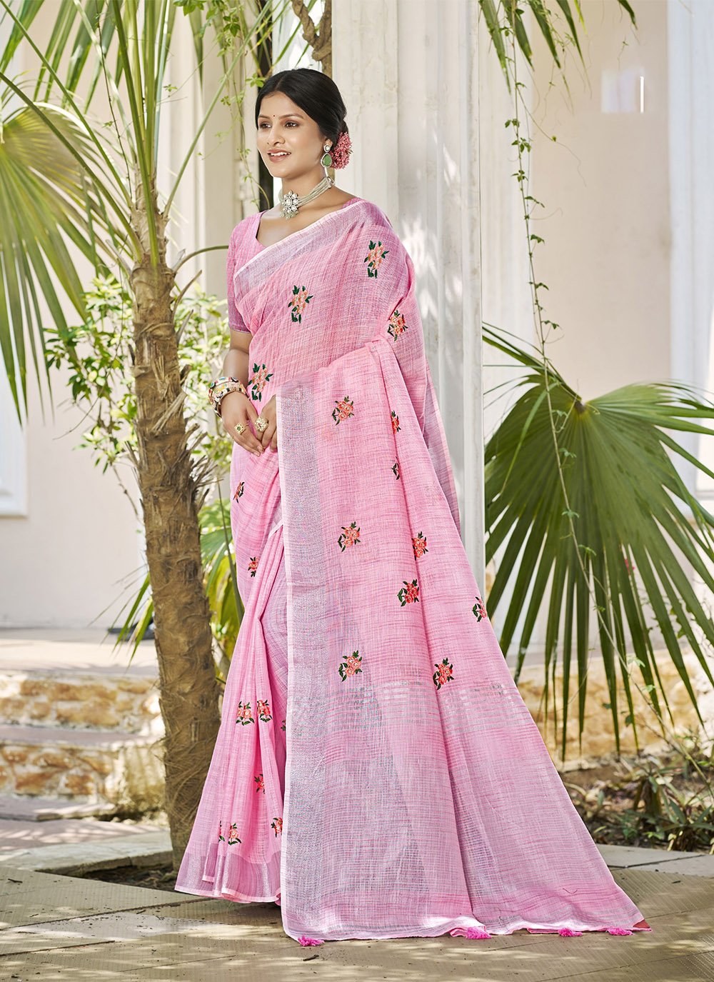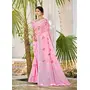 Pink Color Linen Fabric Beautifully Embroidered Ethnic Saree