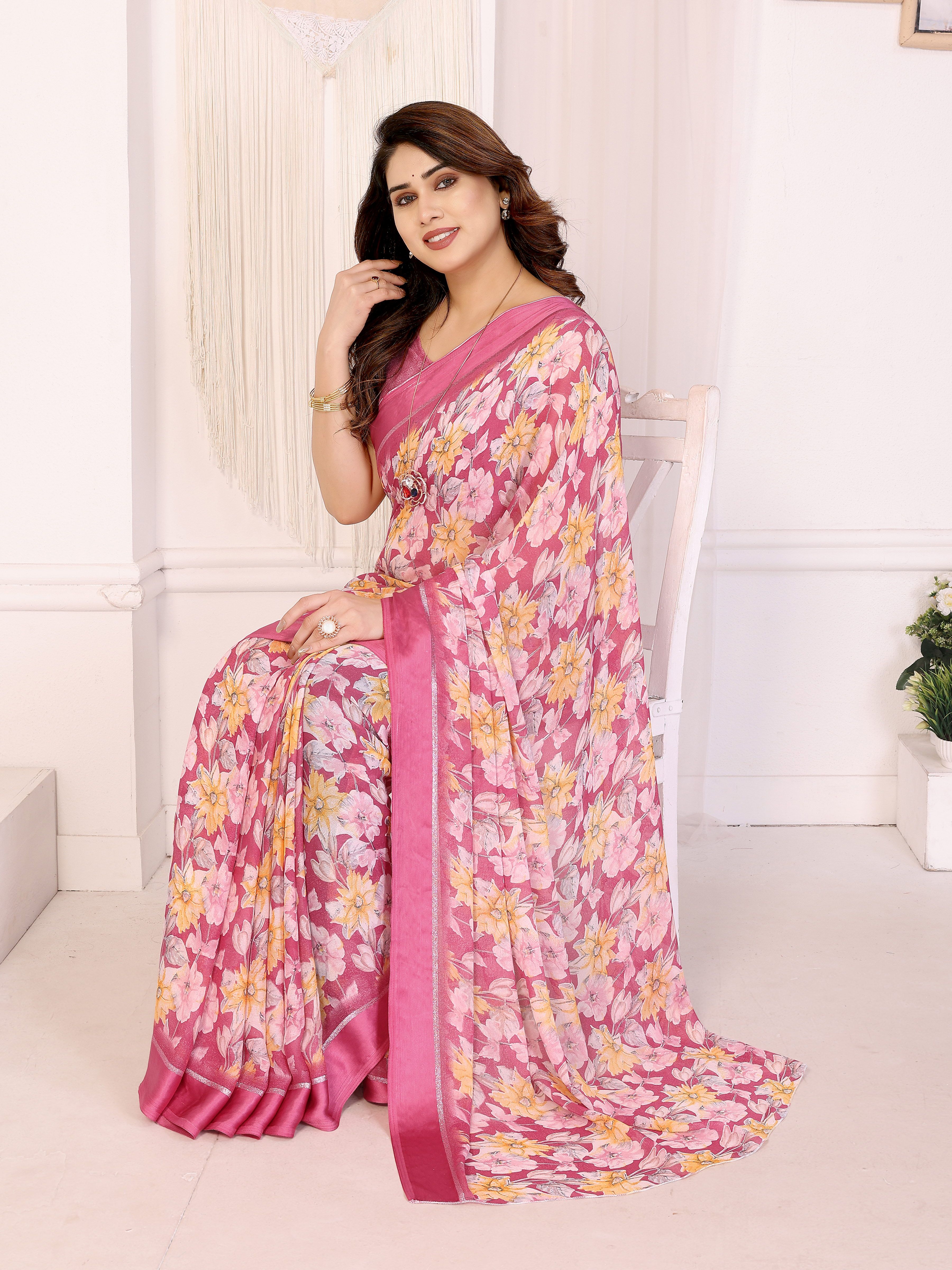 Pink Color Moss Satin Patta Designer Flower Printed Ceremonial Saree
