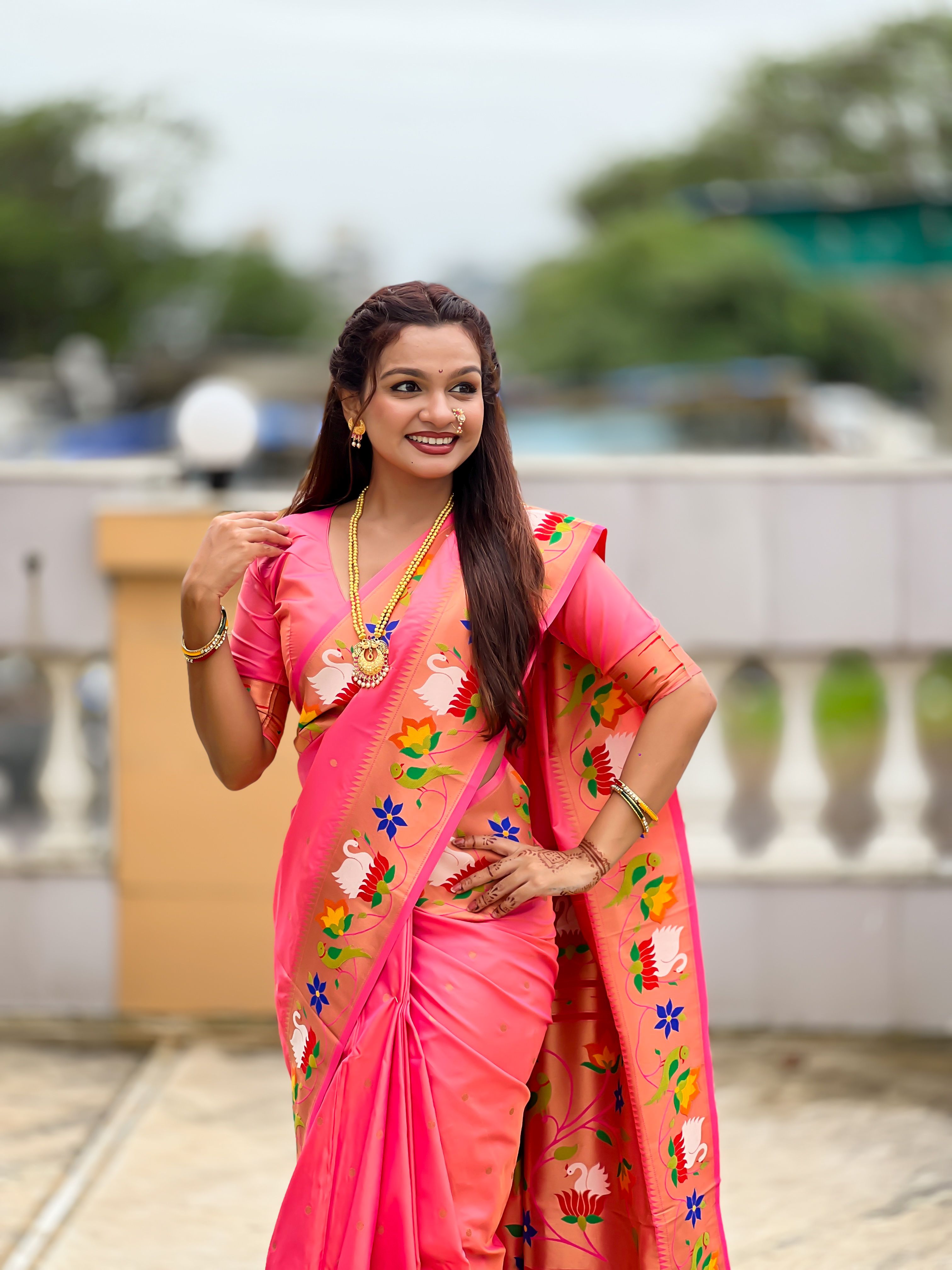 Pink Color Paithani Silk Woven Meenakari Jacquard Designer Heavy Wedding Special Saree