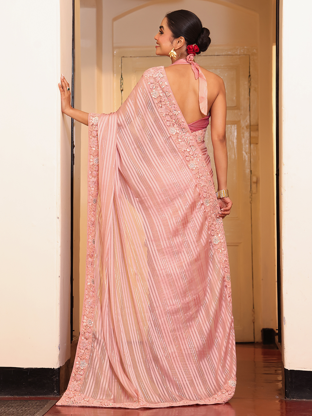 Pink Color Tissue Fabric Embroidery Work Partywear Saree