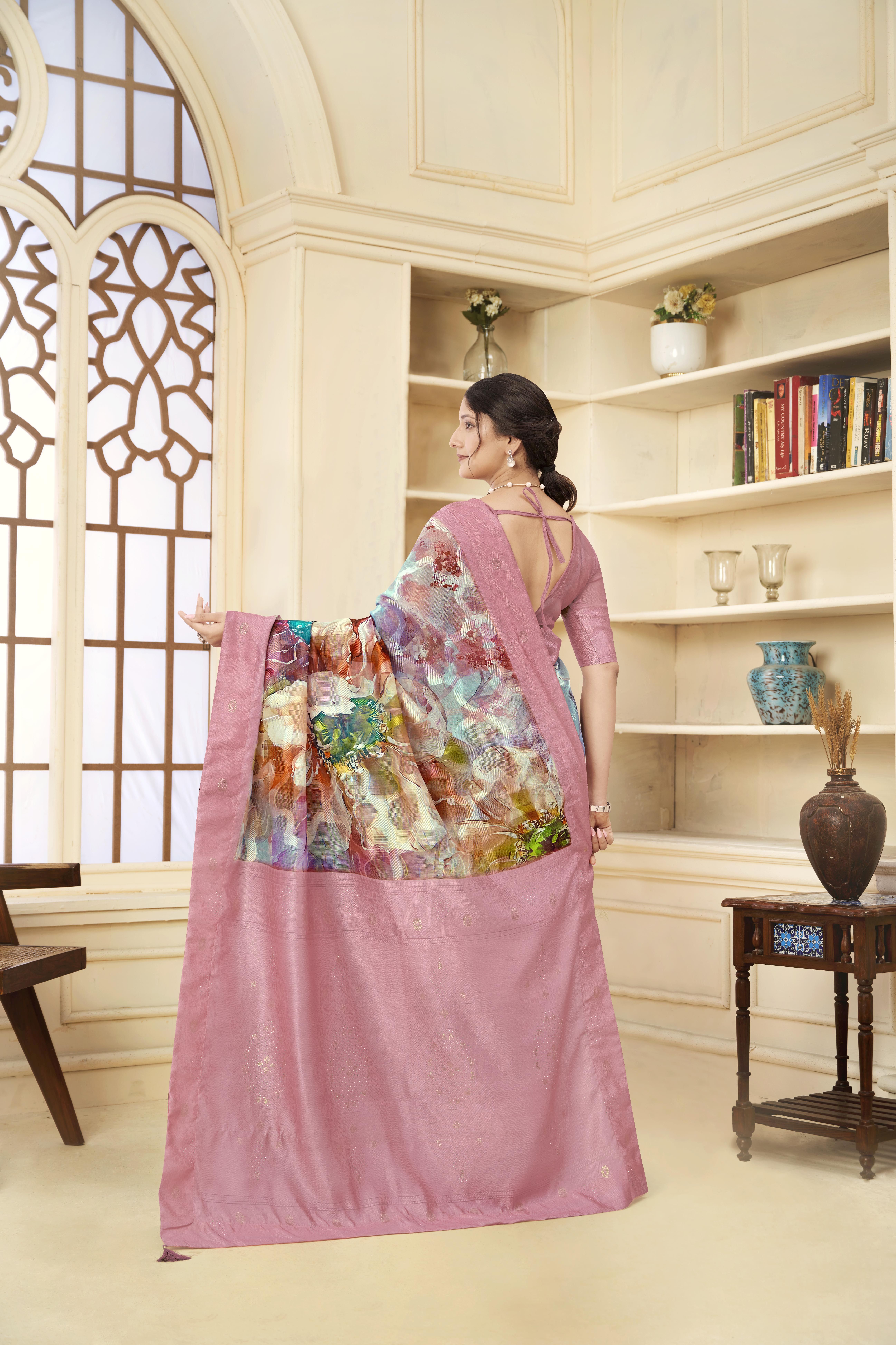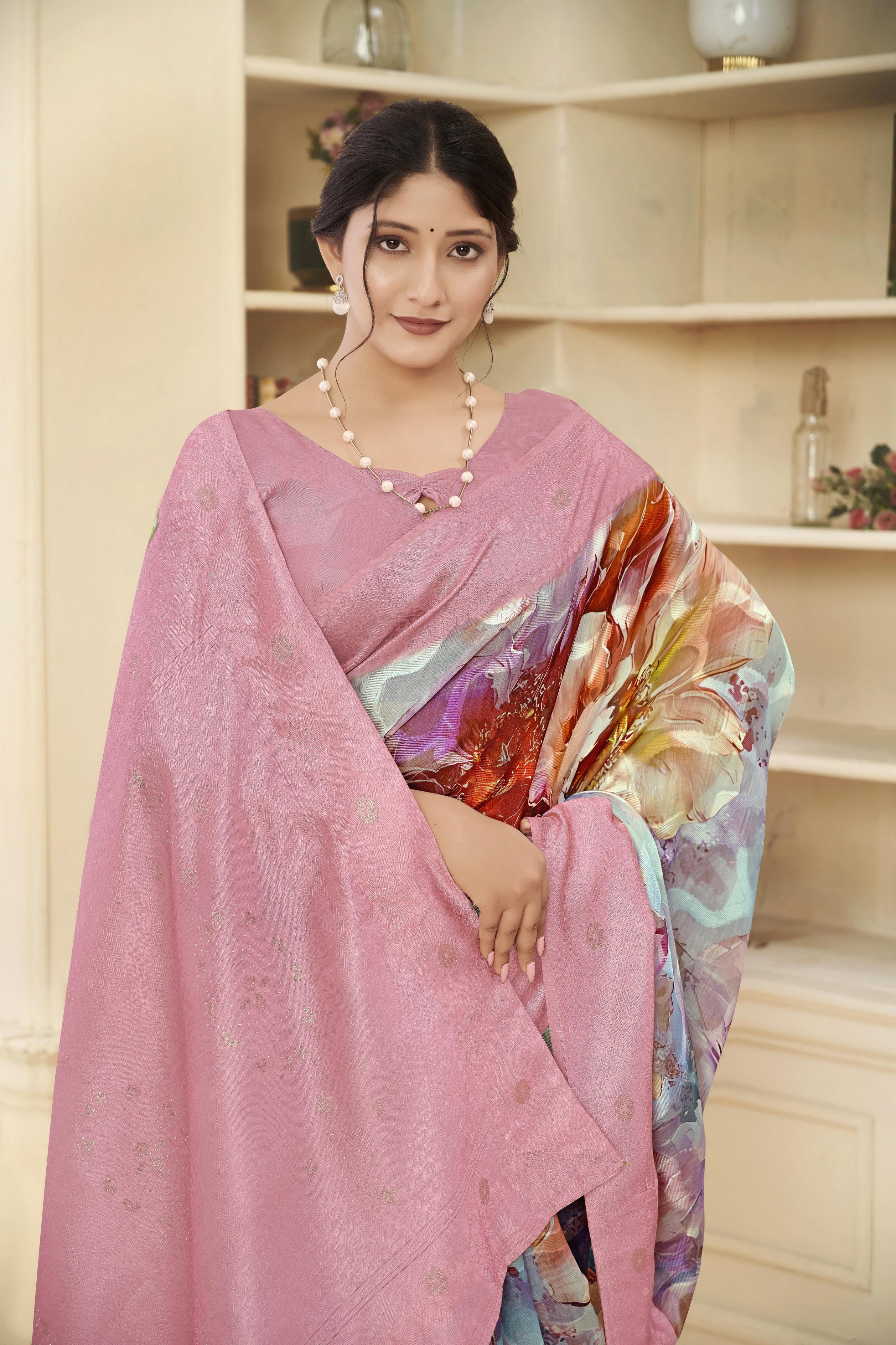 Pink Color Wevon Jacquard Designer With Printed Rich Silk Fabric Stylish Ceremonial Saree