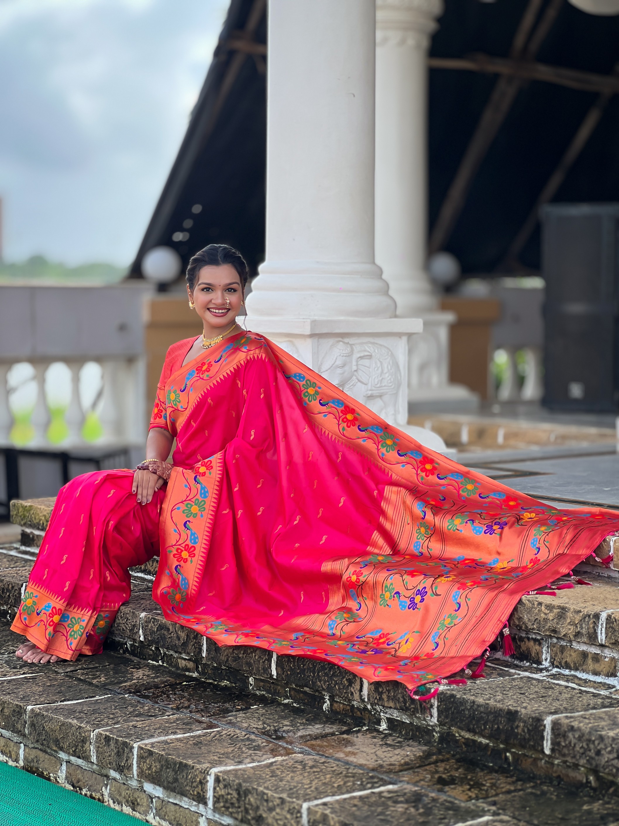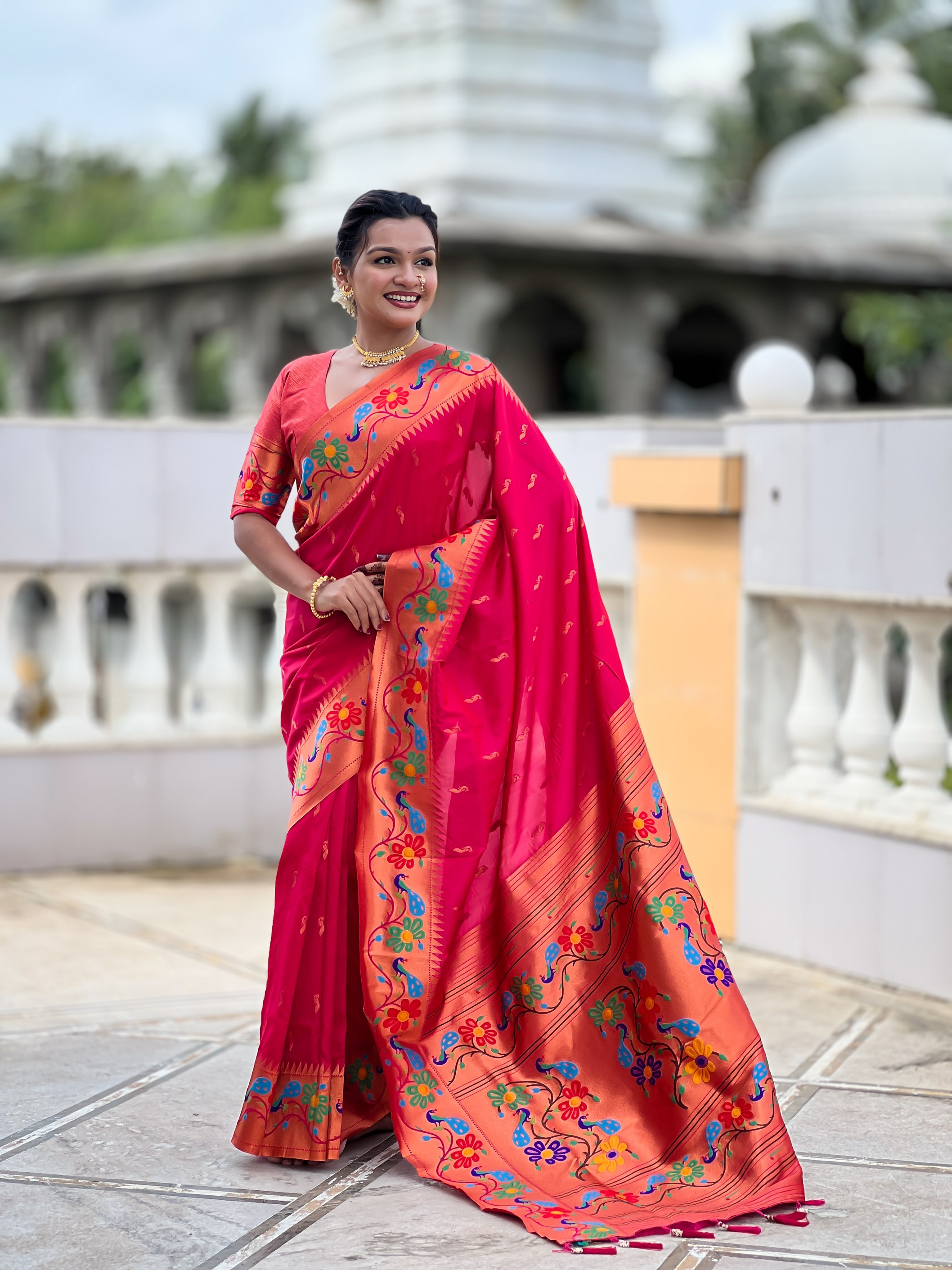 Pink Color Woven Meenakari Jacquard Designer Paithani Silk Fabric Ethnic Saree