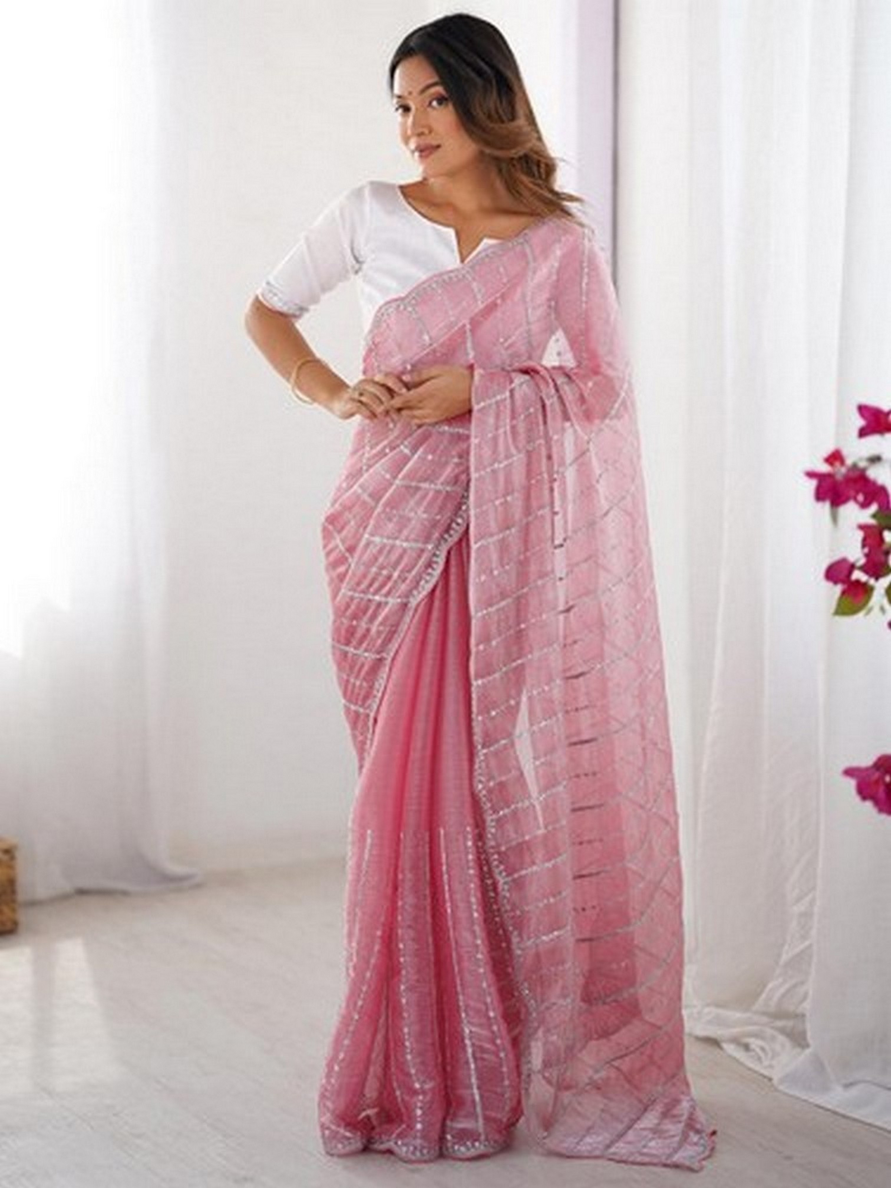 Pink Color Zimmy Choo Fabric Designer Embroidered Saree For Ceremonial Looks
