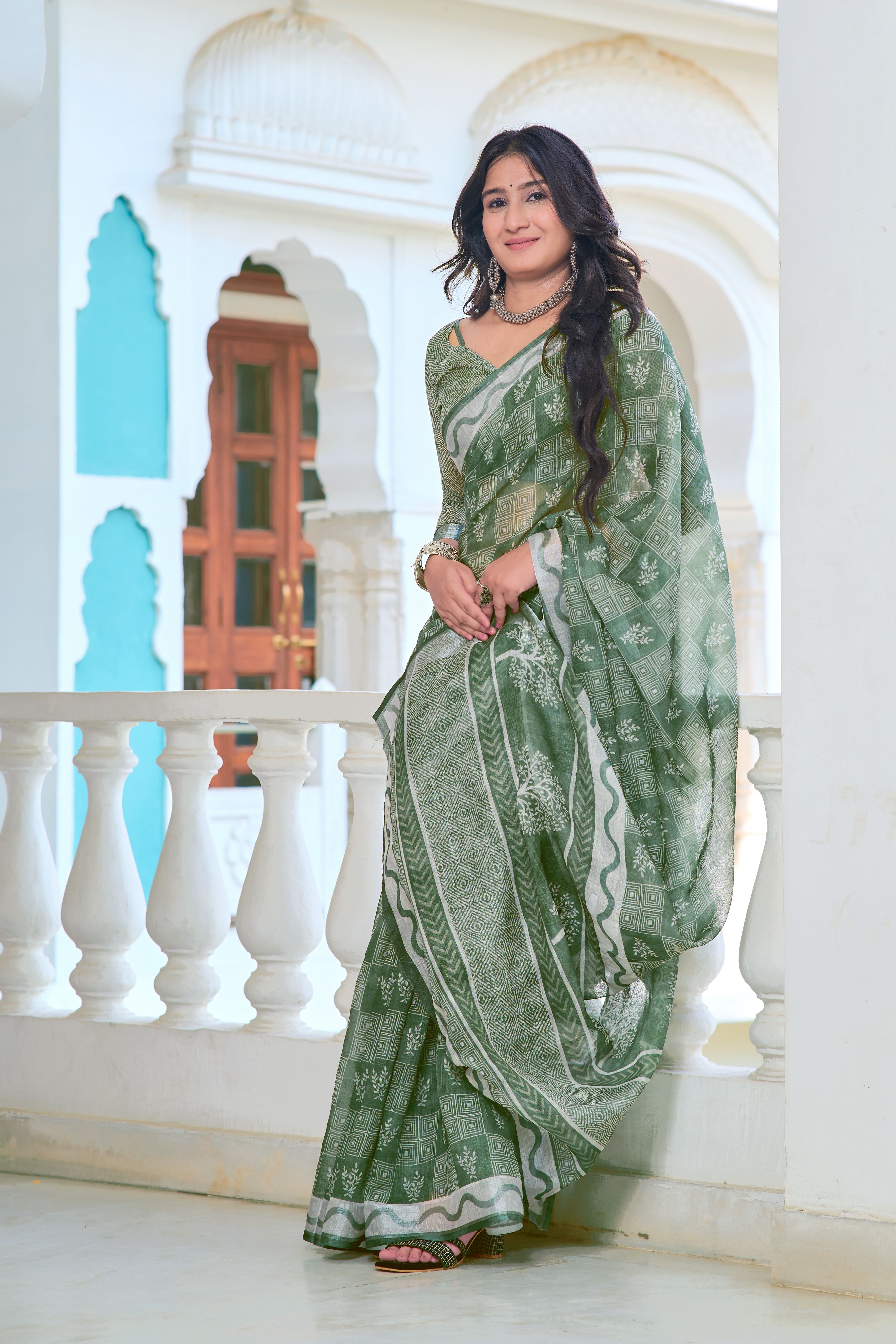 Pista Color Beautiful Linen Cotton Fabric Designer Festive Wear Saree