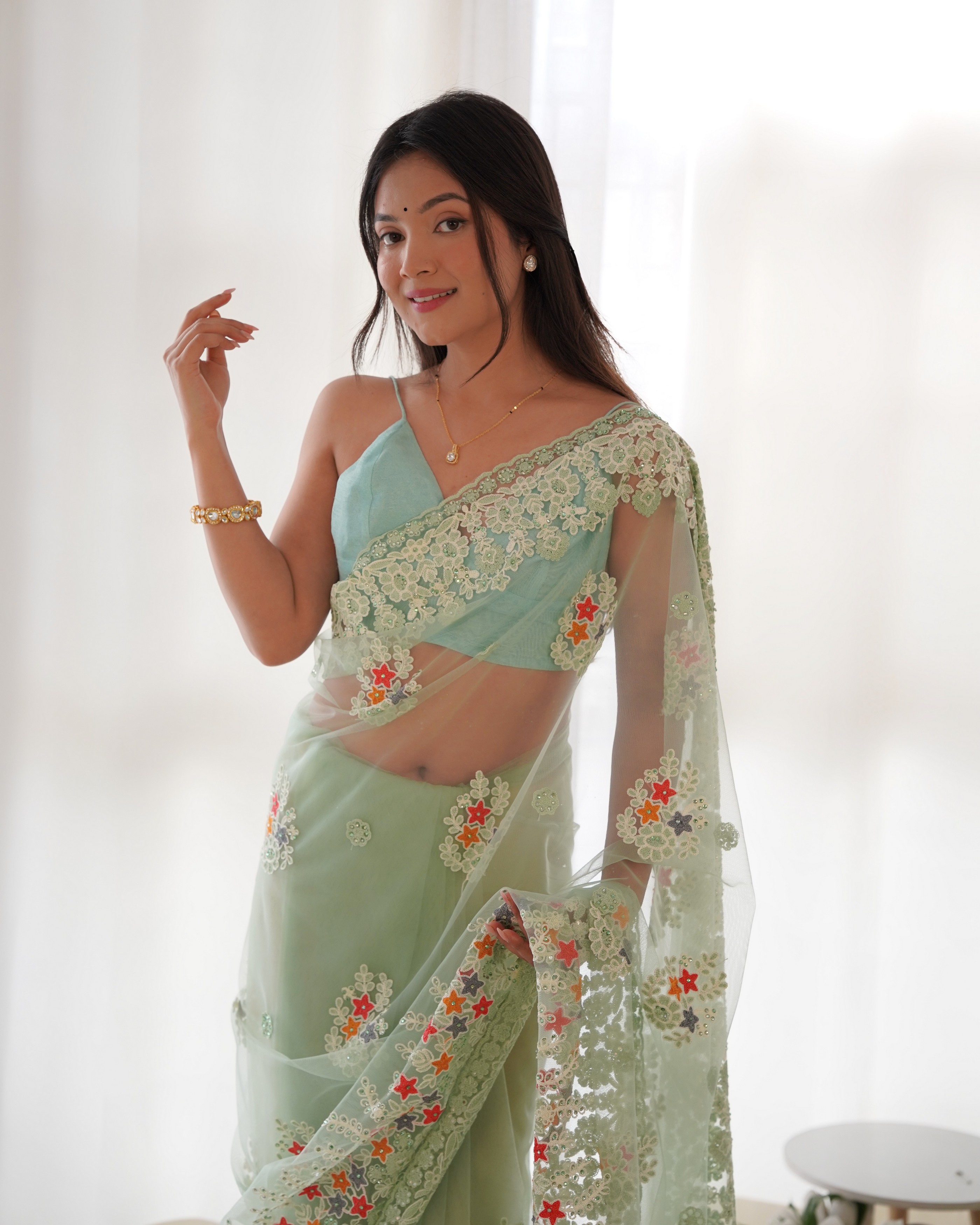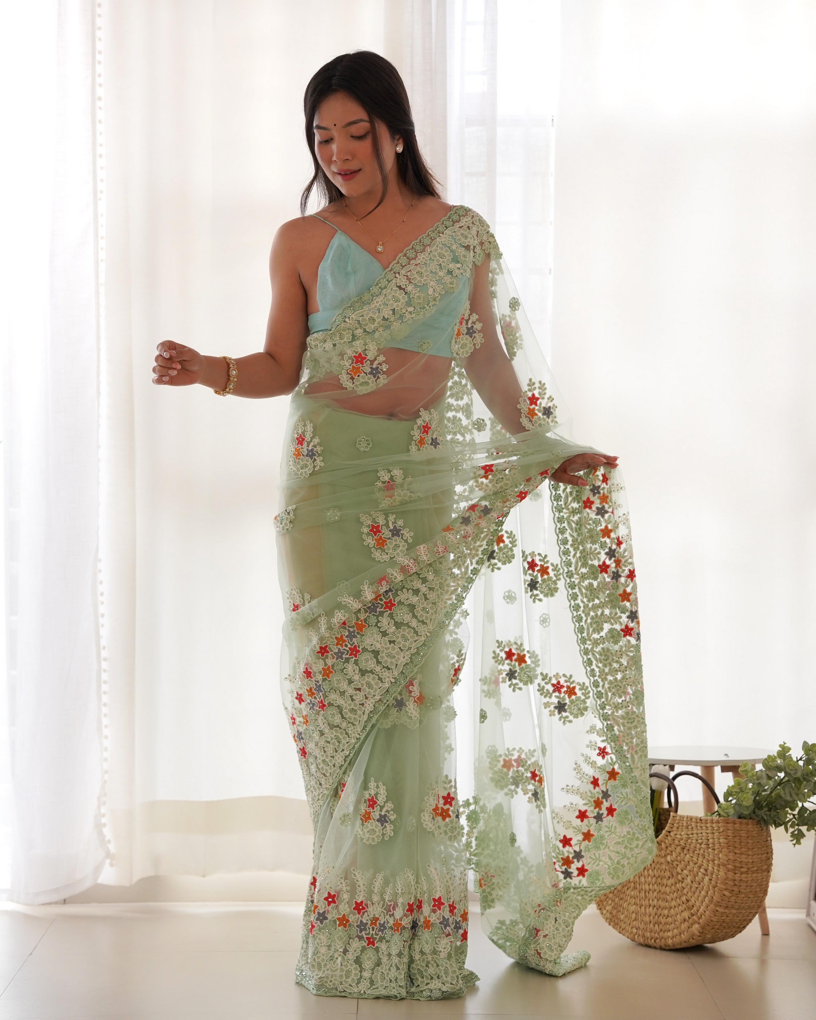 Pista Color Butterfly Net Fabric Designer Thread Embroidery Work Ceremonial Saree