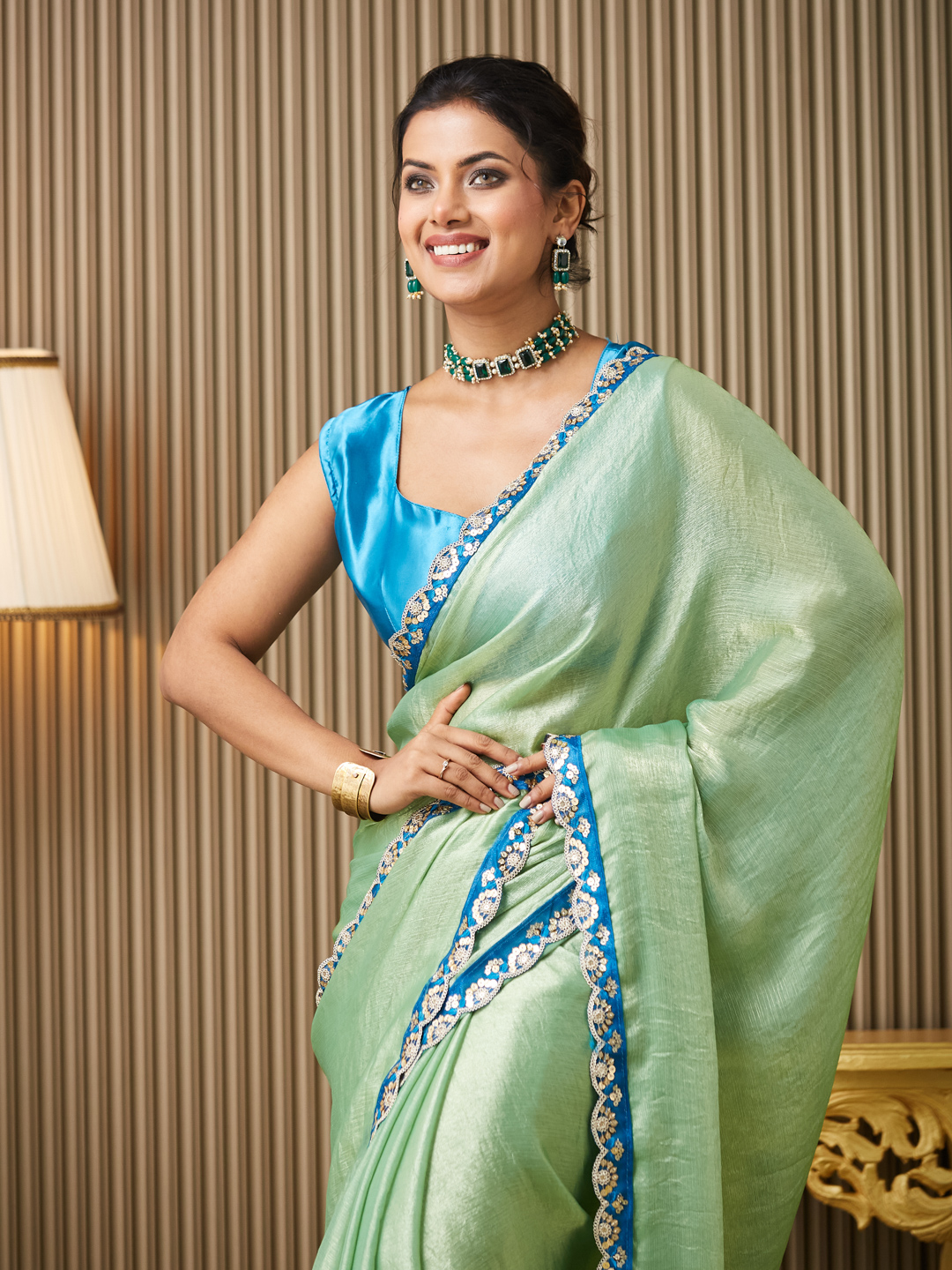 Pista Color Chiffon Fabric Fancy Designer Bollywood Party Saree