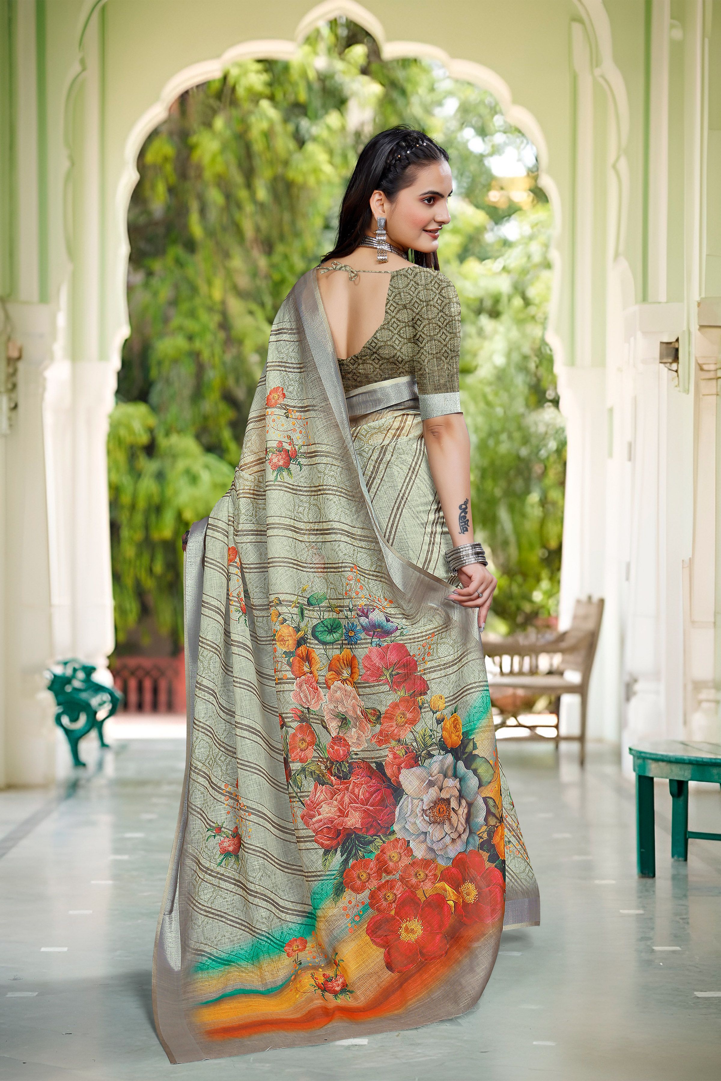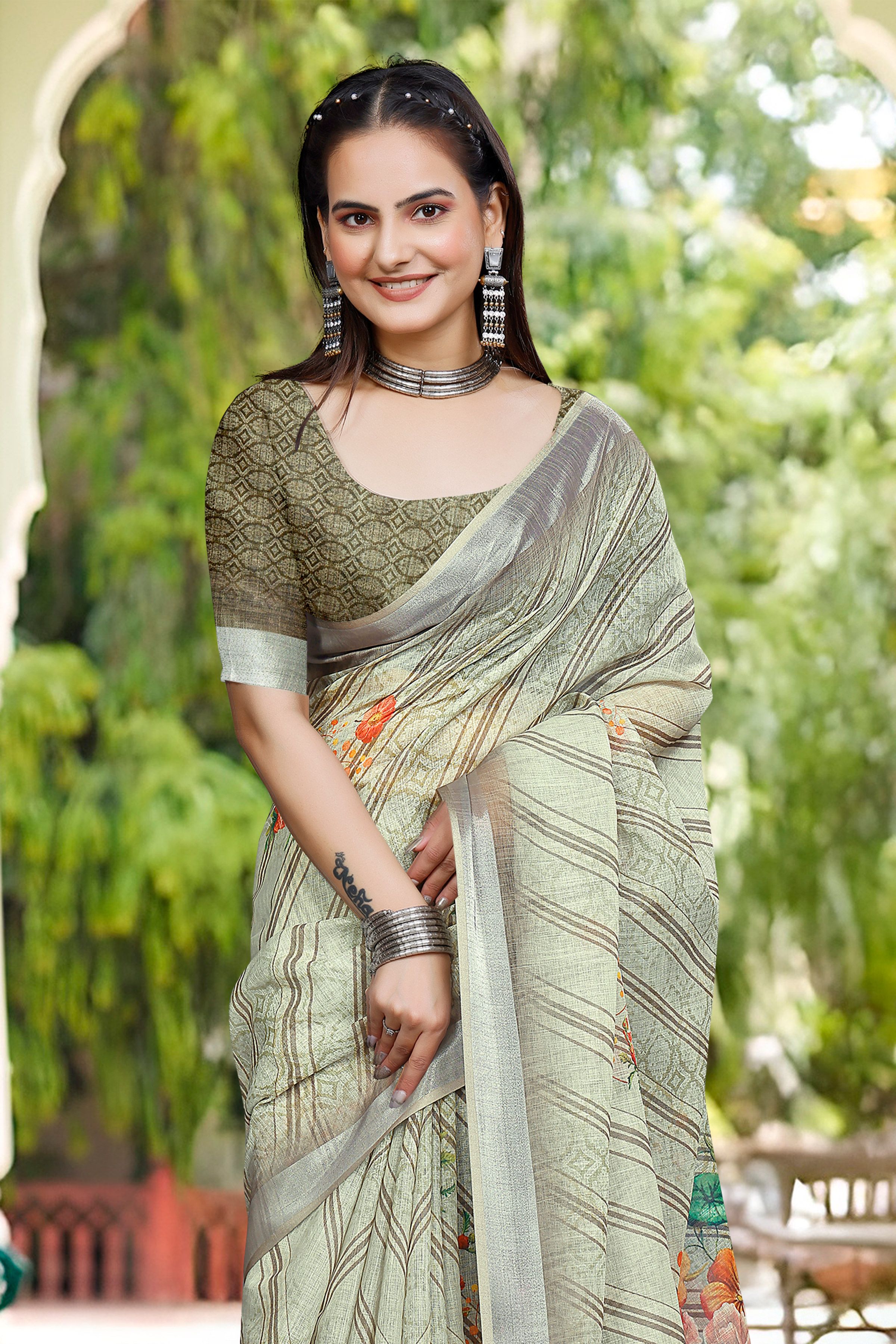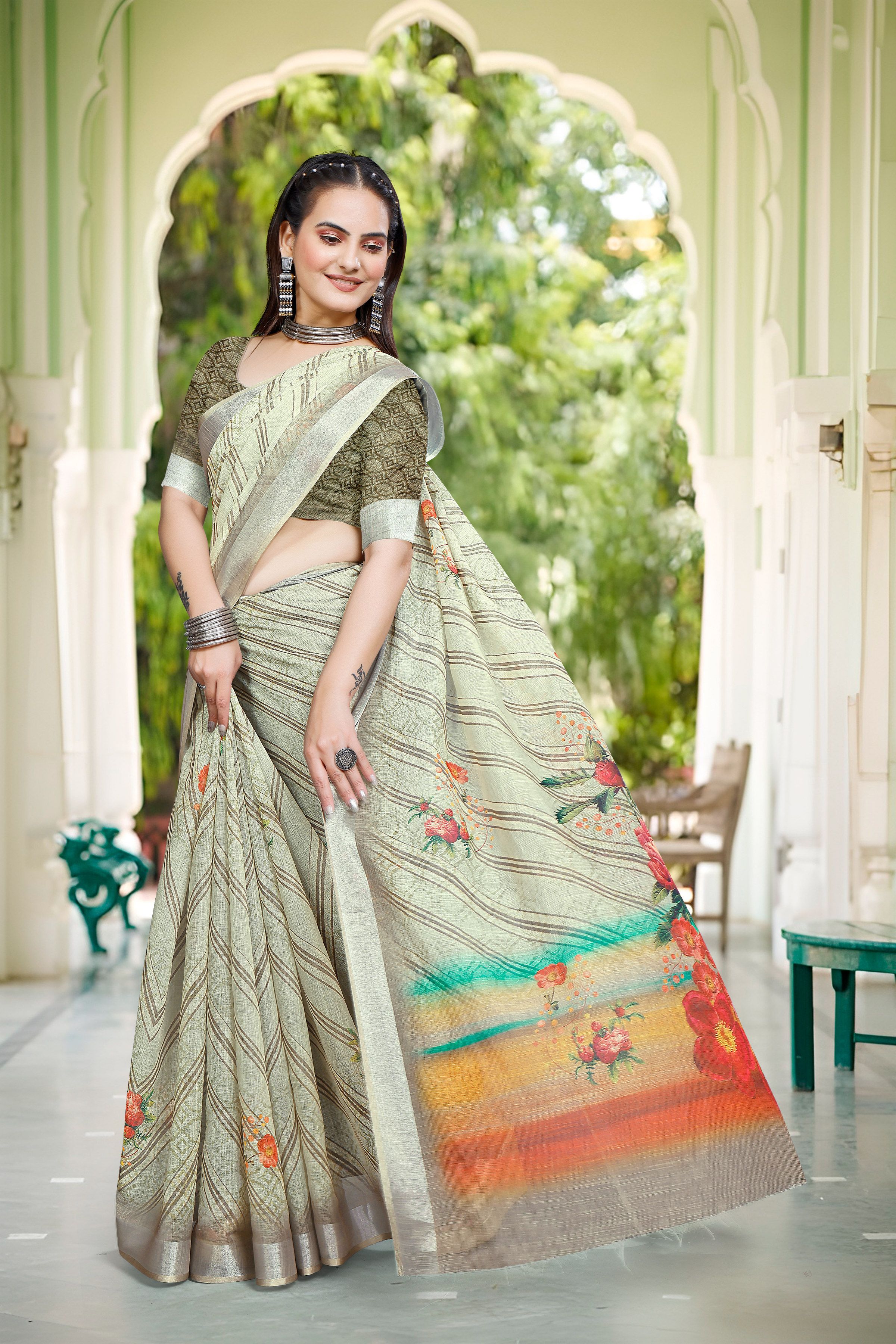 Pista Color Linen Cotton Fabric Woven Border Designer Printed Saree