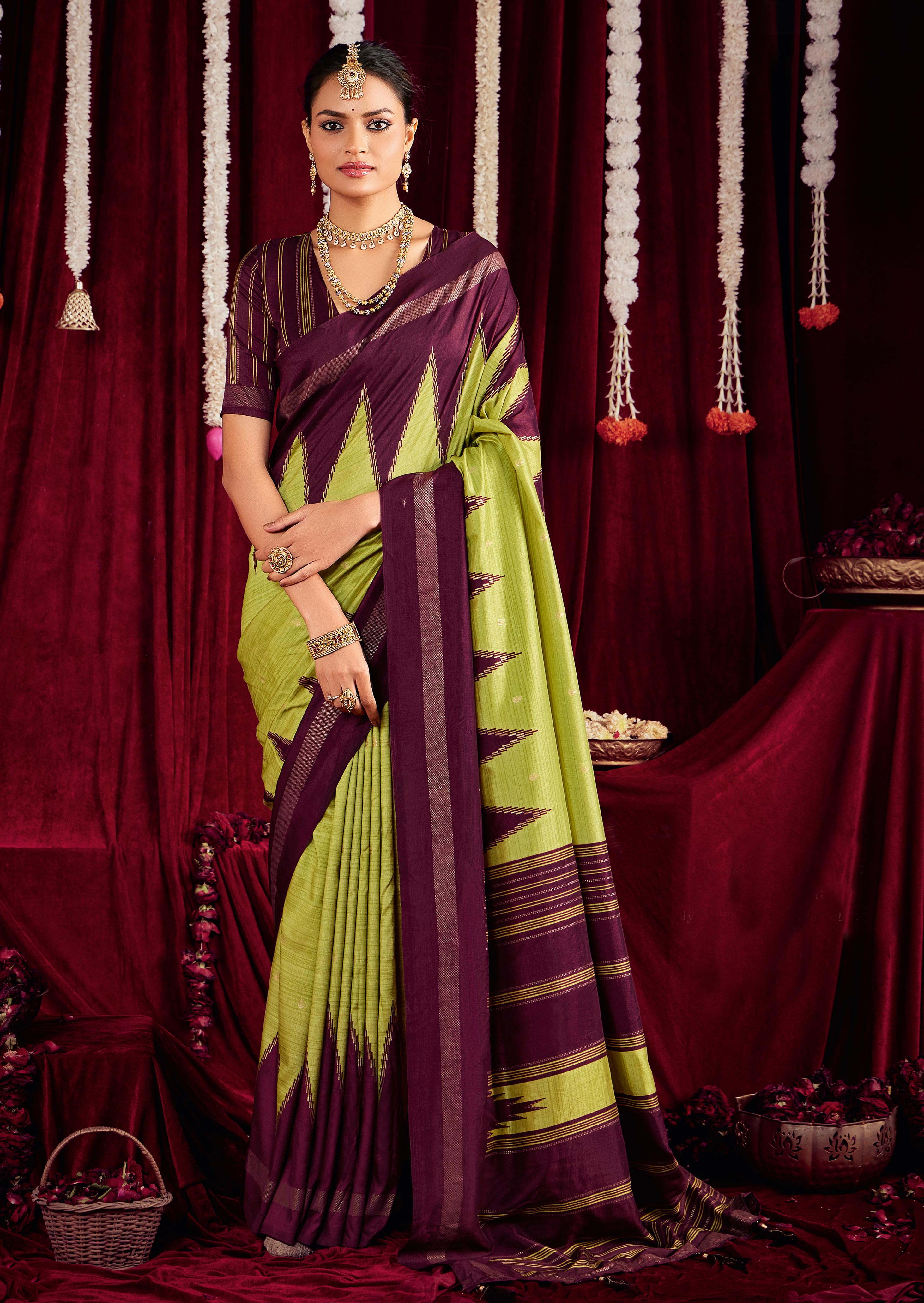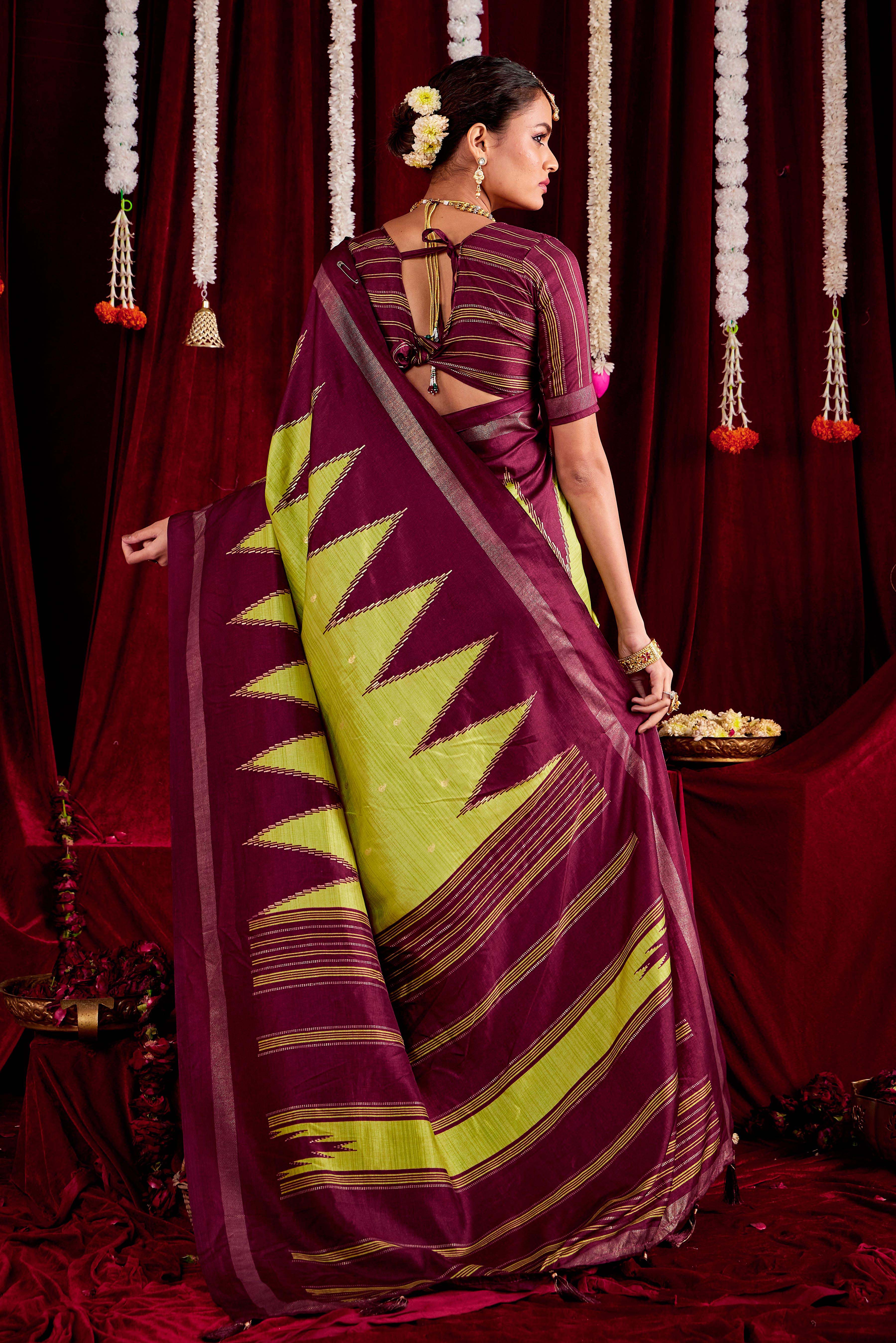Pista Green & Wine Color Ikkat Silk Fabric Designer Zig Zag Printed Traditional Party Looks Saree