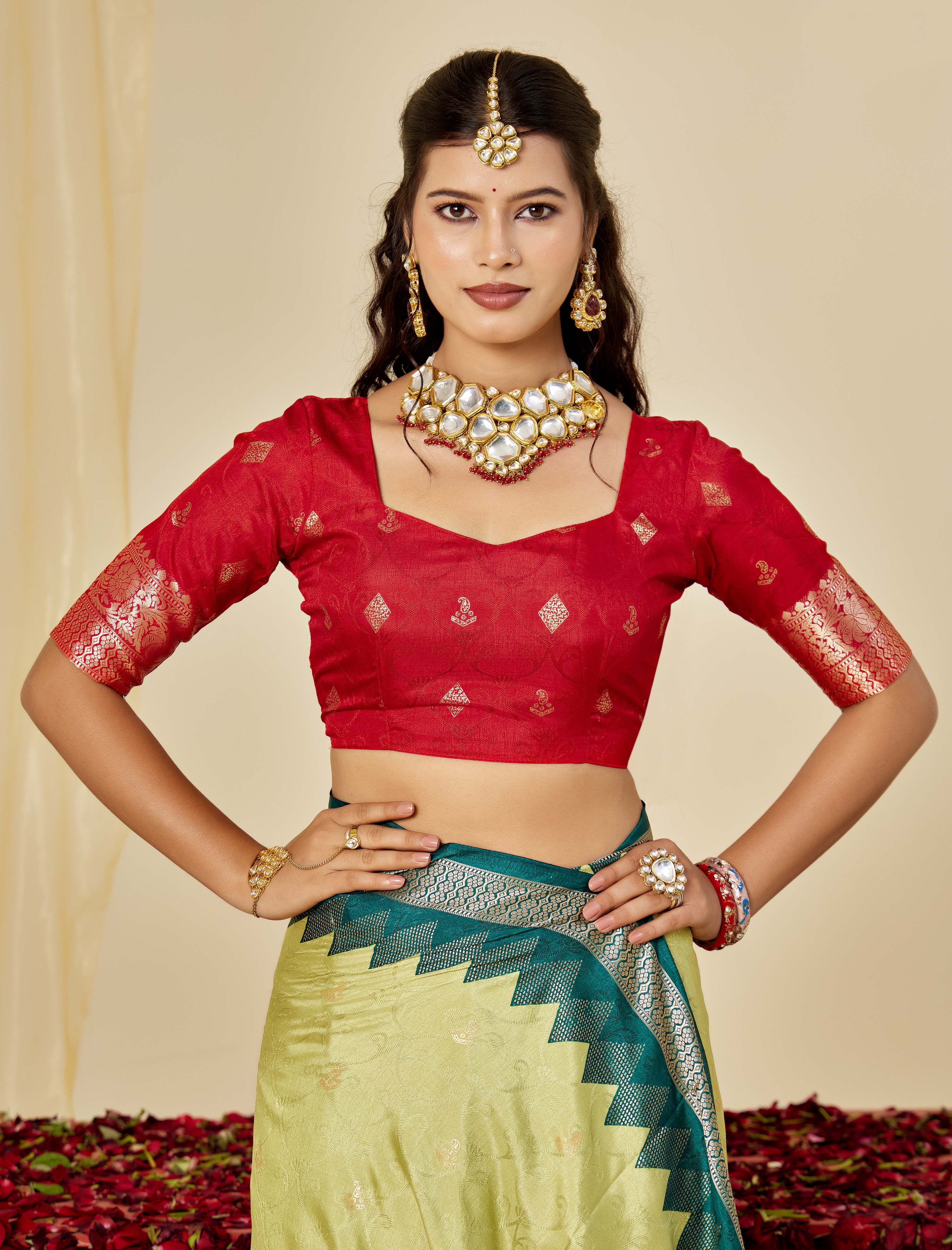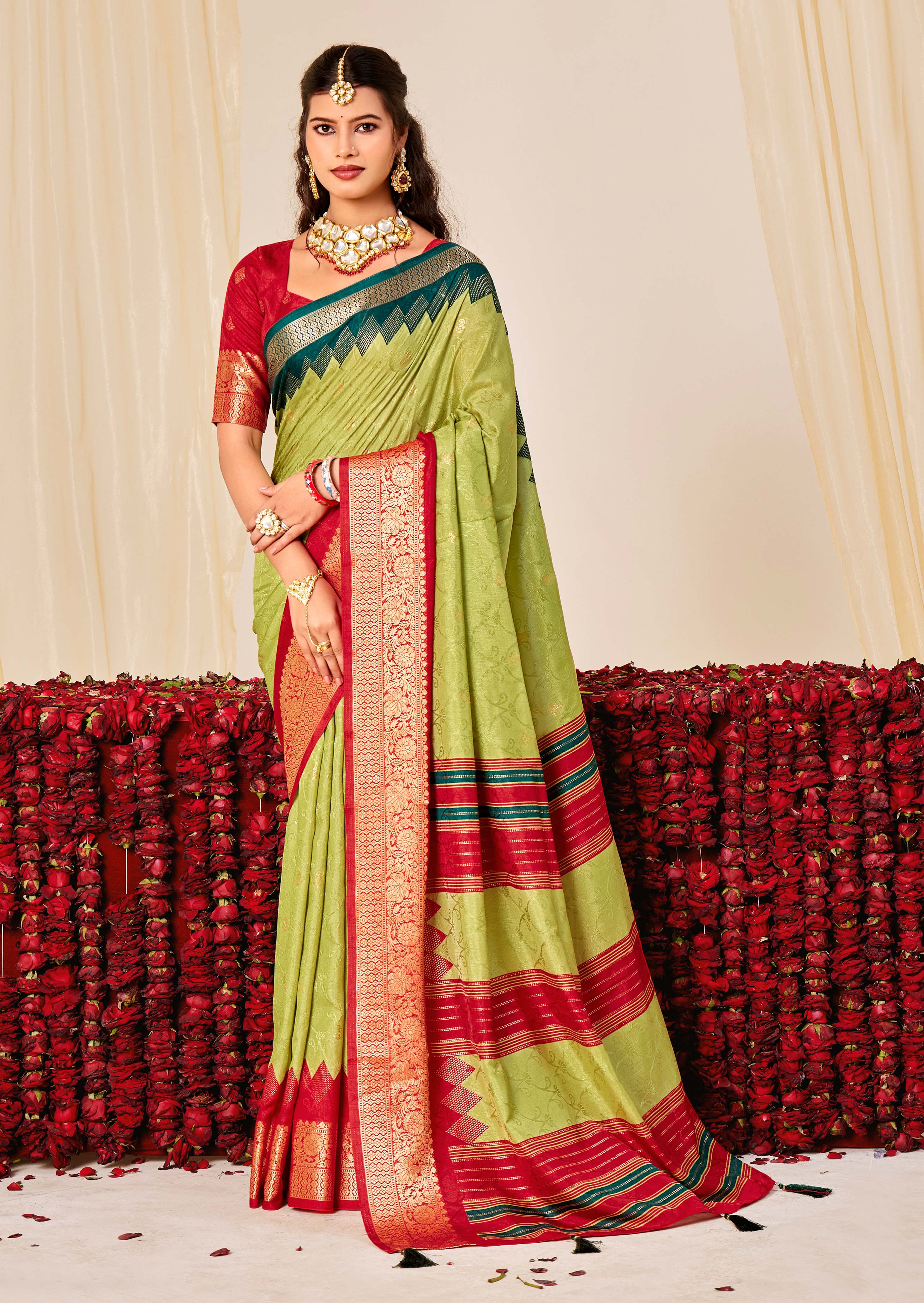 Pista Green Color Velvet Tussar Silk Fabric Woven Saree With Smart Elegant Print