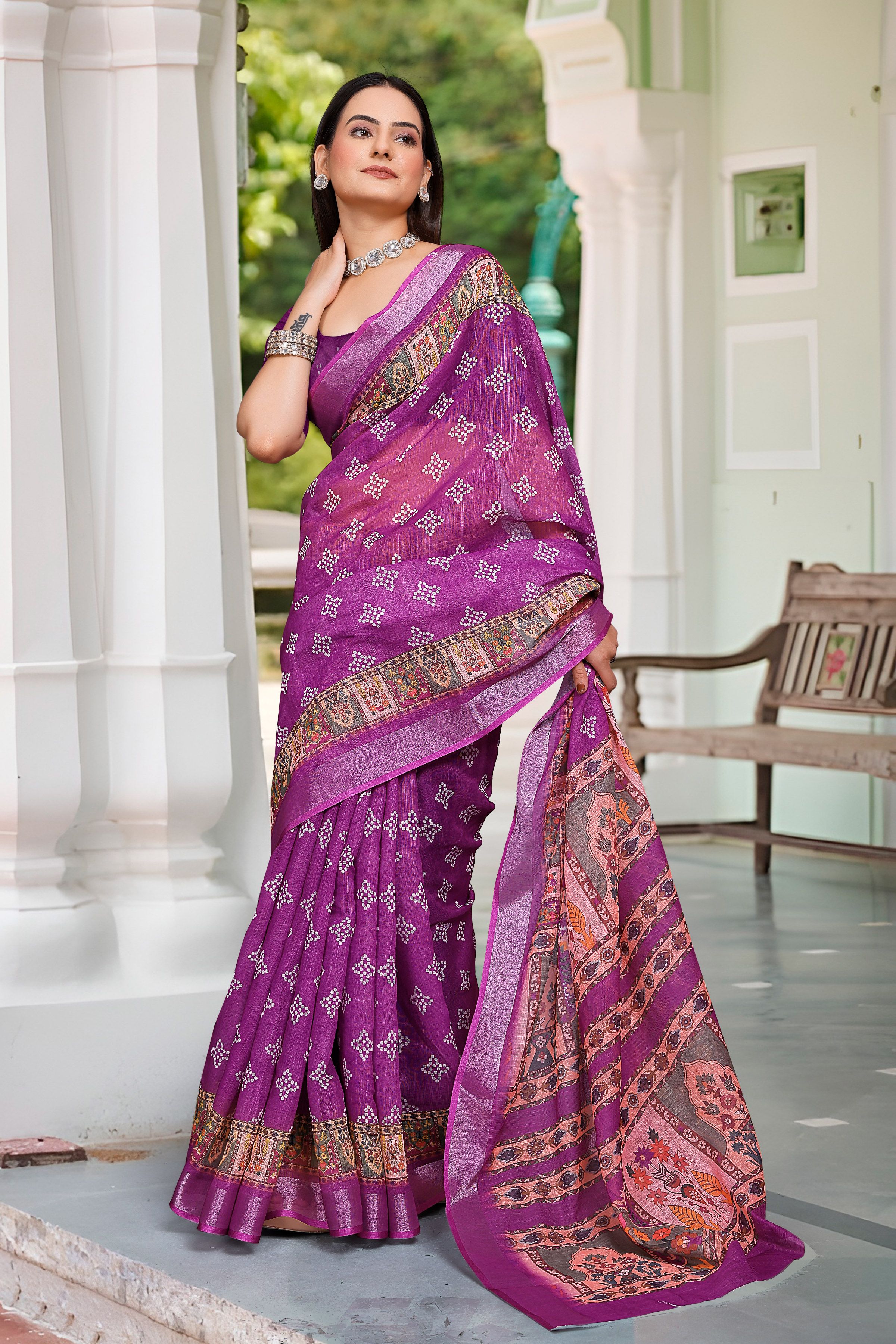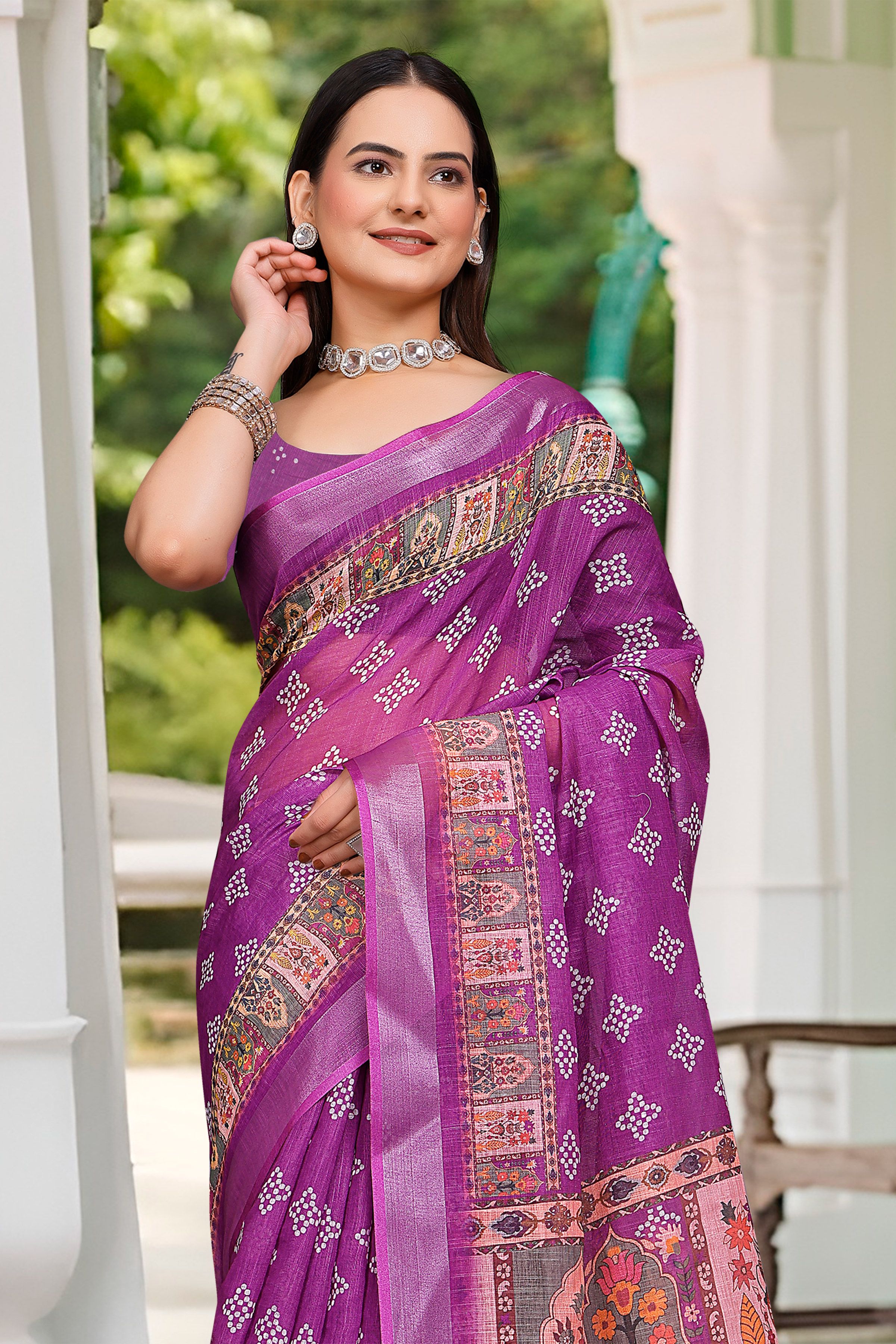 Purple Color Beautiful Designer Printed Saree With Woven Border