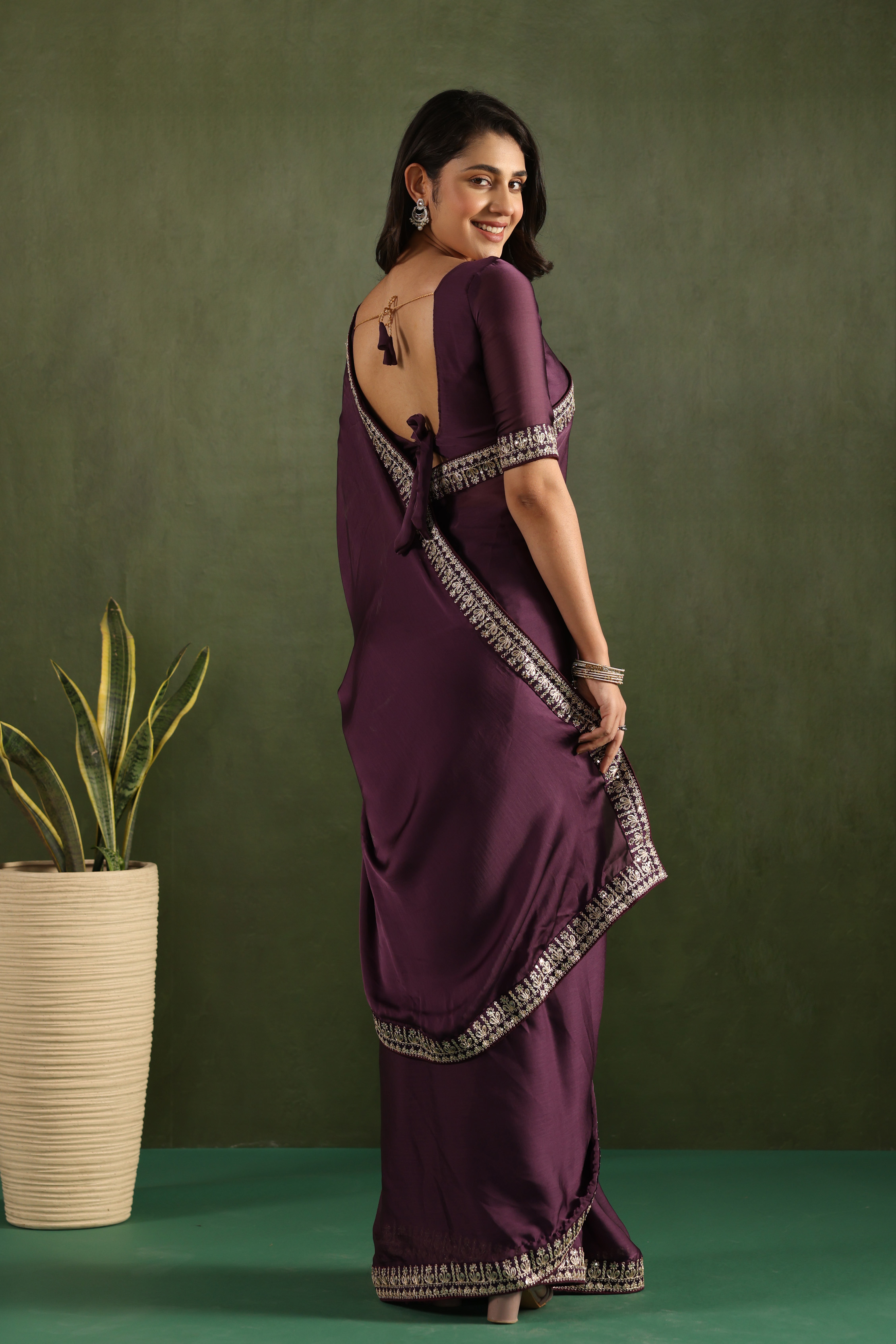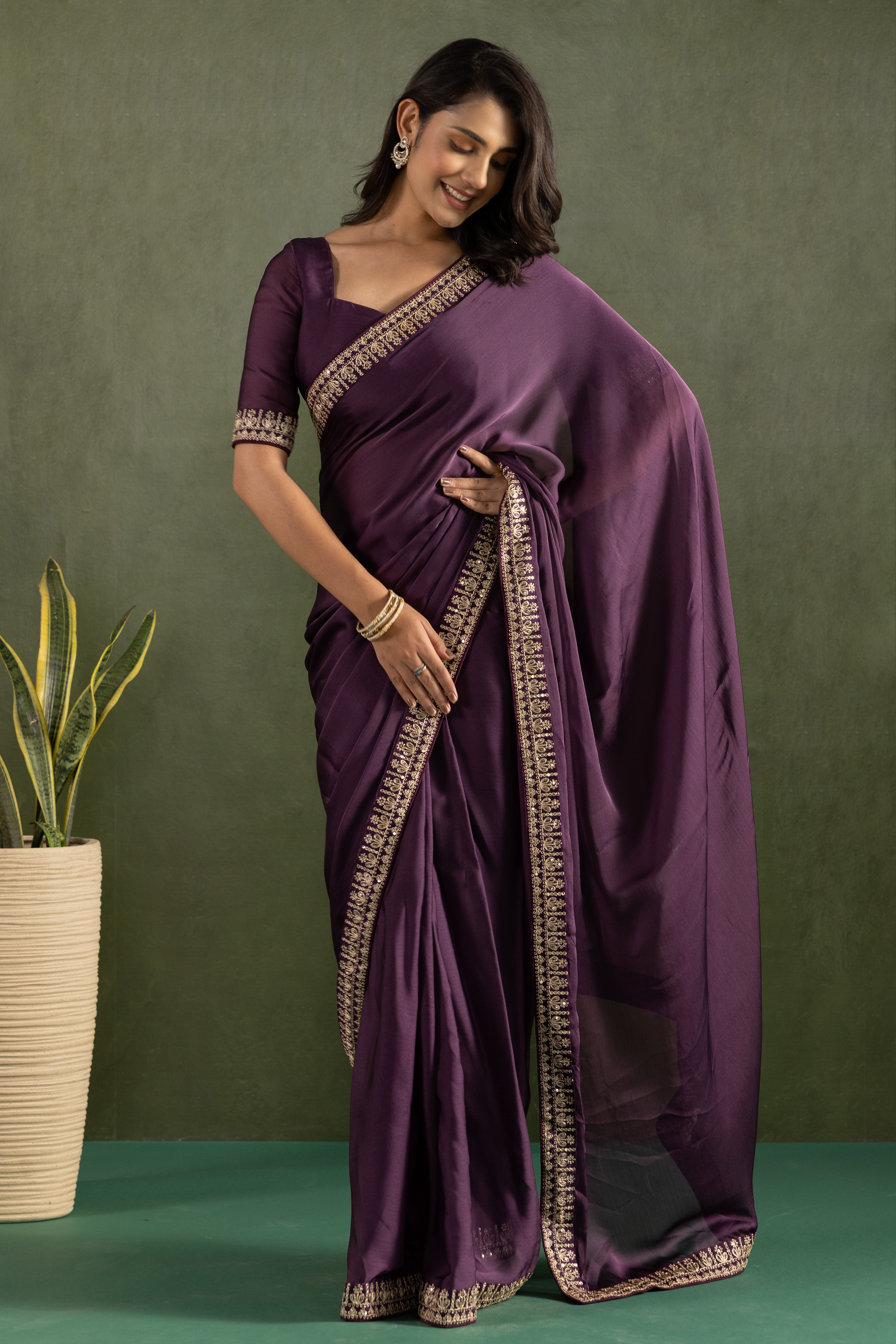 Purple Color Chiffon Fabric Ready To Wear Designer Solid Partywear Saree