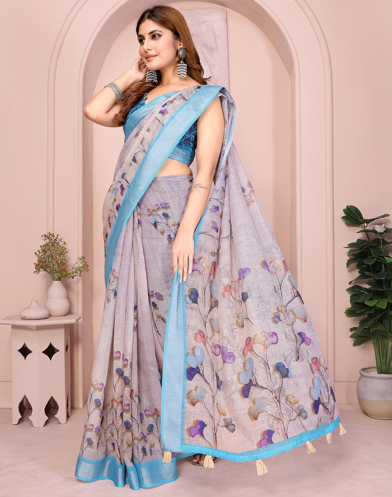 Purple Color Linen Cotton Fabric Designer Printed Formal Looks Sophisticated Saree