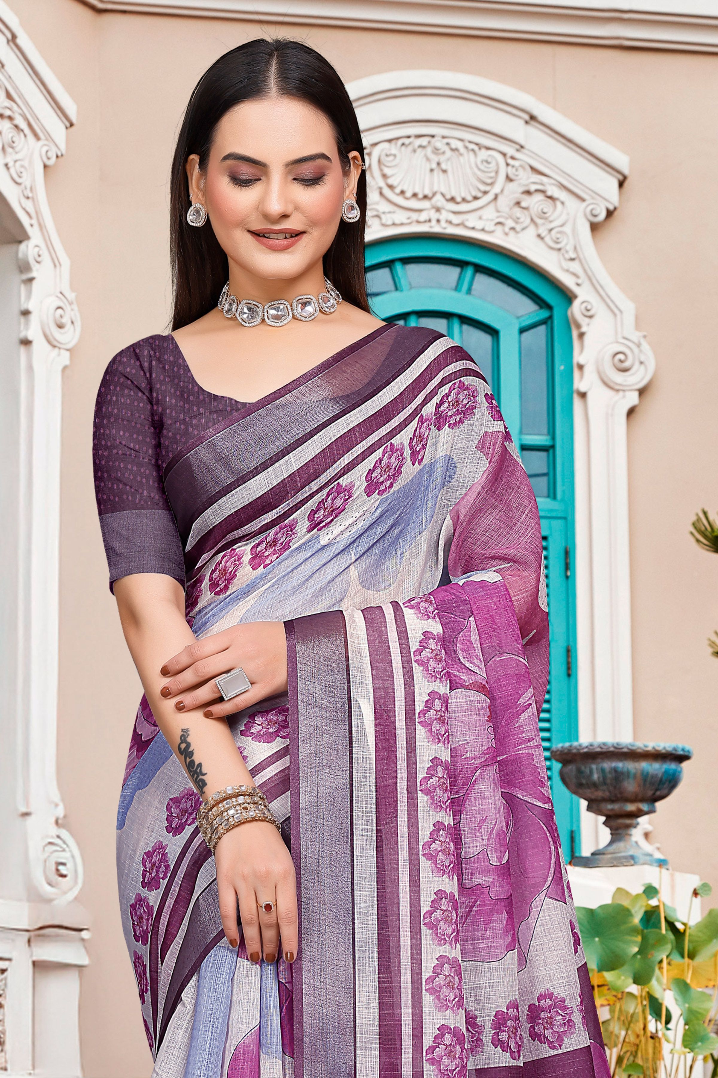 Purple Color Linen Cotton Fabric Woven Border Designer Printed Saree