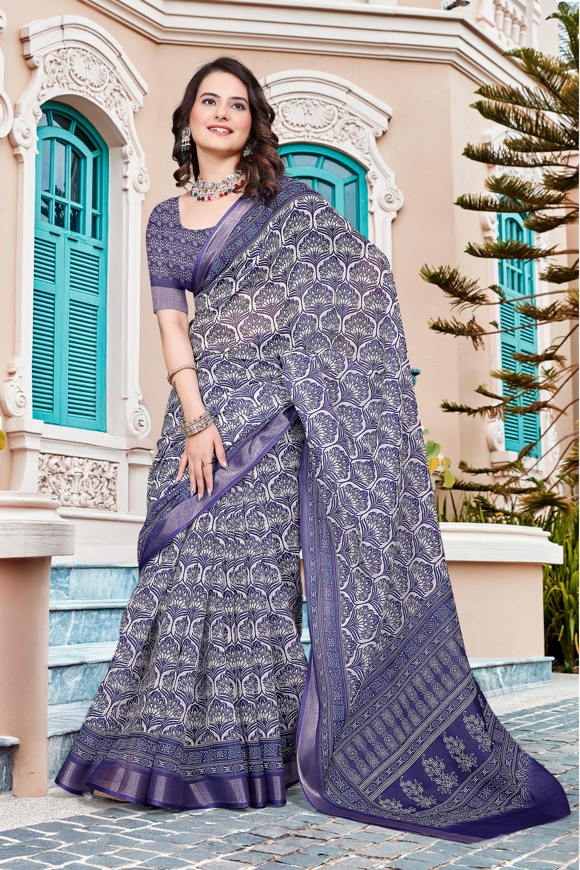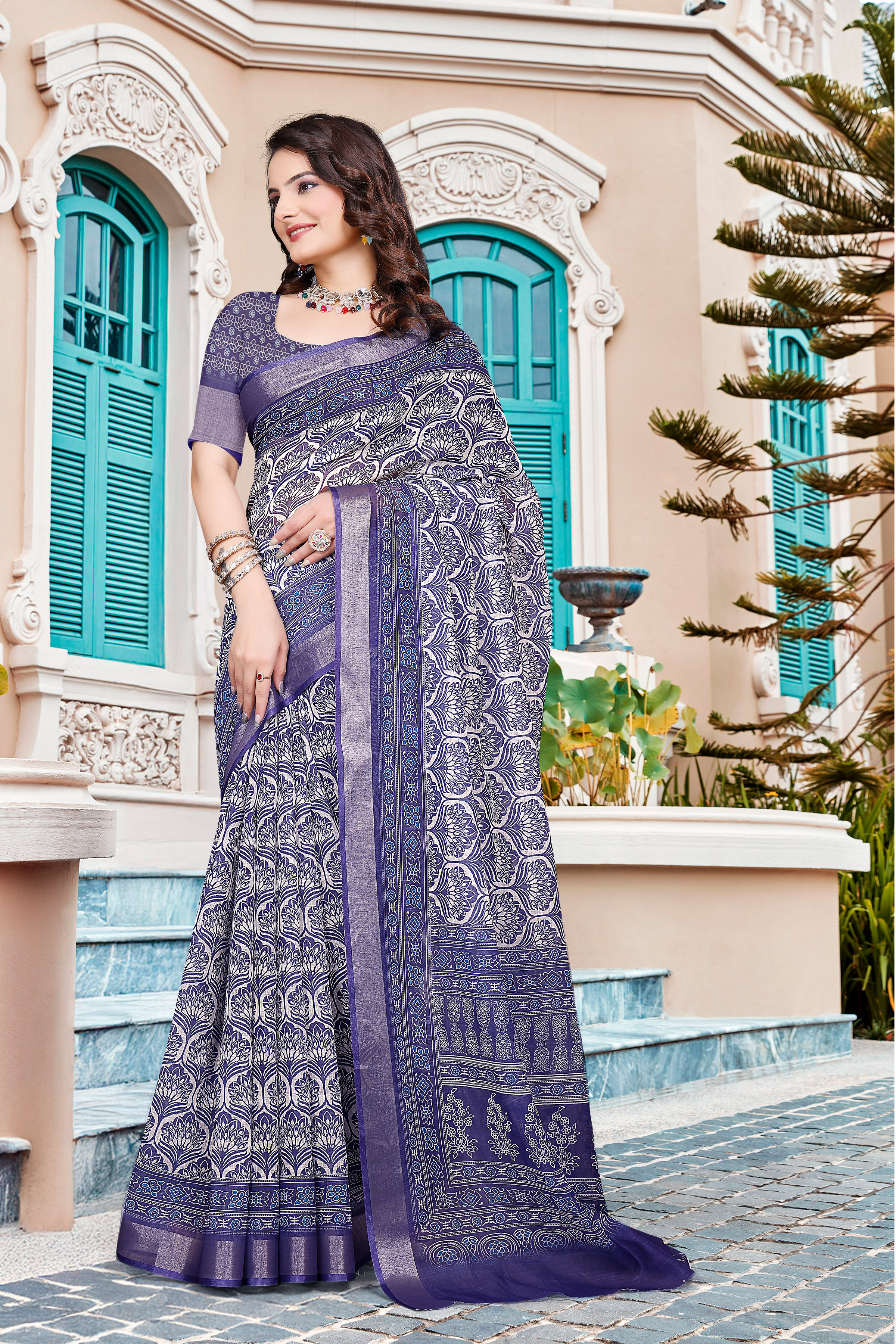 Purple Color Linen Cotton Saree With Smart Partywear Printed Looks