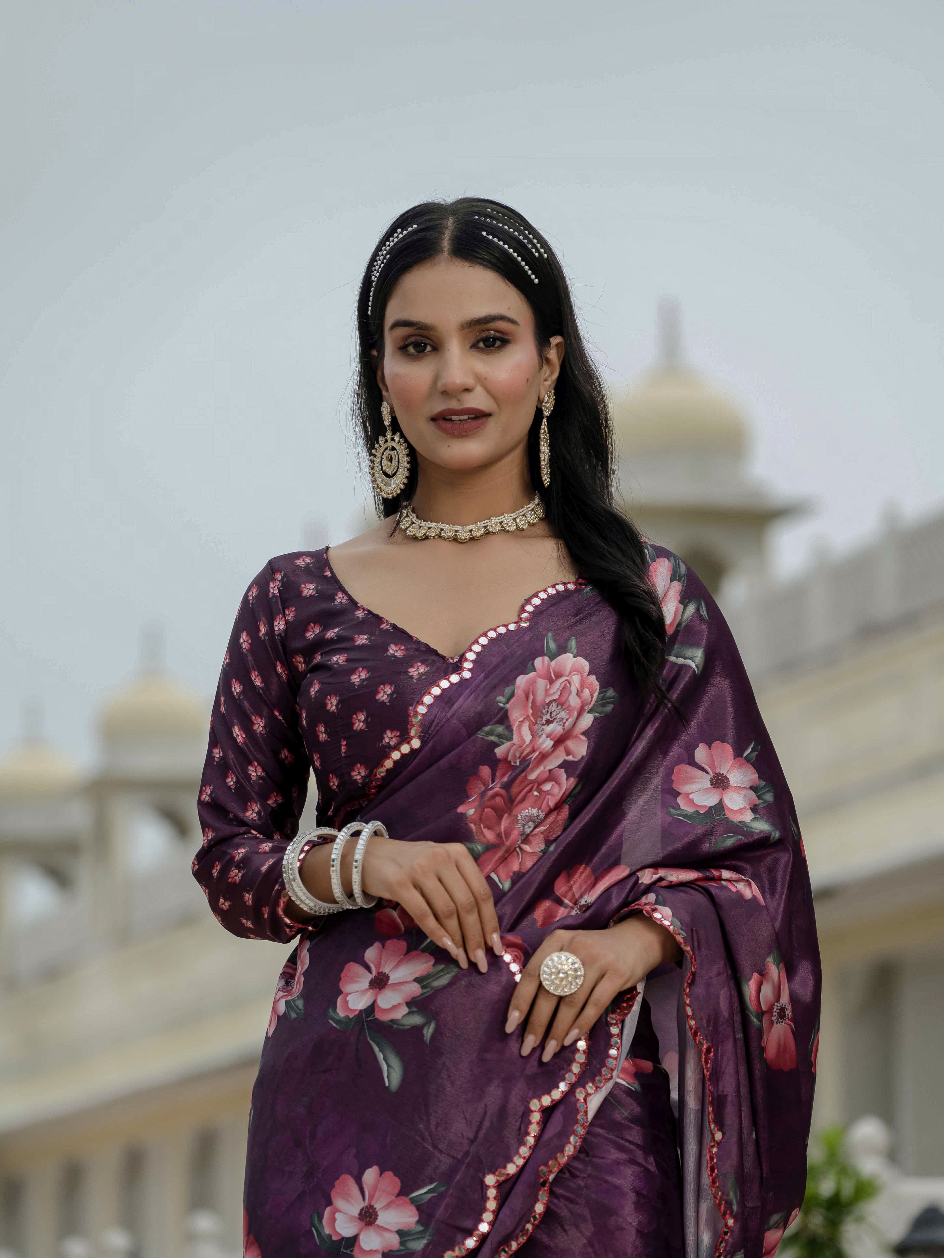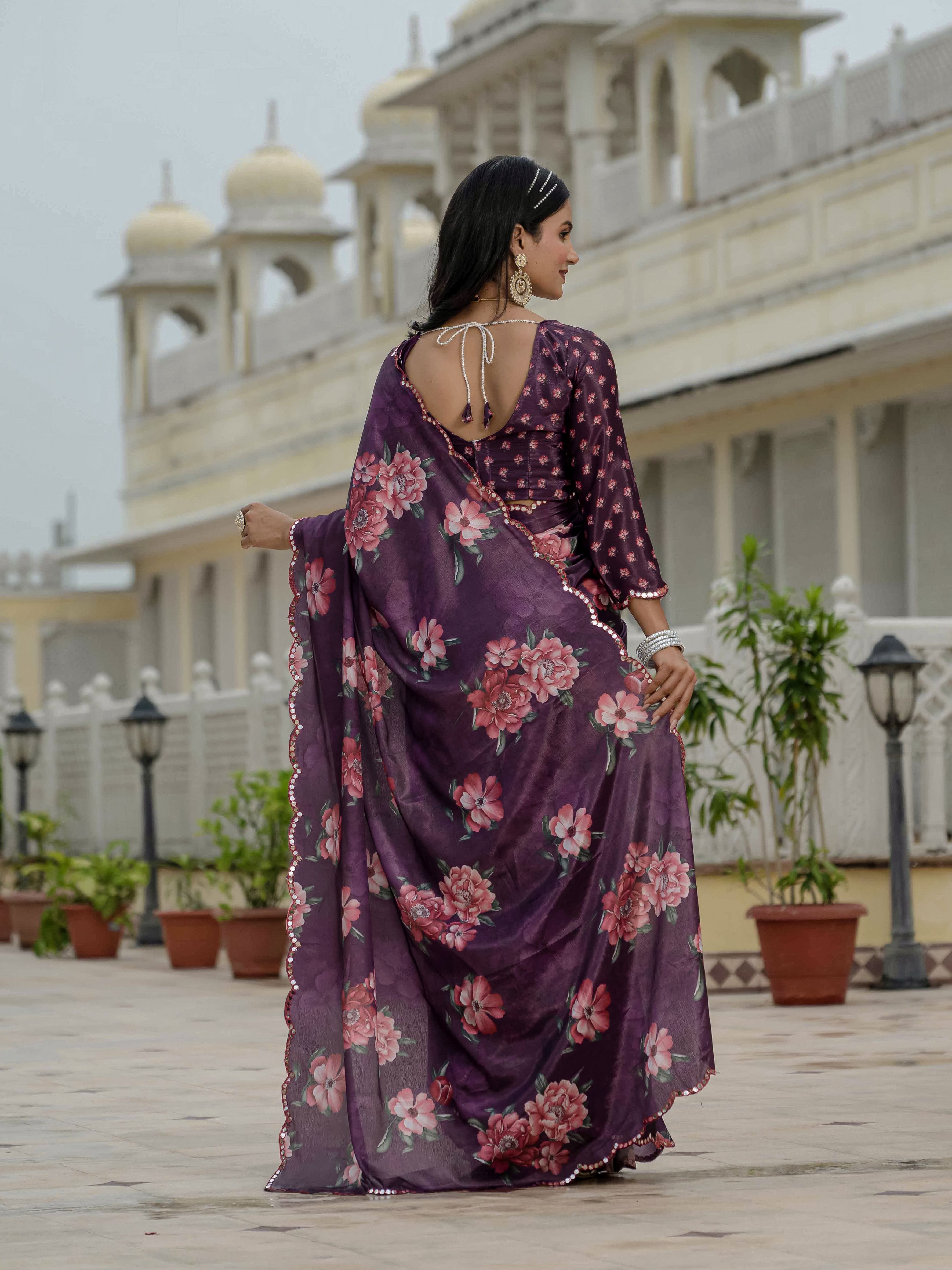 Purple Color Stylish Ready To Wear Chinon Fabric Partywear Saree