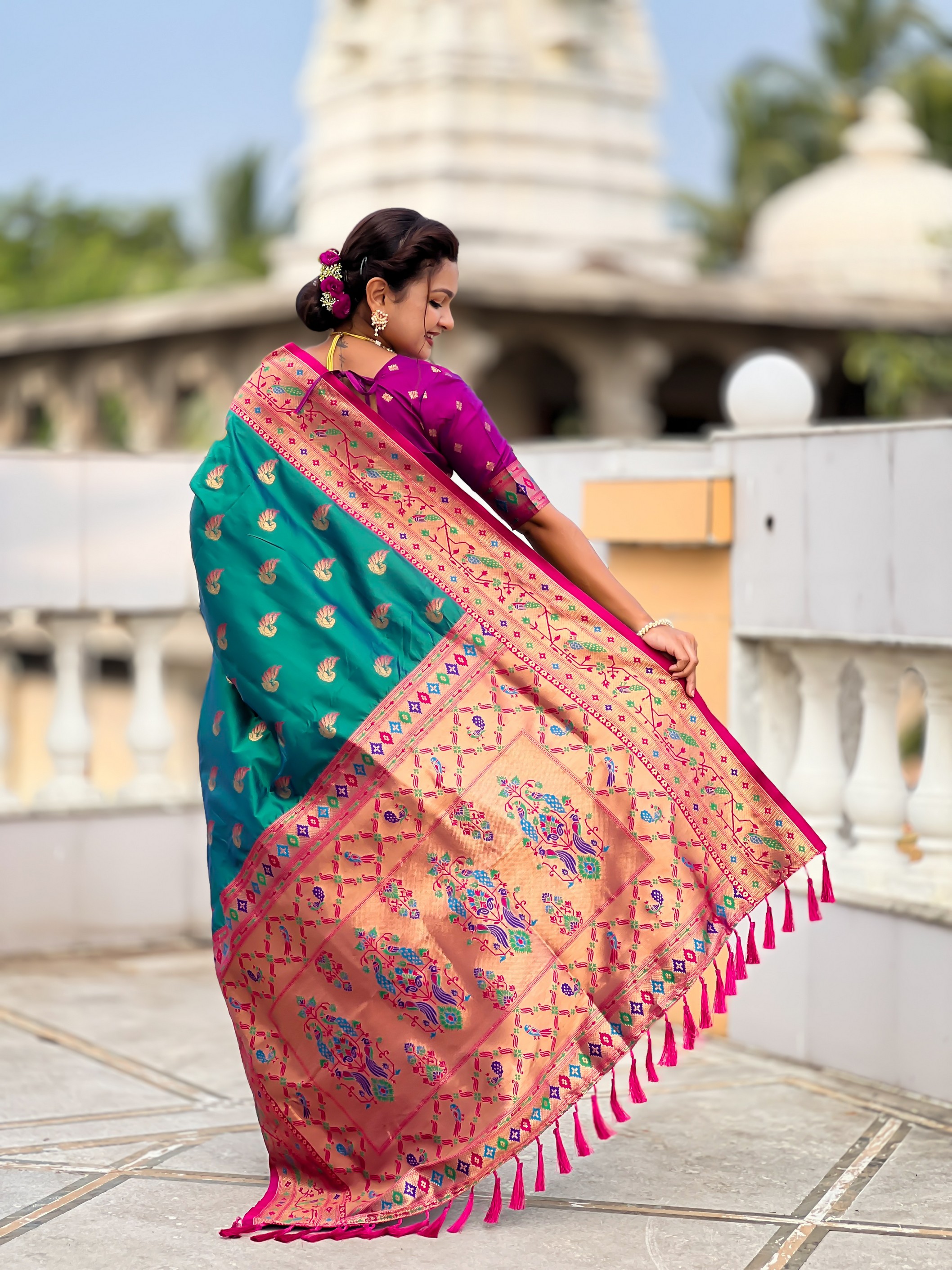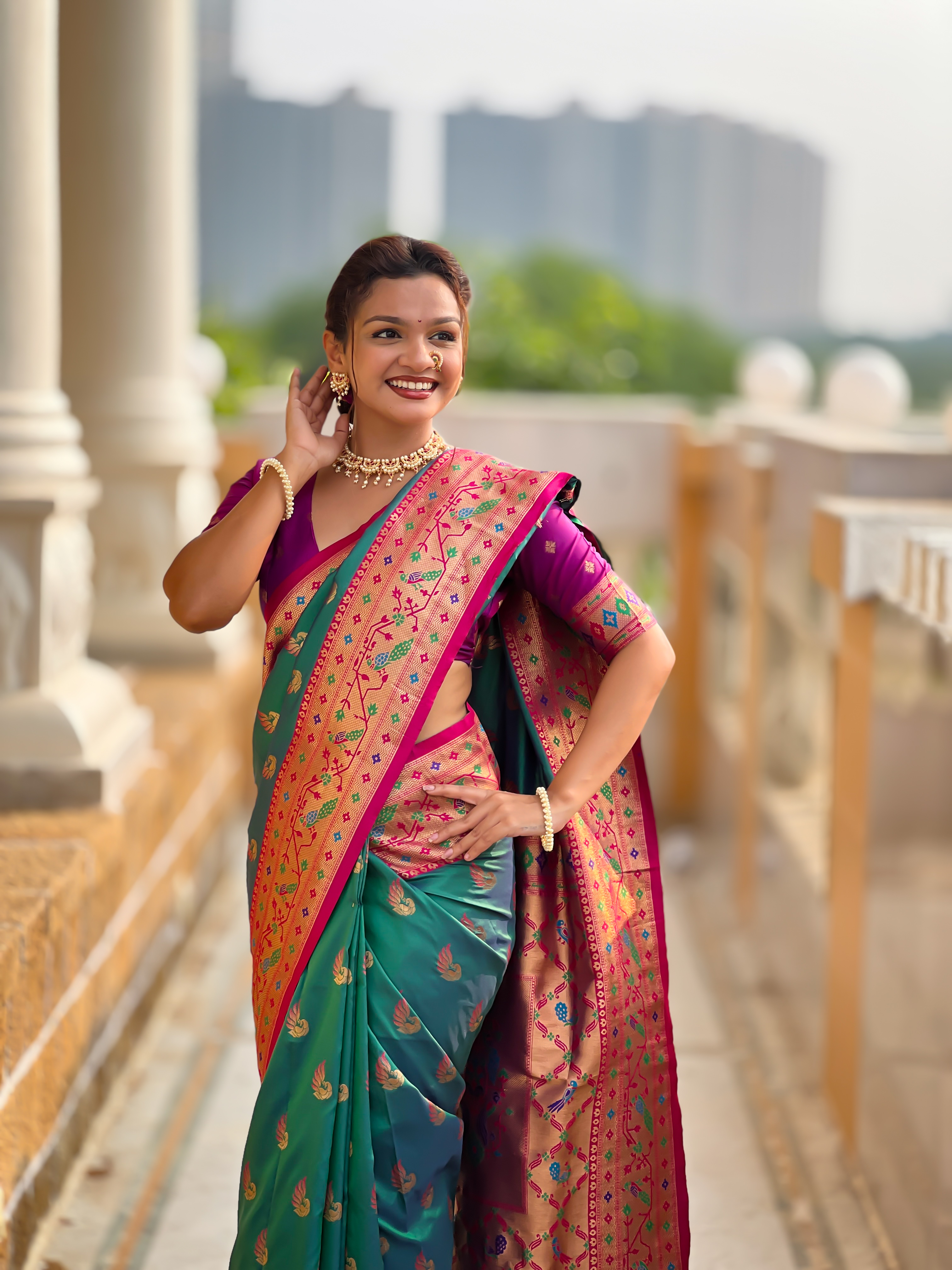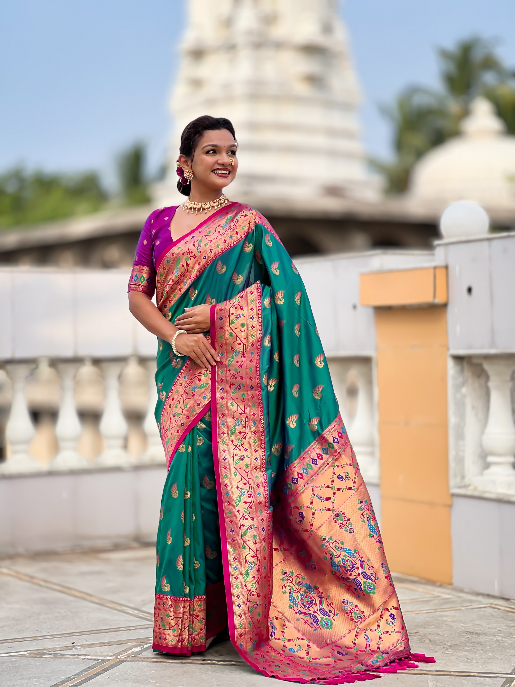 Rama Color Paithani Silk Woven Meenakari Jacquard Designer Saree
