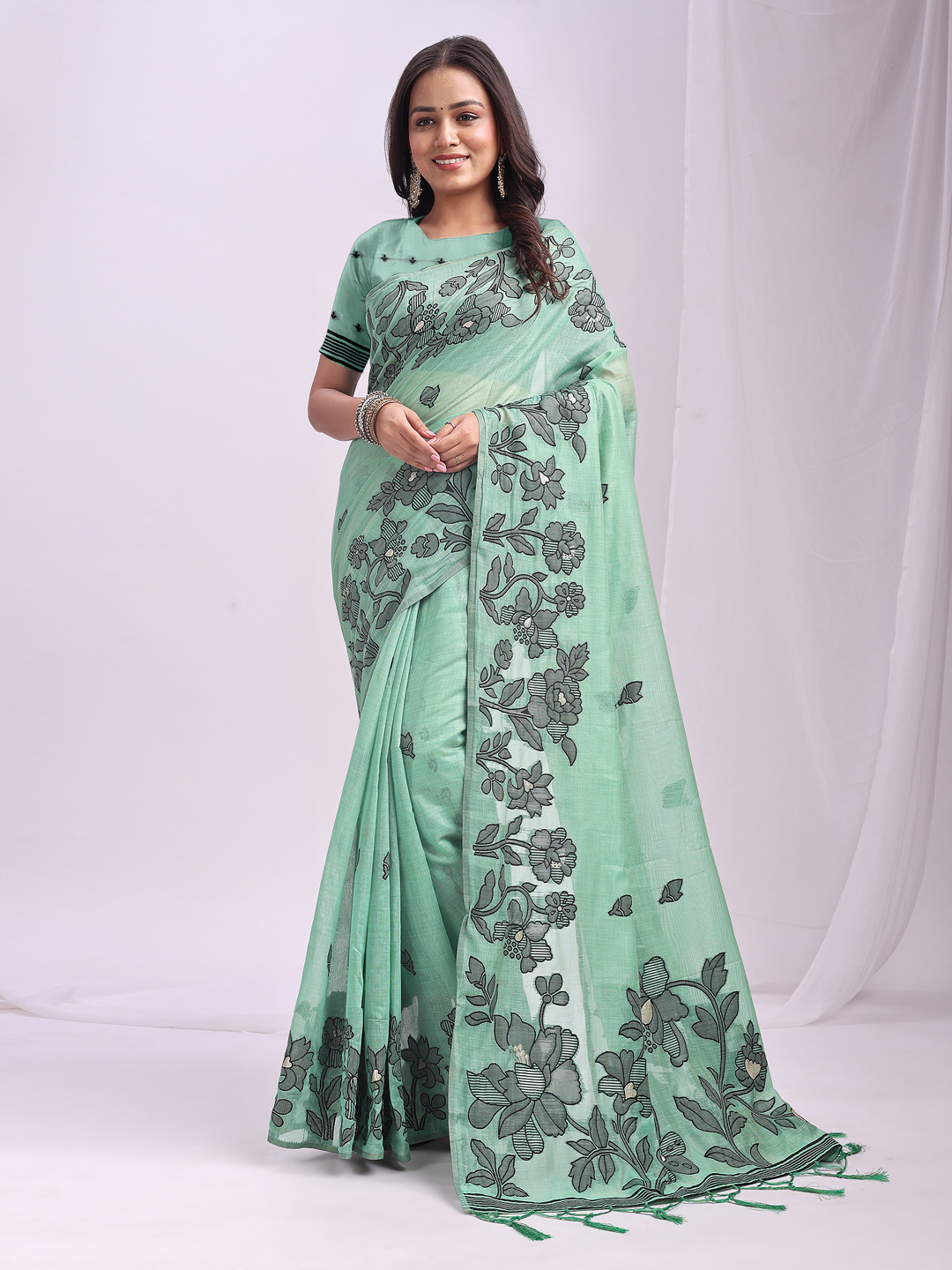 Rama Green Color Linen Cotton Fabric Wevon Thread Designer Festive Sophisticated Saree